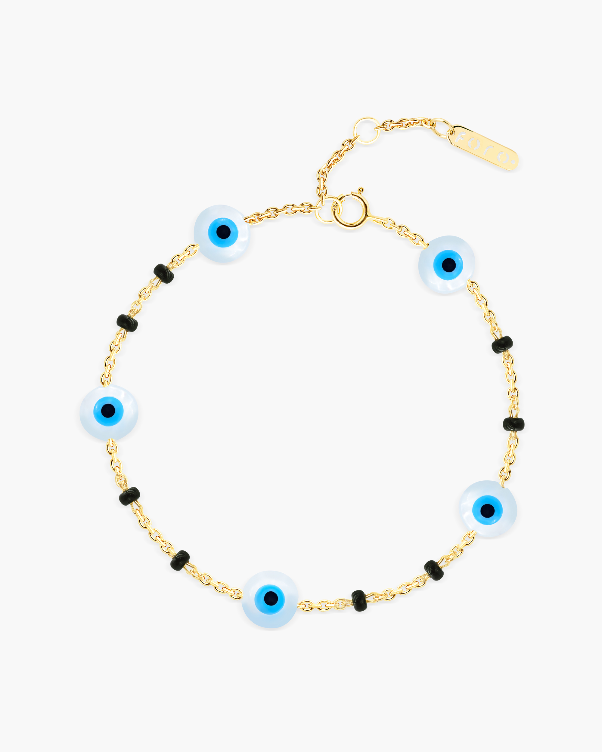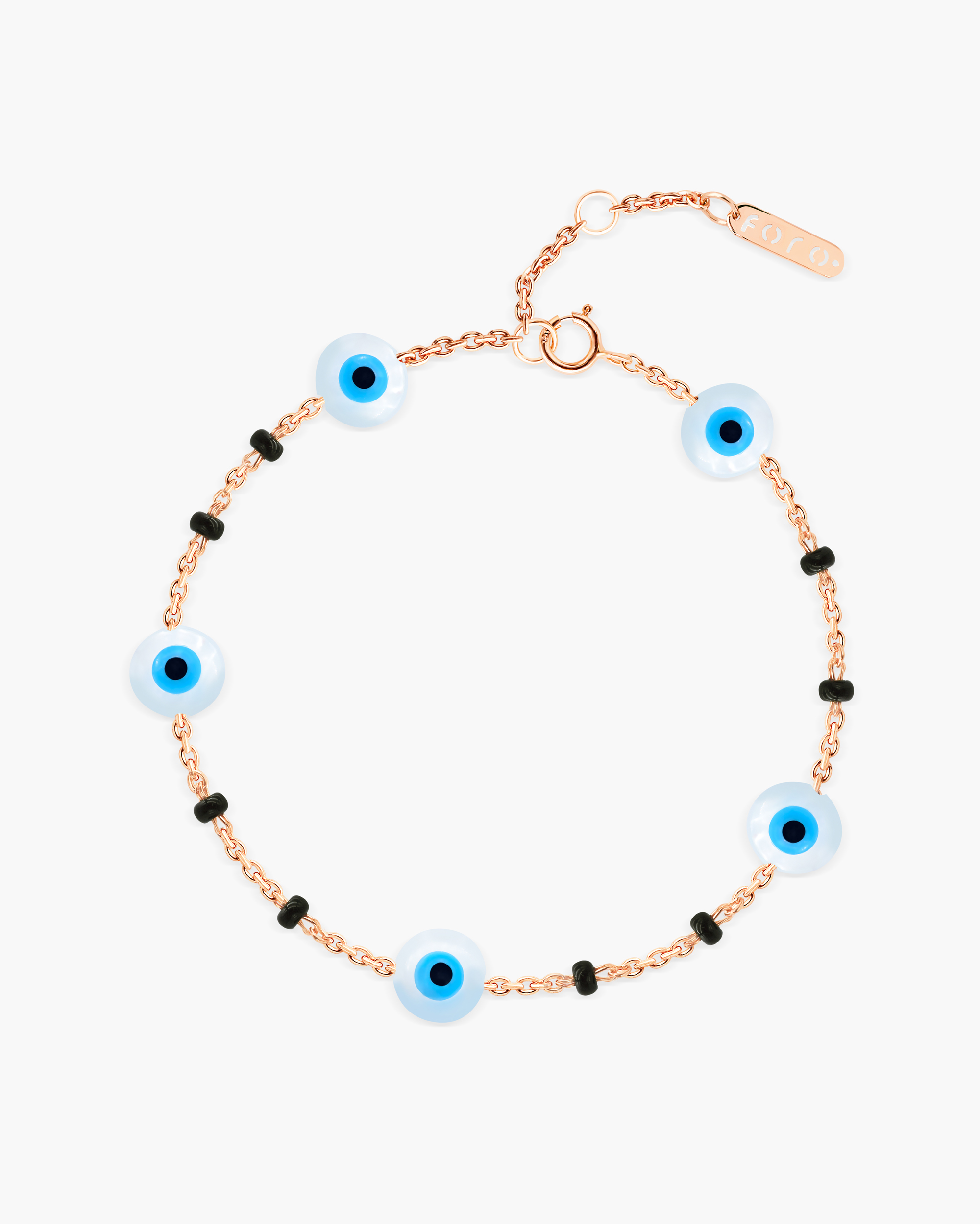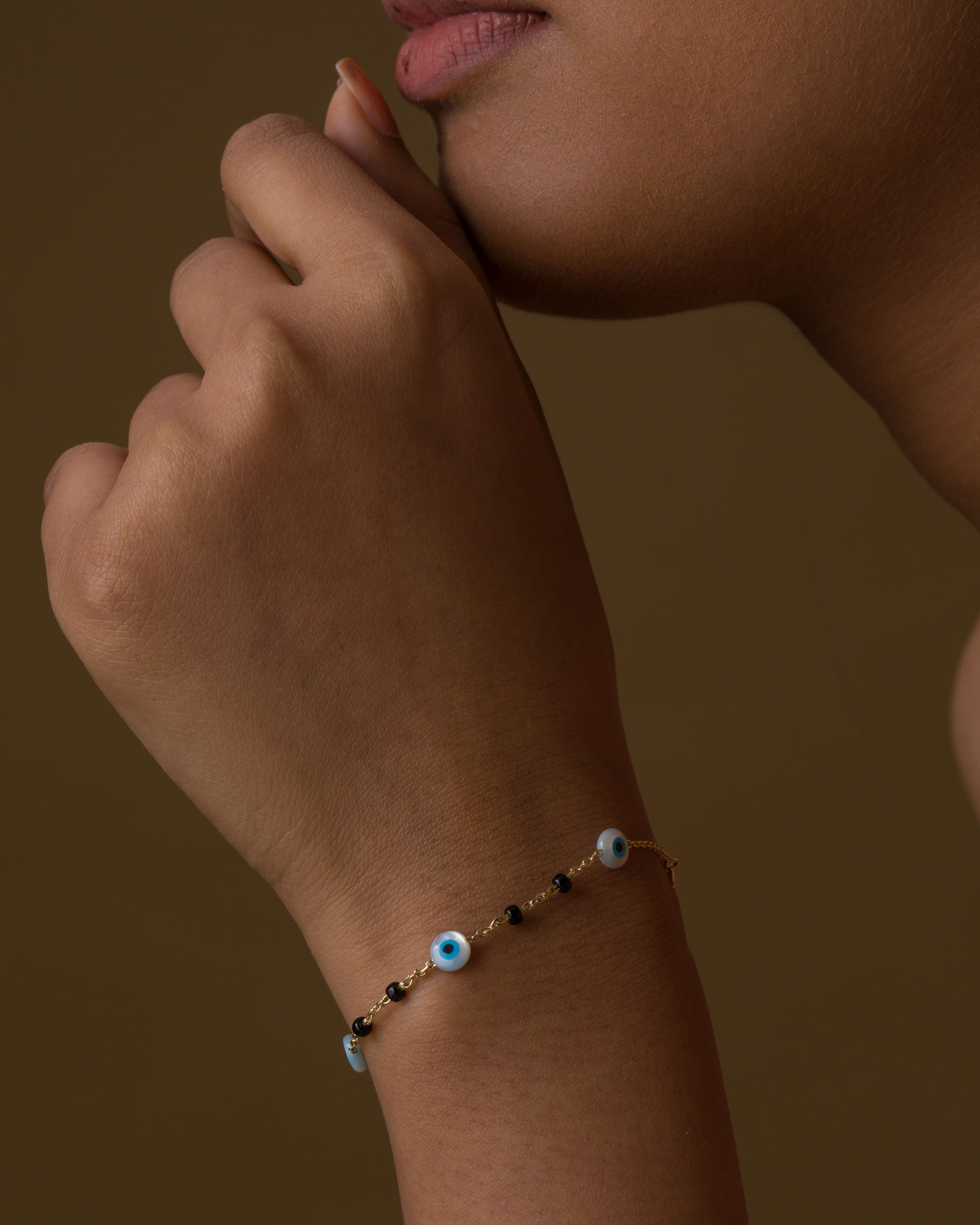 This Evil Eye Stations Bracelet can be a protective amulet for your Sister , Friend, Wife. This delicate 18k gold bracelet with circular cut evil eye stations and tiny black beads makes it a stunning accessory to be gifted. Wear it as part of a stack or on its own, this piece will work either ways. The bracelet is secured by a spring ring which allows you to adjust the length by 1/2″ + or – the ordered size.