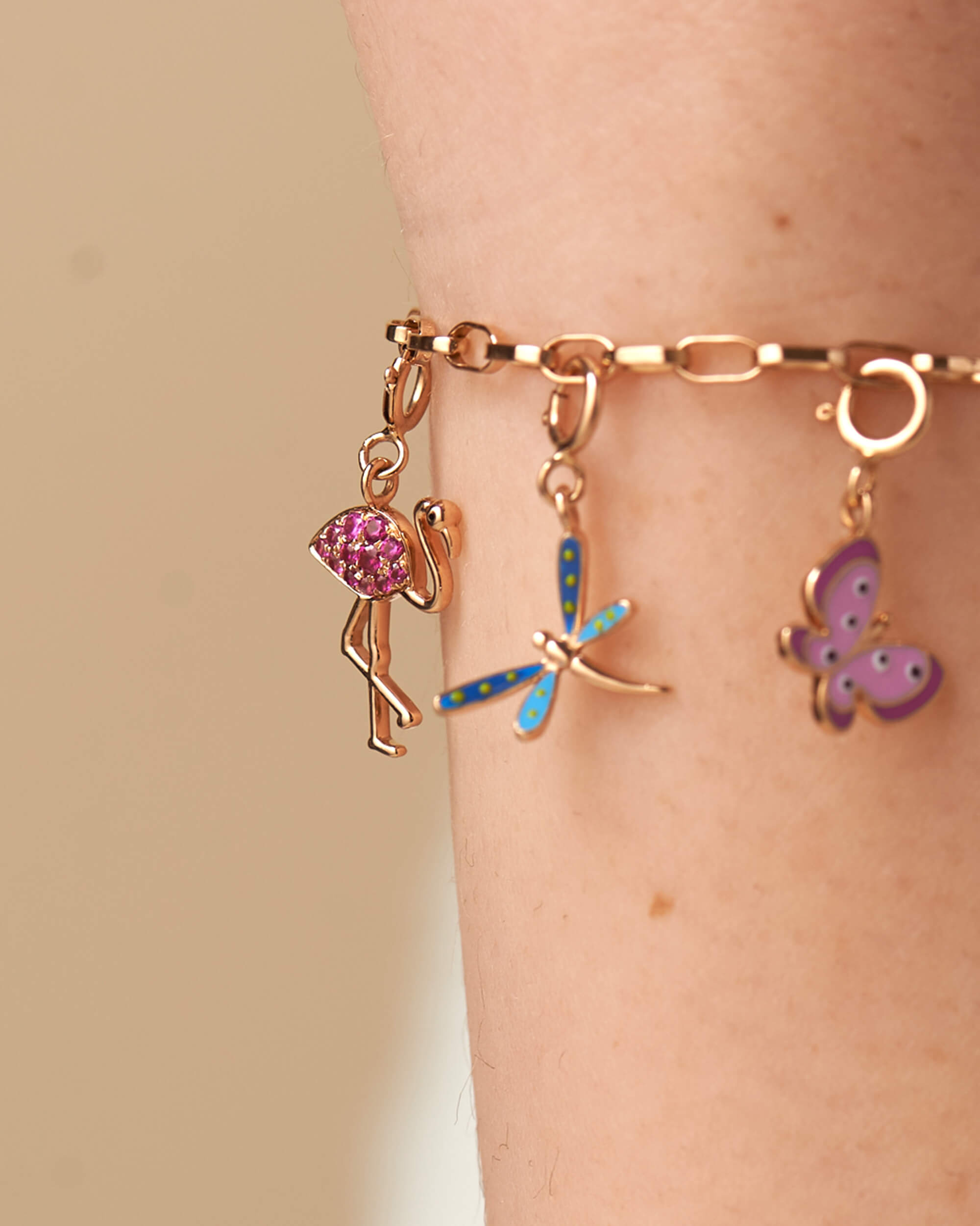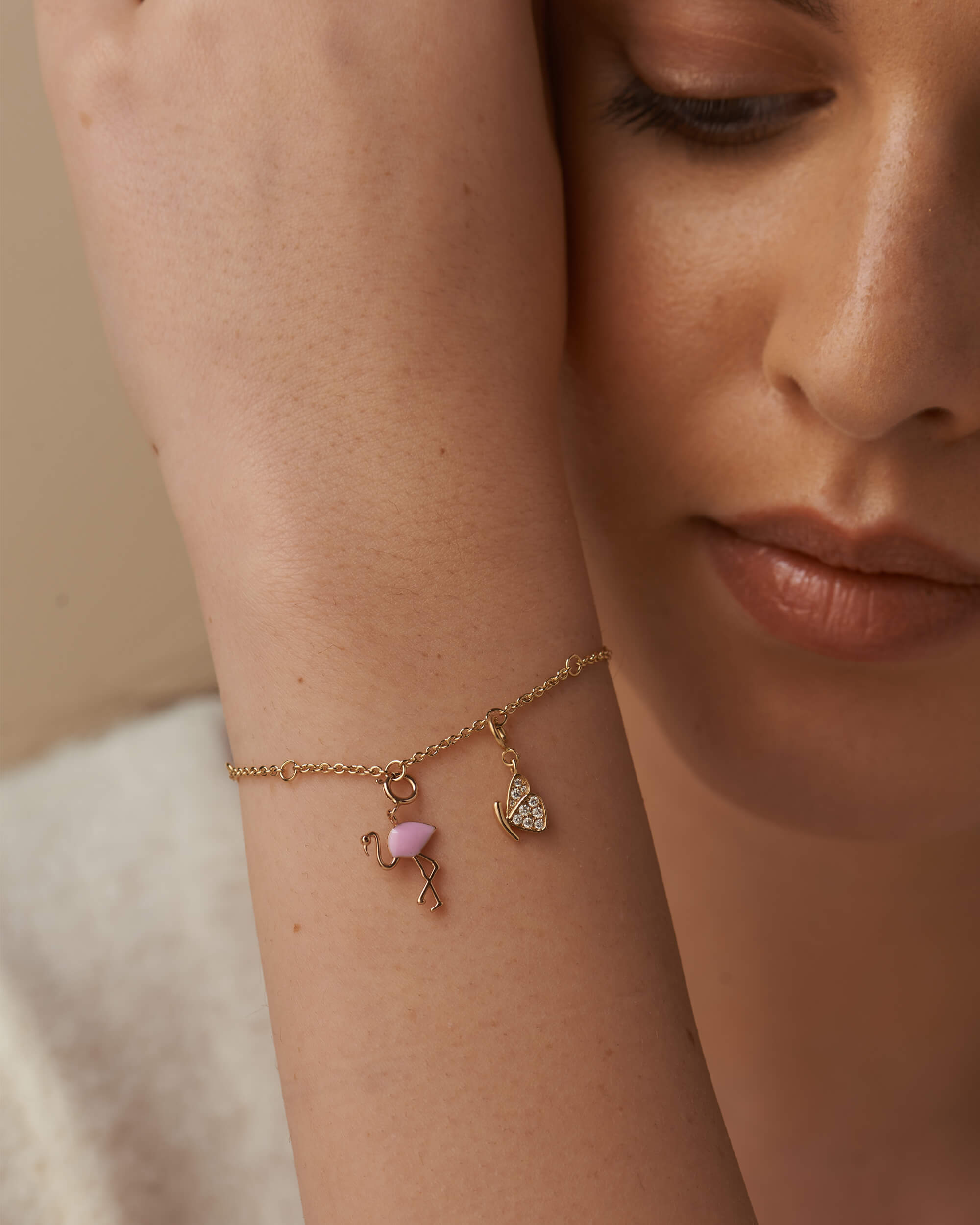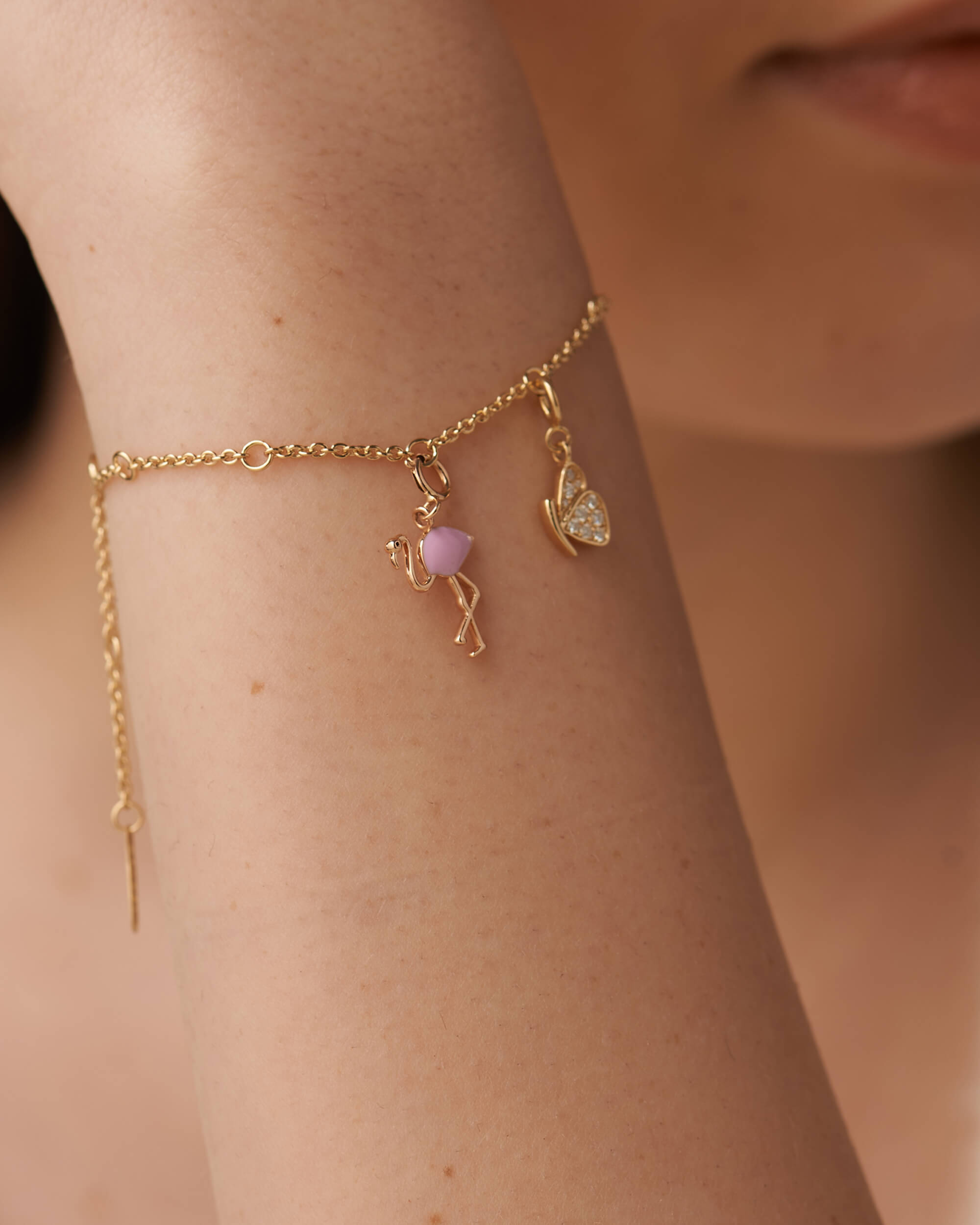 Elegantly crafted is this Flamingo Charm/ Pendant , wear it to express a side of you and as a reminder of your serene self. Handcrafted in solid gold and pink coloured synthetic gemstones on one side and pink enamel on the other side.