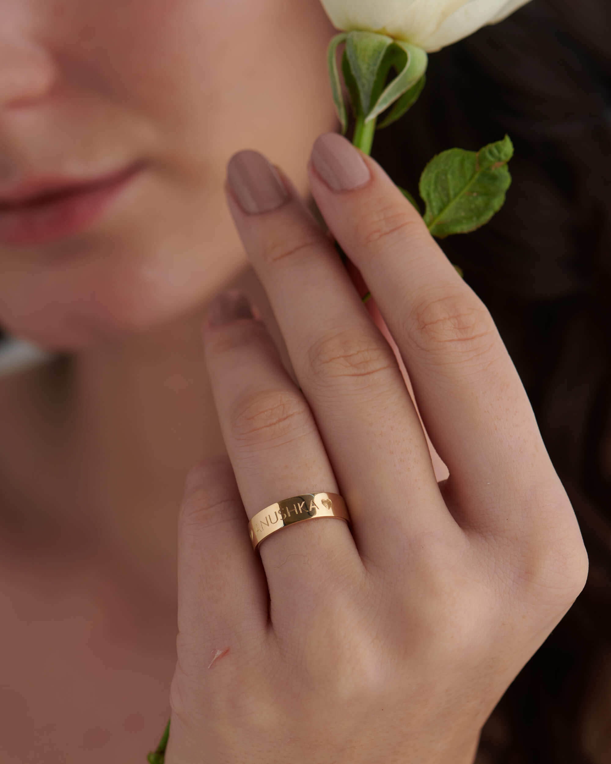 A symbol to show love, commitments or to celebrate friendship. Our engravable rings can be customised to be worn as engagement rings or modern wedding bands. Have your ring inscribed with a name, meaningful text, coordinates, or a date that you hold special, either the inside or the outside of this ring. Handcrafted in solid gold and with high polish finish, perfect for everyday wear.
