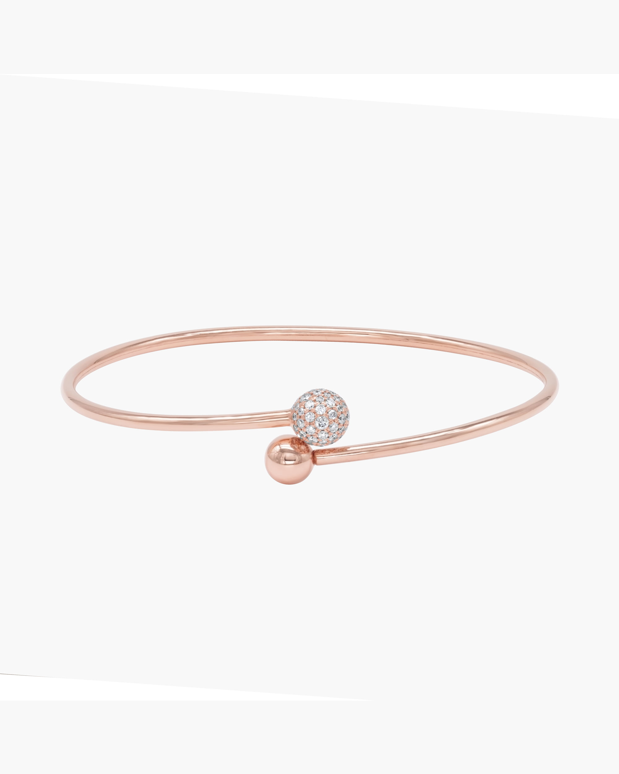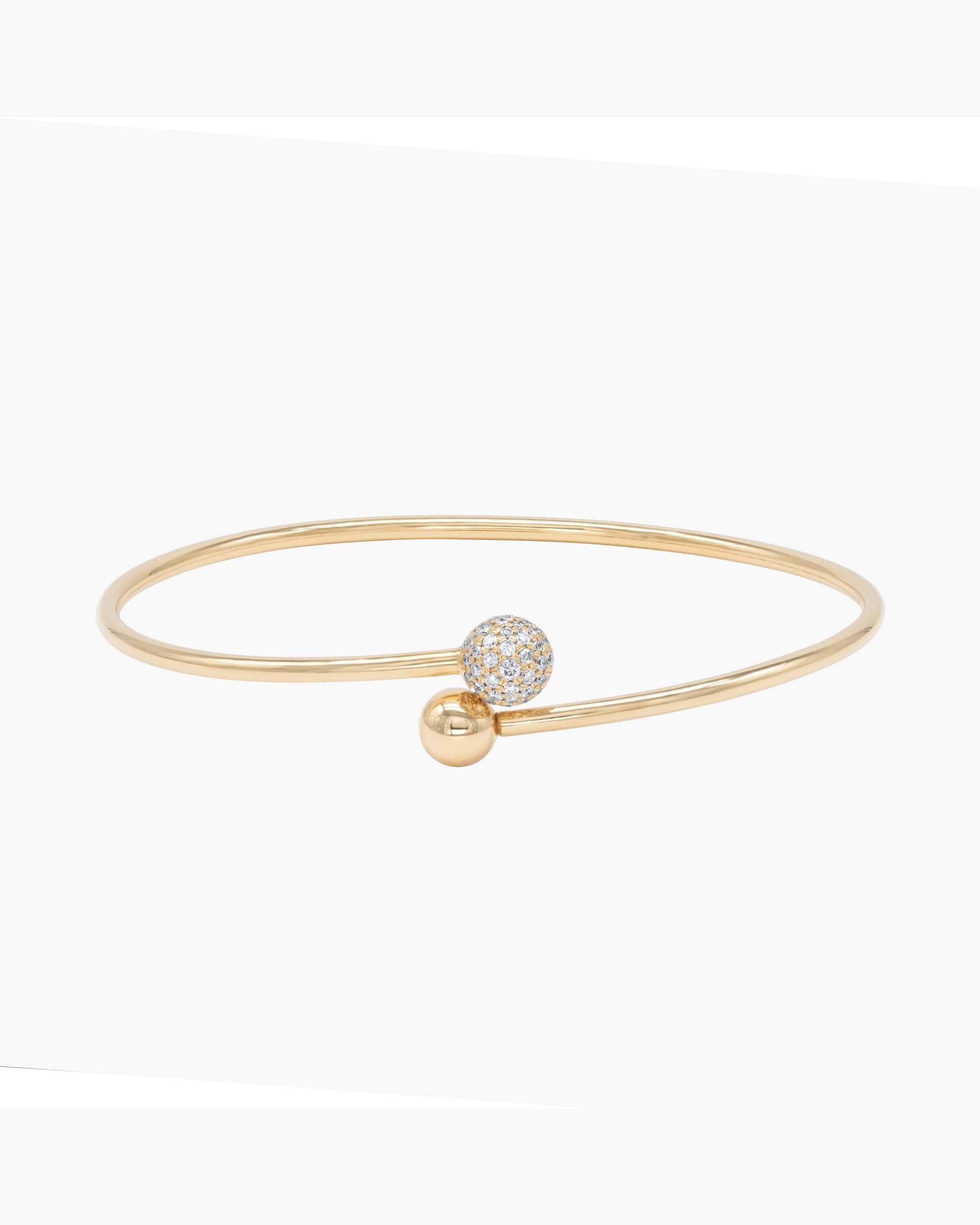 Elegance made easy with this Flexible Charm Bangle Bracelet. A flexible design makes it simple to slip onto the wrist. This sleek flexible bracelet is defined by overlapping ends, featuring a 7mm pavé diamonds sphere and a 6mm plain gold sphere.