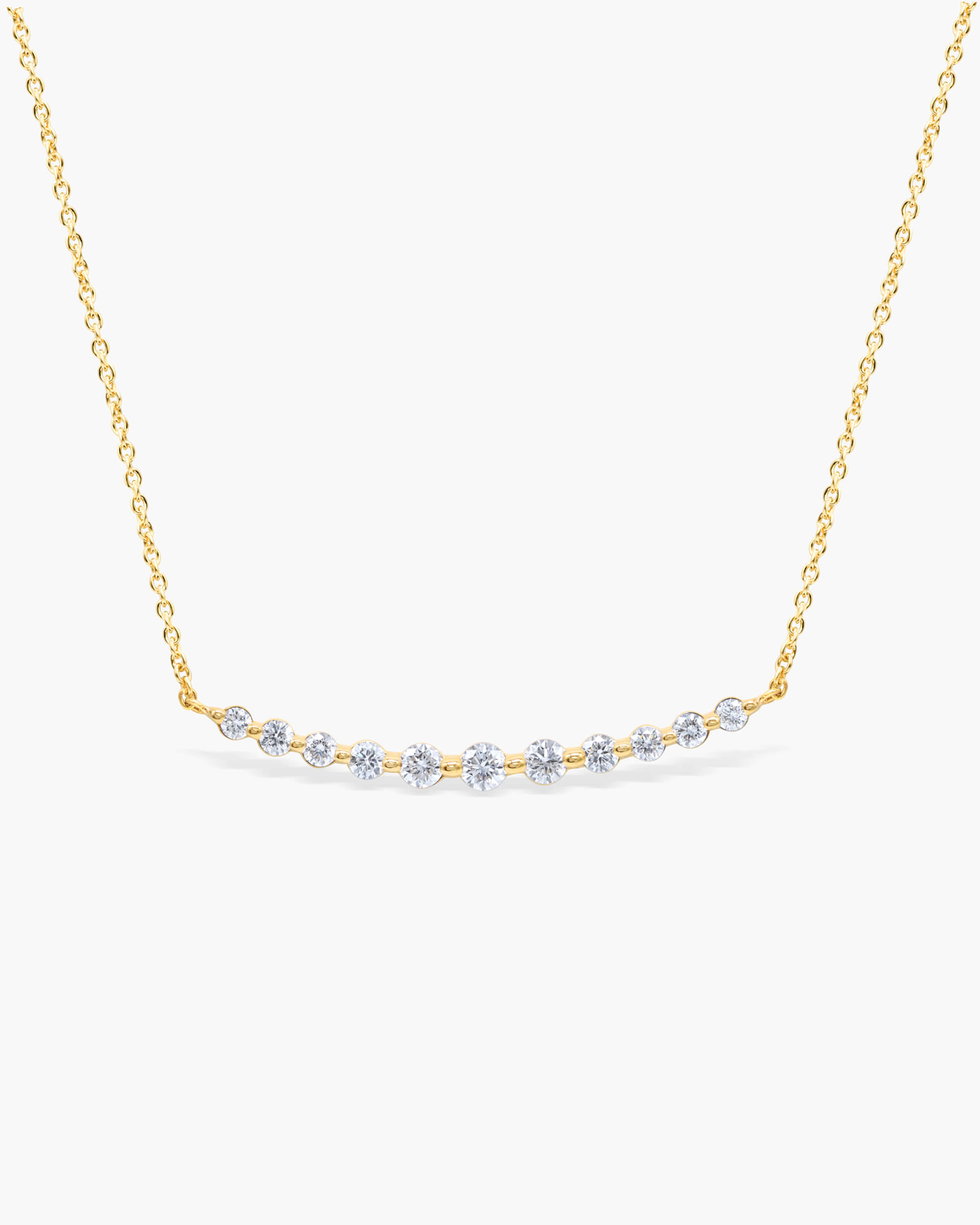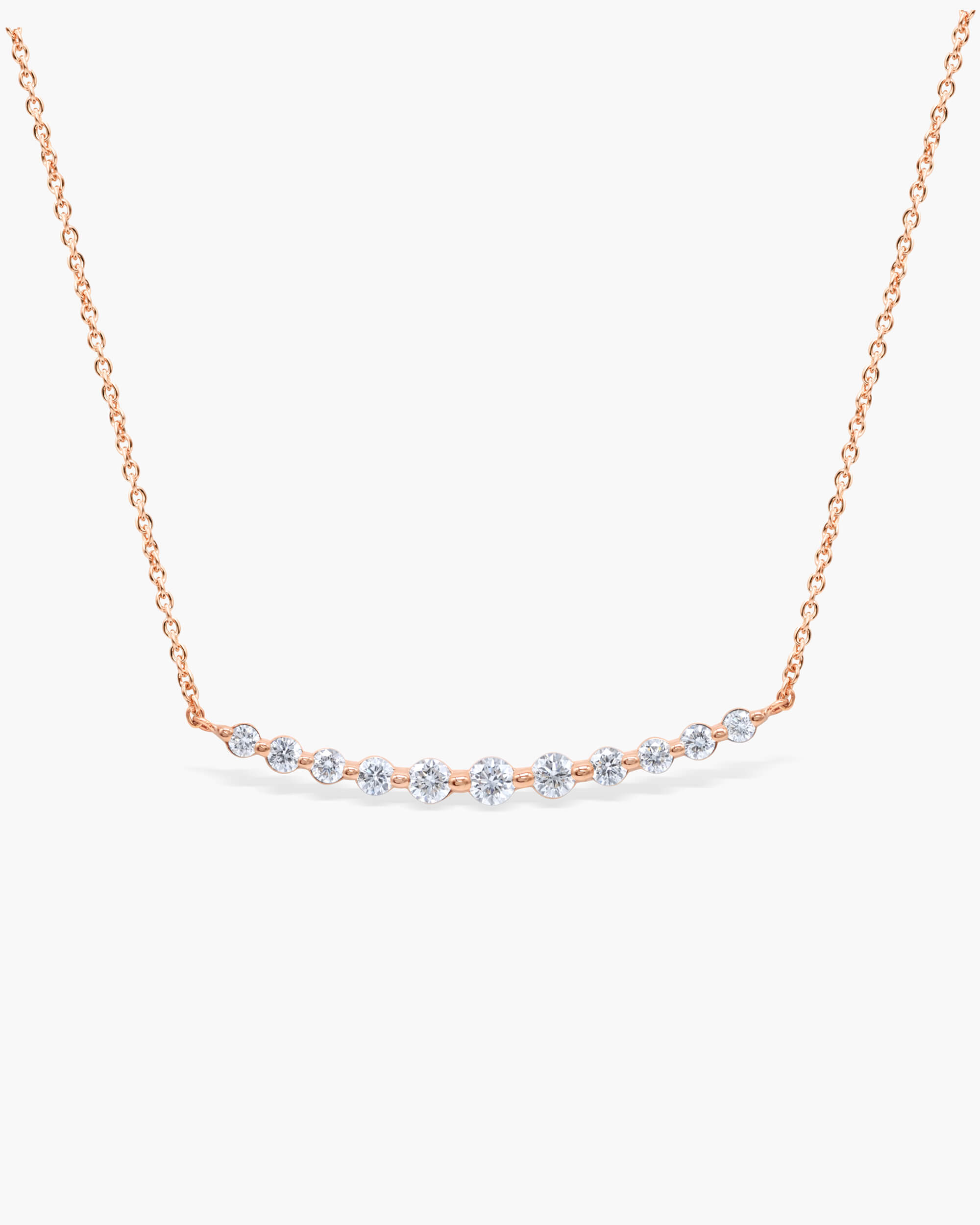 This elegant ‘Floating Diamond Curved Bar Necklace’ is both simple yet mesmerising. Eleven sparkling diamonds in graduated sizes, curve gently to form this refined necklace. The shimmering diamonds graduate in size, with the largest 10 cents in the centre and ends with 2 cents and they are set in minimal shared prongs that allow for maximum brilliance.