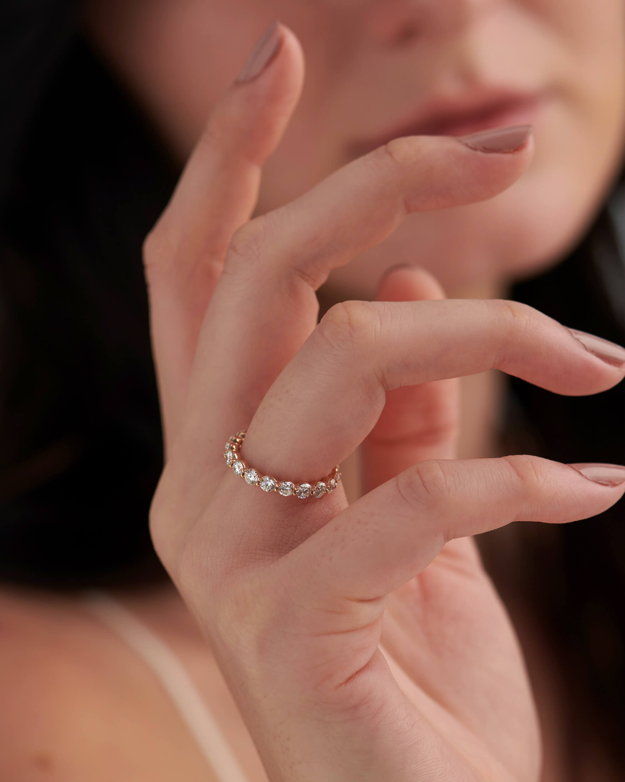 This sparkling Floating Diamond Eternity Ring (Grande) exhibits shimmering diamonds (0.10ct each), set in minimal shared prongs that allow for maximum brilliance and adorns this eternity band. This ring can be worn solo or stacked with your engagement bands or other sparkling bands.