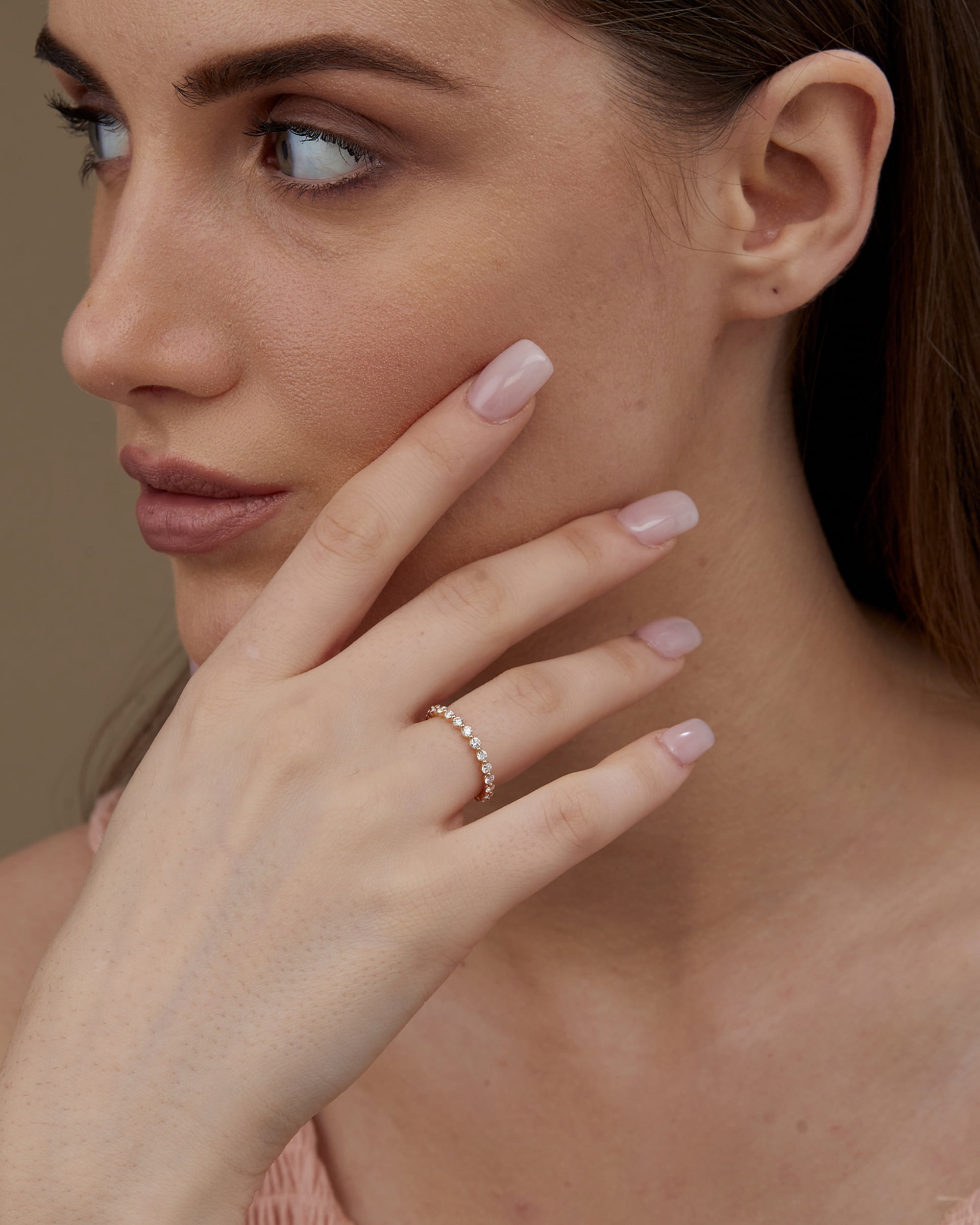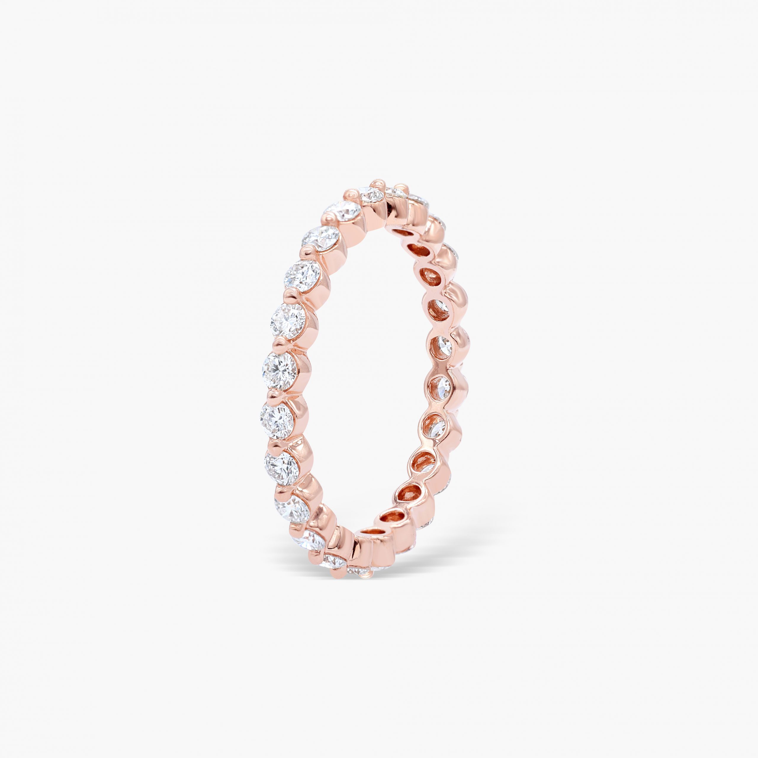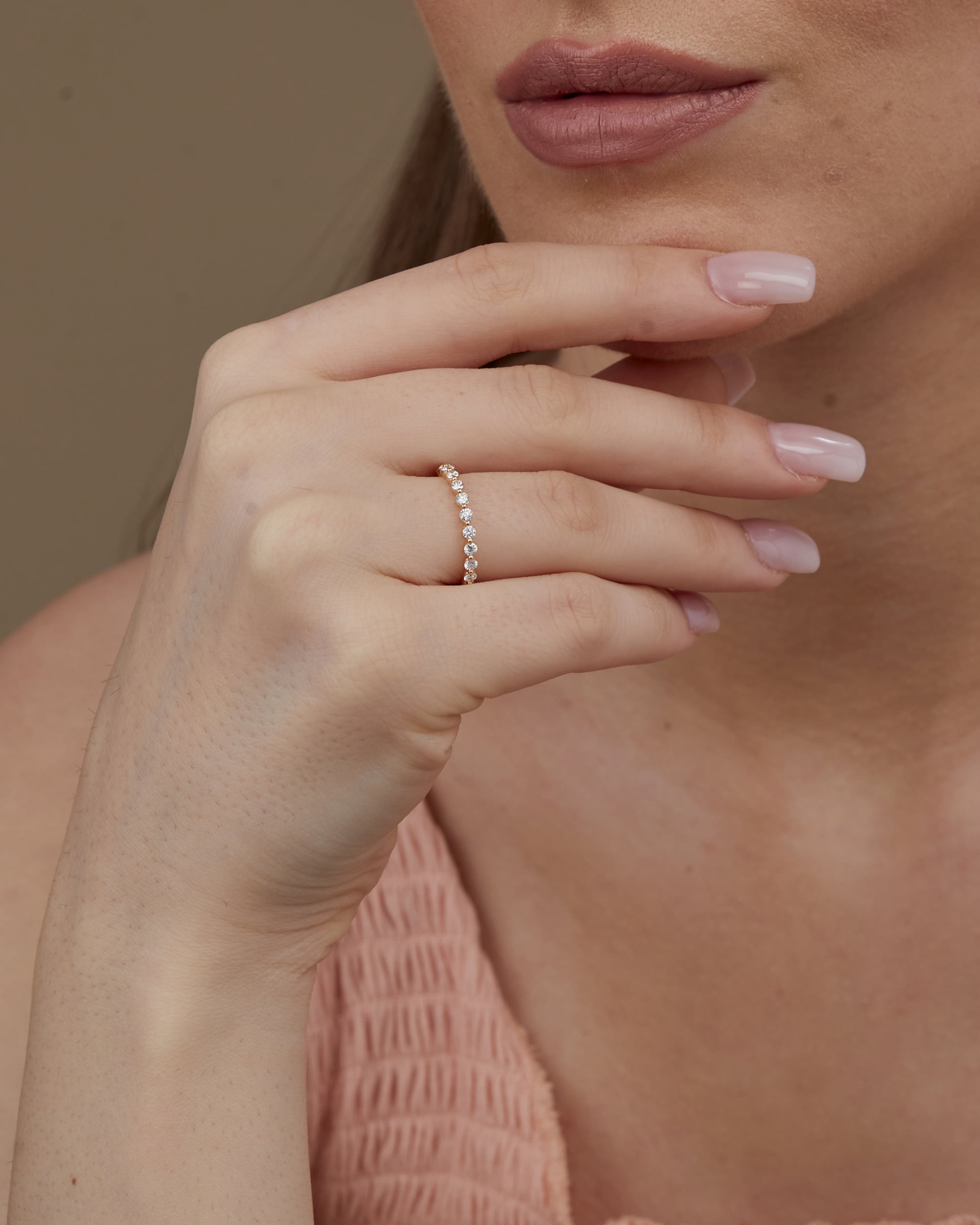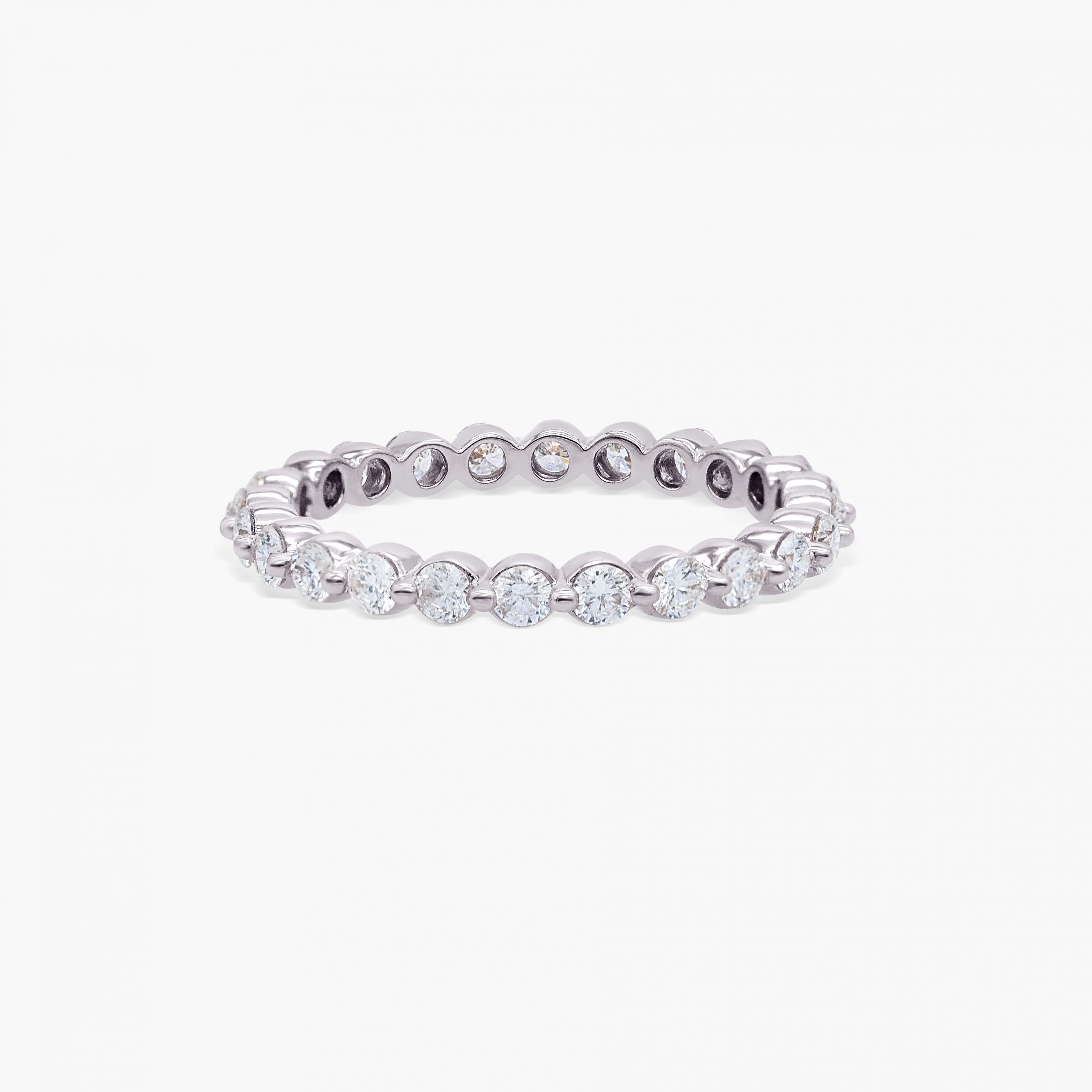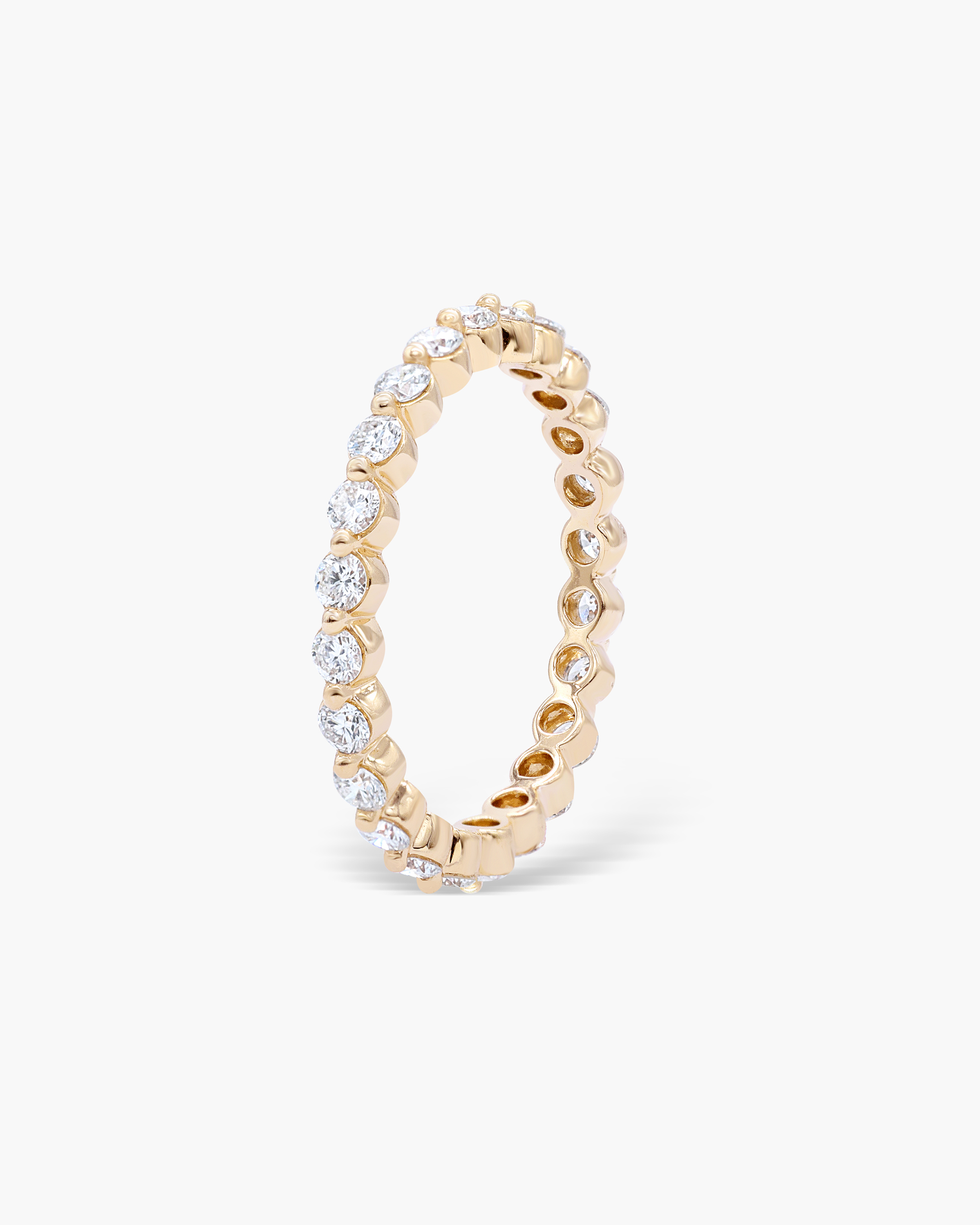 This sparkling Floating Diamond Eternity Ring (Medium) exhibits, shimmering diamonds (3.3cents each), set in minimal shared prongs that allow for maximum brilliance and adorns this eternity band. This ring can be worn solo or stacked with your engagement bands or other sparkling bands.