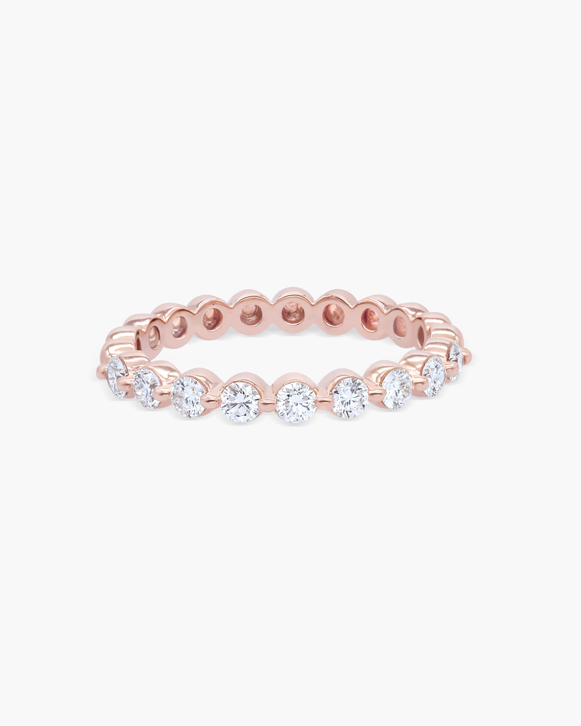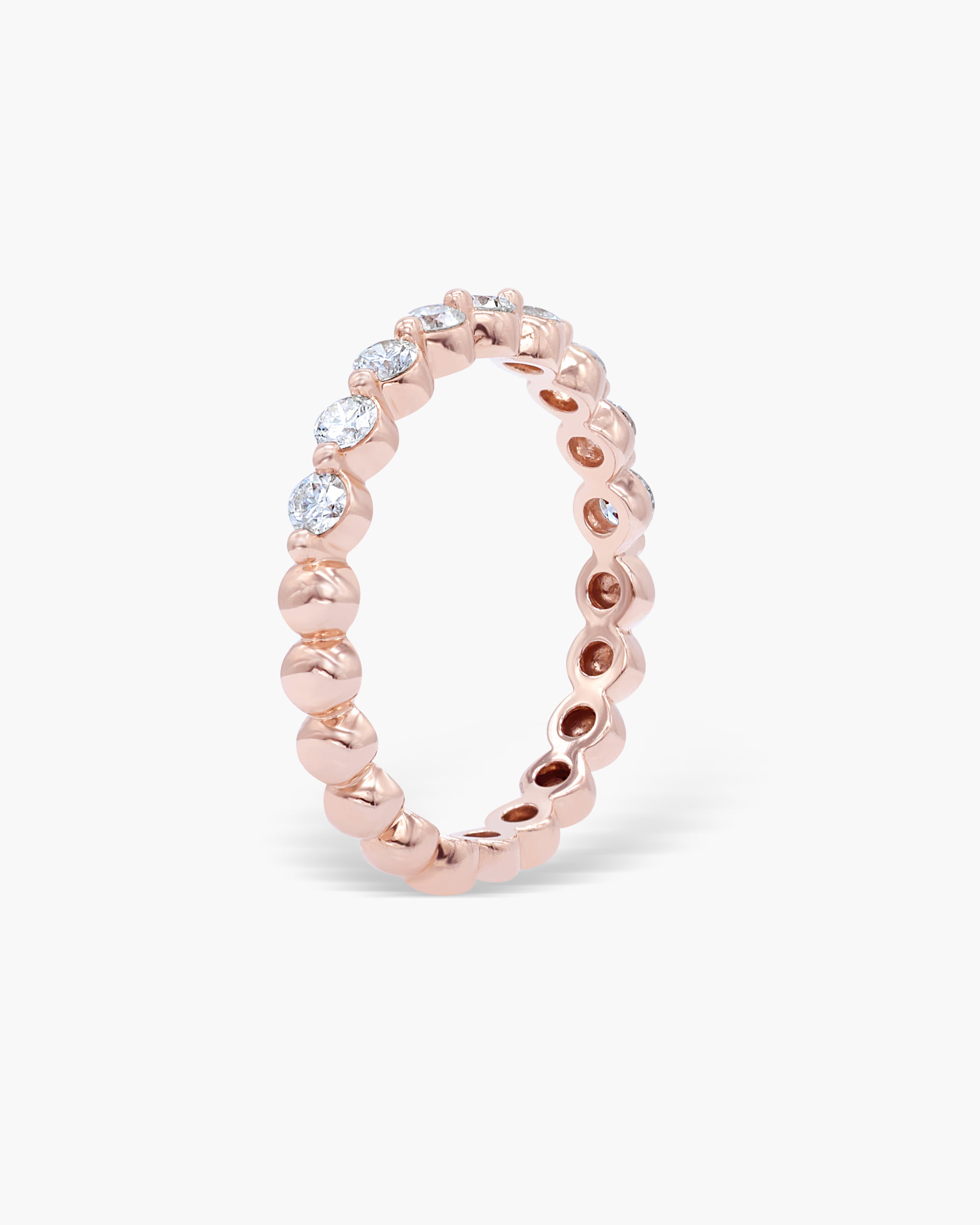 This spectacular Floating Diamond Half Eternity Ring exhibits round brilliant cut diamonds in an exquisitely modern way and set in 18K Gold. Floating shared prong diamonds shimmer from the top half of this band and with beaded polished half for a light and lustrous look. This ring can also be worn as a part of a stack.