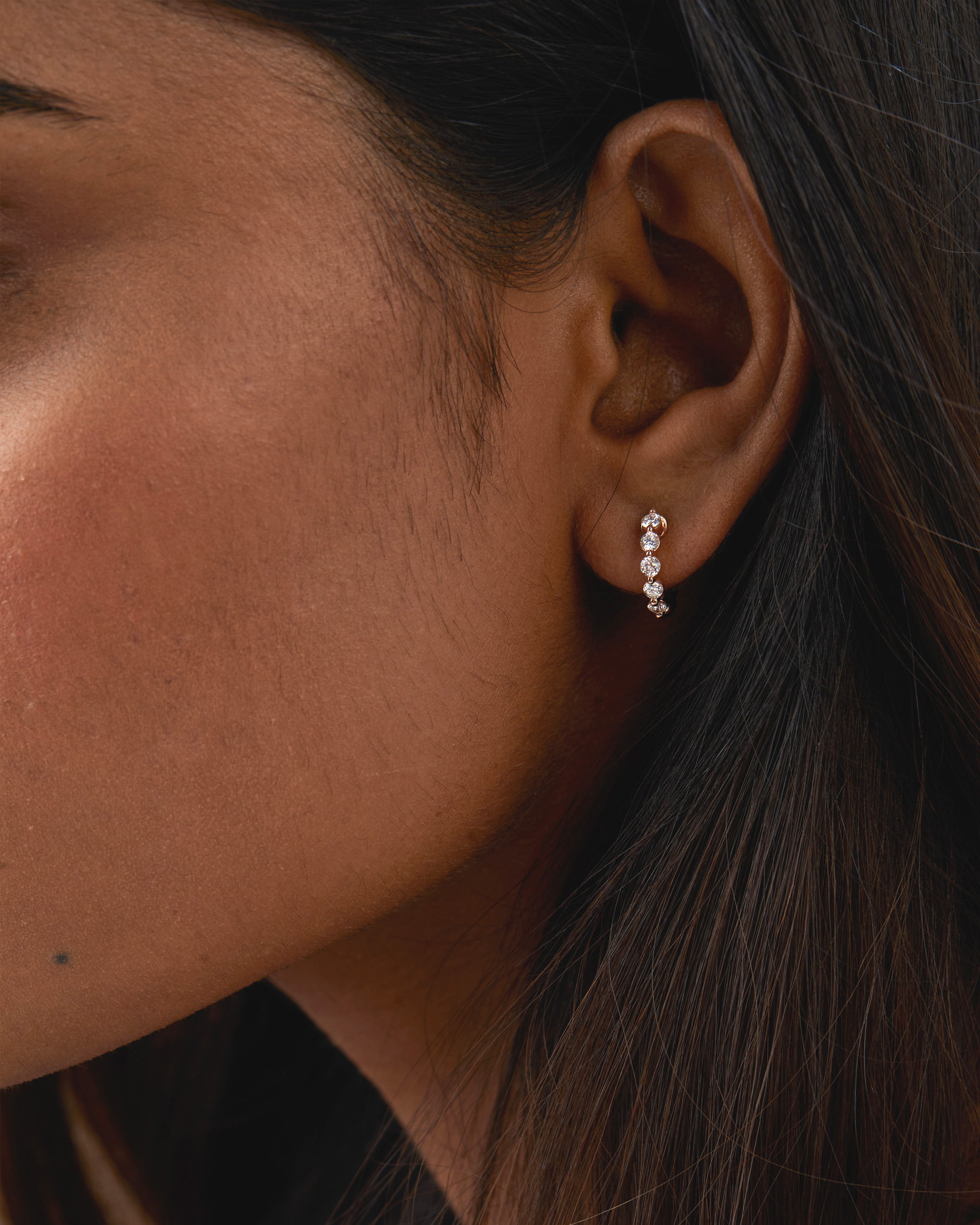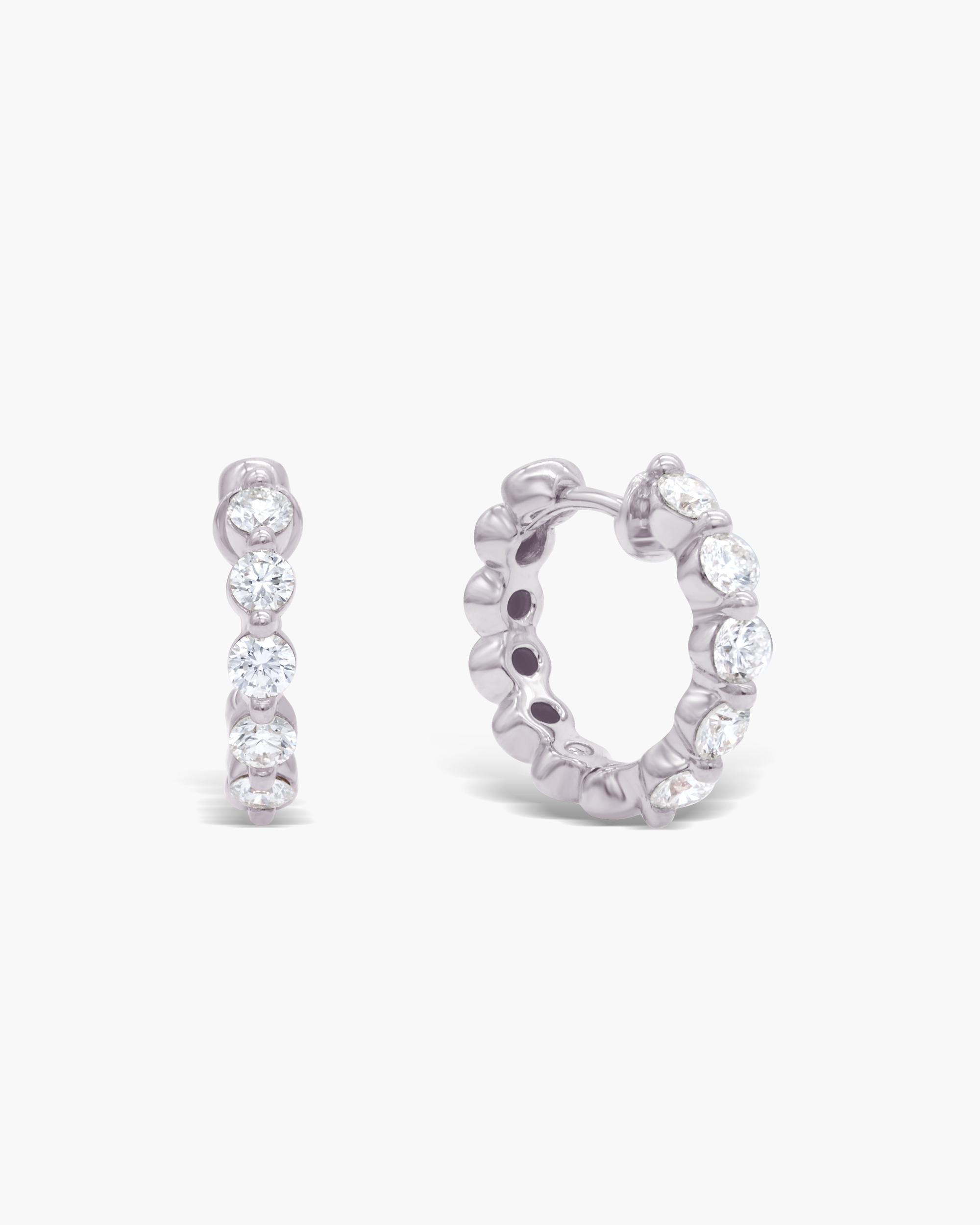 “Our classic Floating Diamond Hoops (Medium) are the ideal, everyday pair. This hoop earrings features a row of 5 diamonds (5 cents each) in front, artfully set in shared prongs that allow for maximum brilliance and the rear has a beaded polished half for a light and lustrous look.