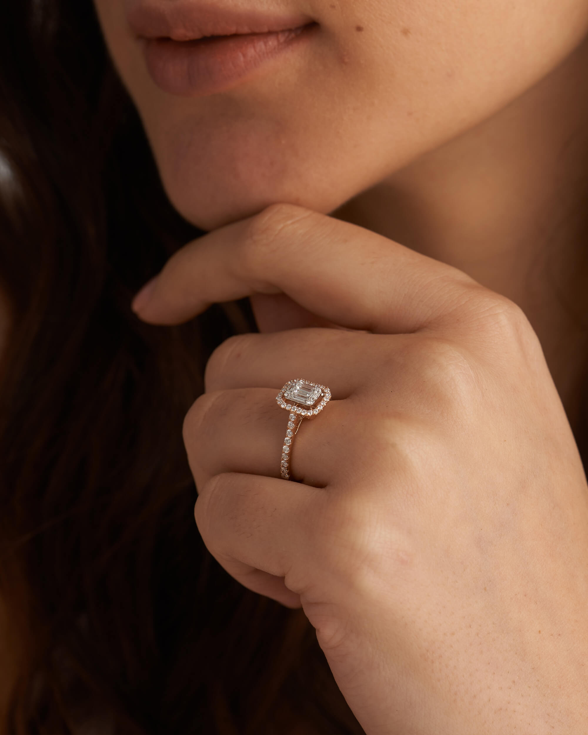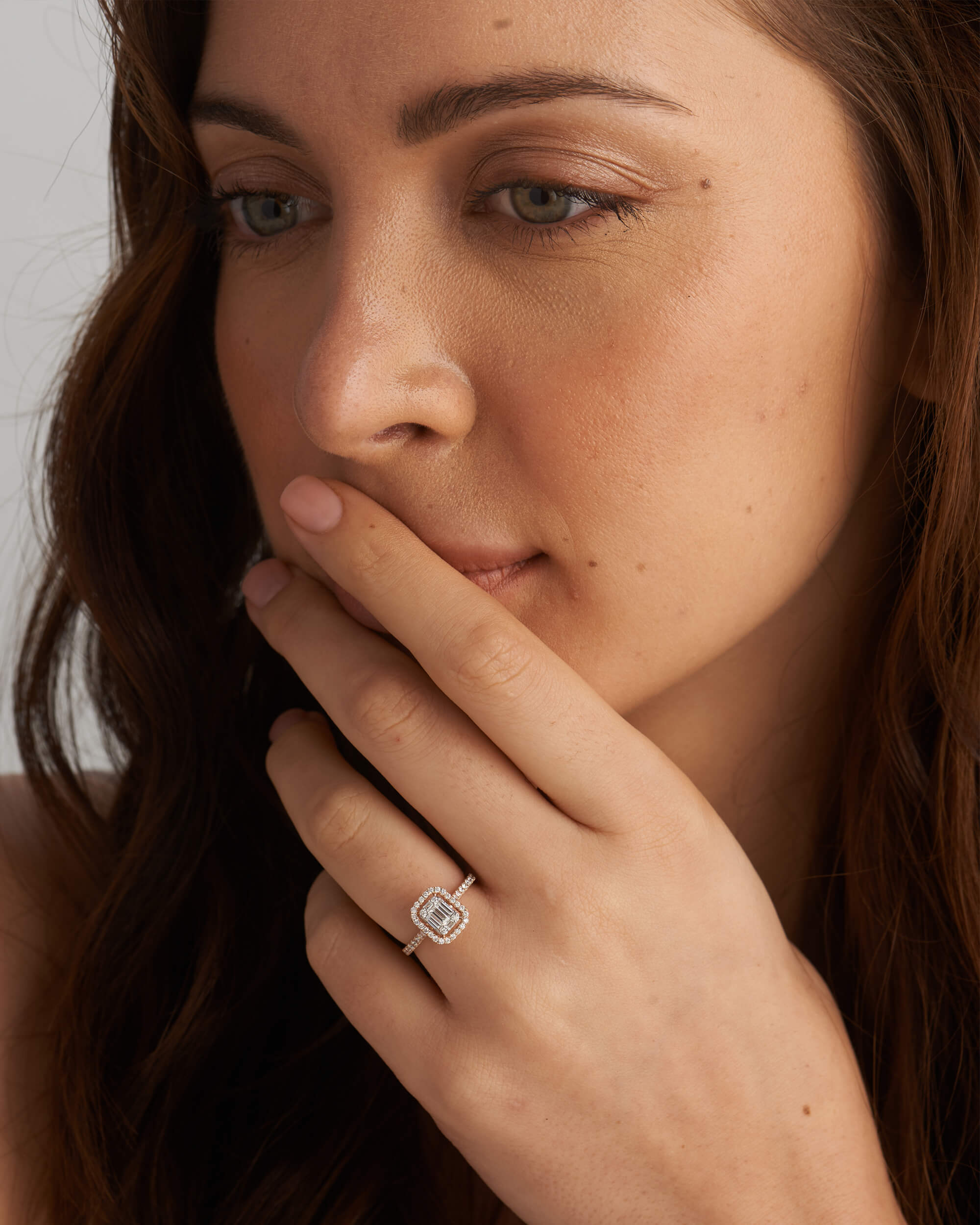 Treasure this Floating Halo Composite Baguette Solitaire Ring forever. This ring features a cluster of baguette and round cut diamonds in the centre, giving an emerald-cut solitaire look of size (approximately 5.3mmx7mm) and wrapped in a round diamond halo accent. While additional shimmering diamonds line the slender, tapered shank and accentuates the ring.