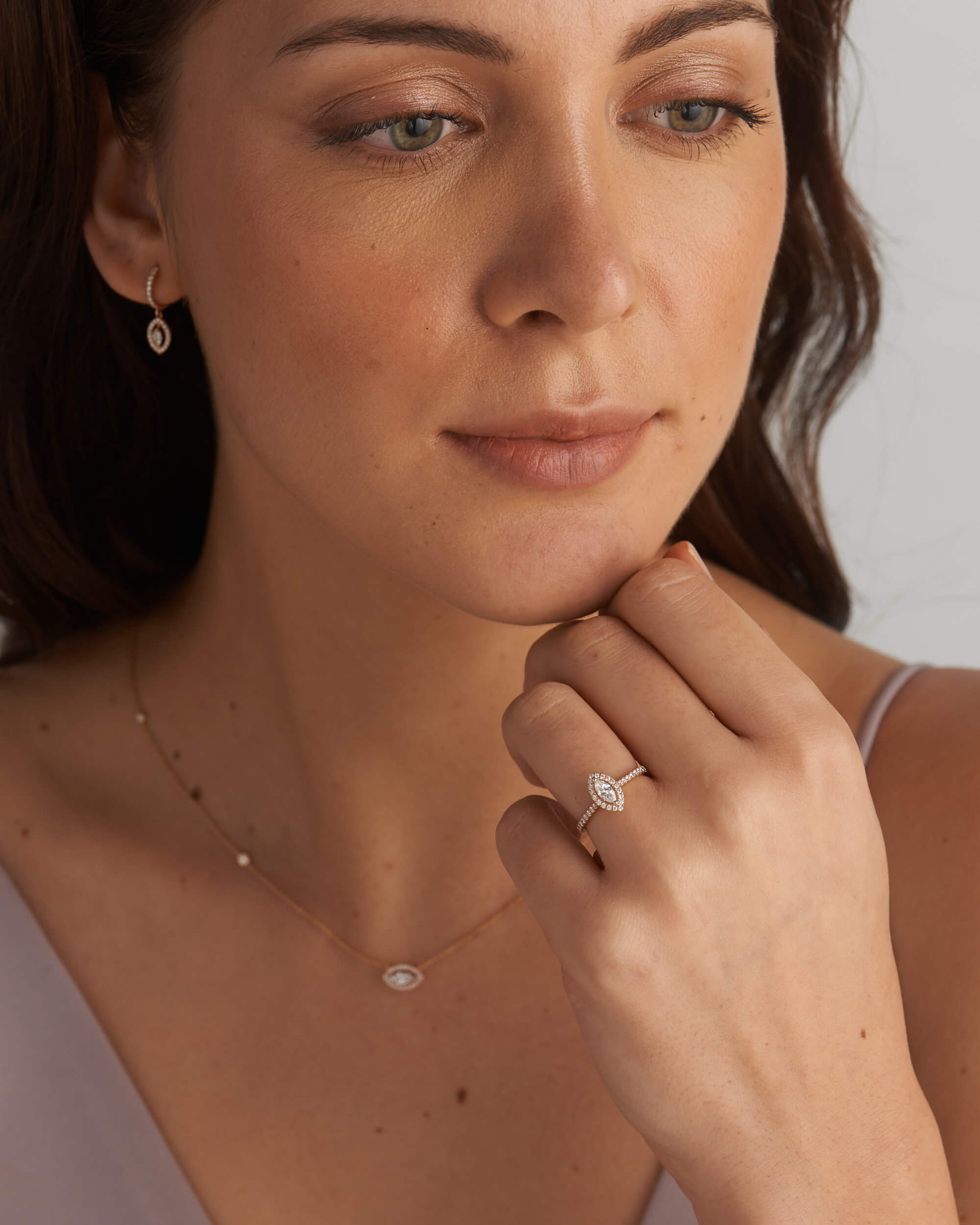 Pledge to love her to eternity with this Floating Halo Marquise Solitaire Ring . Handcrafted in solid gold, this ring features a solitaire marquise shape diamond (0.25ct) in the centre and accented by a floating halo of micro prong set diamonds.