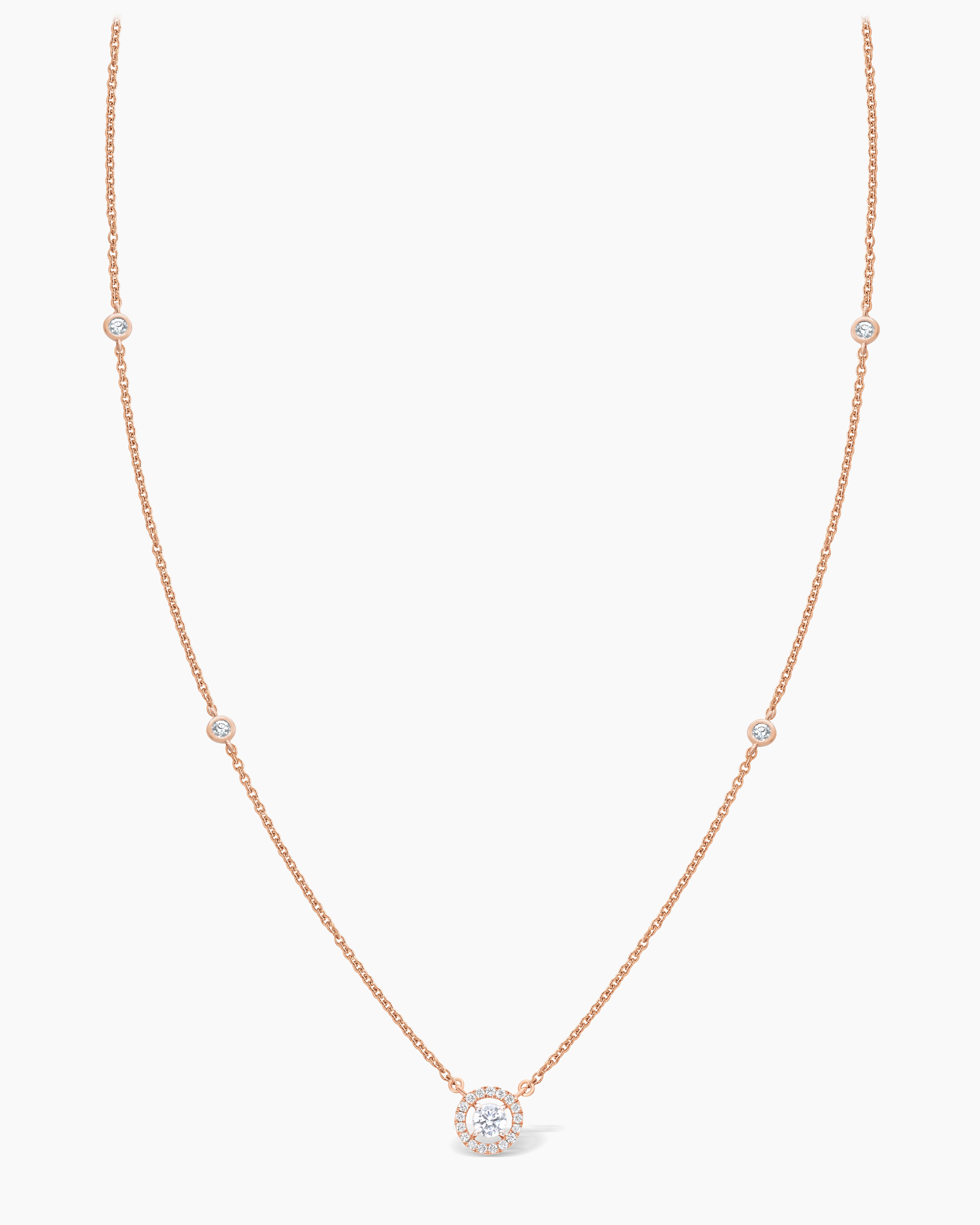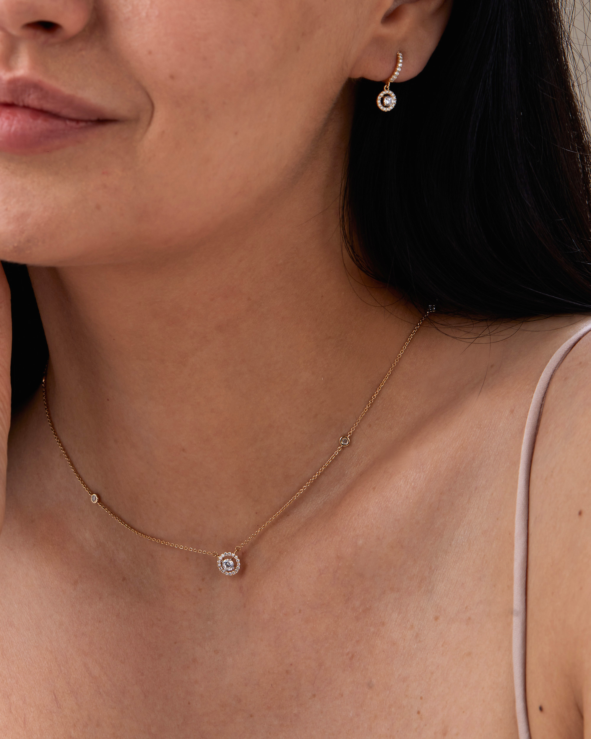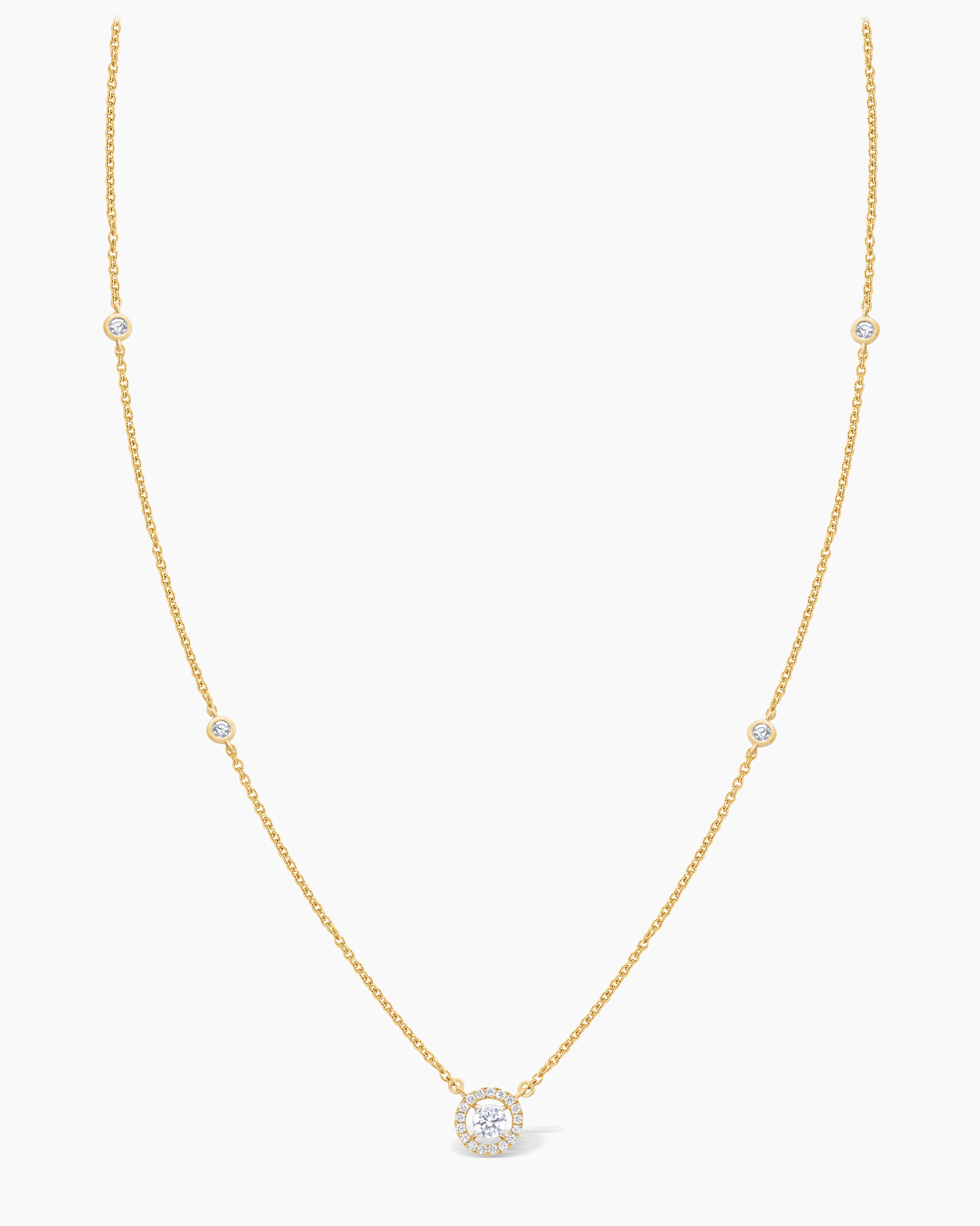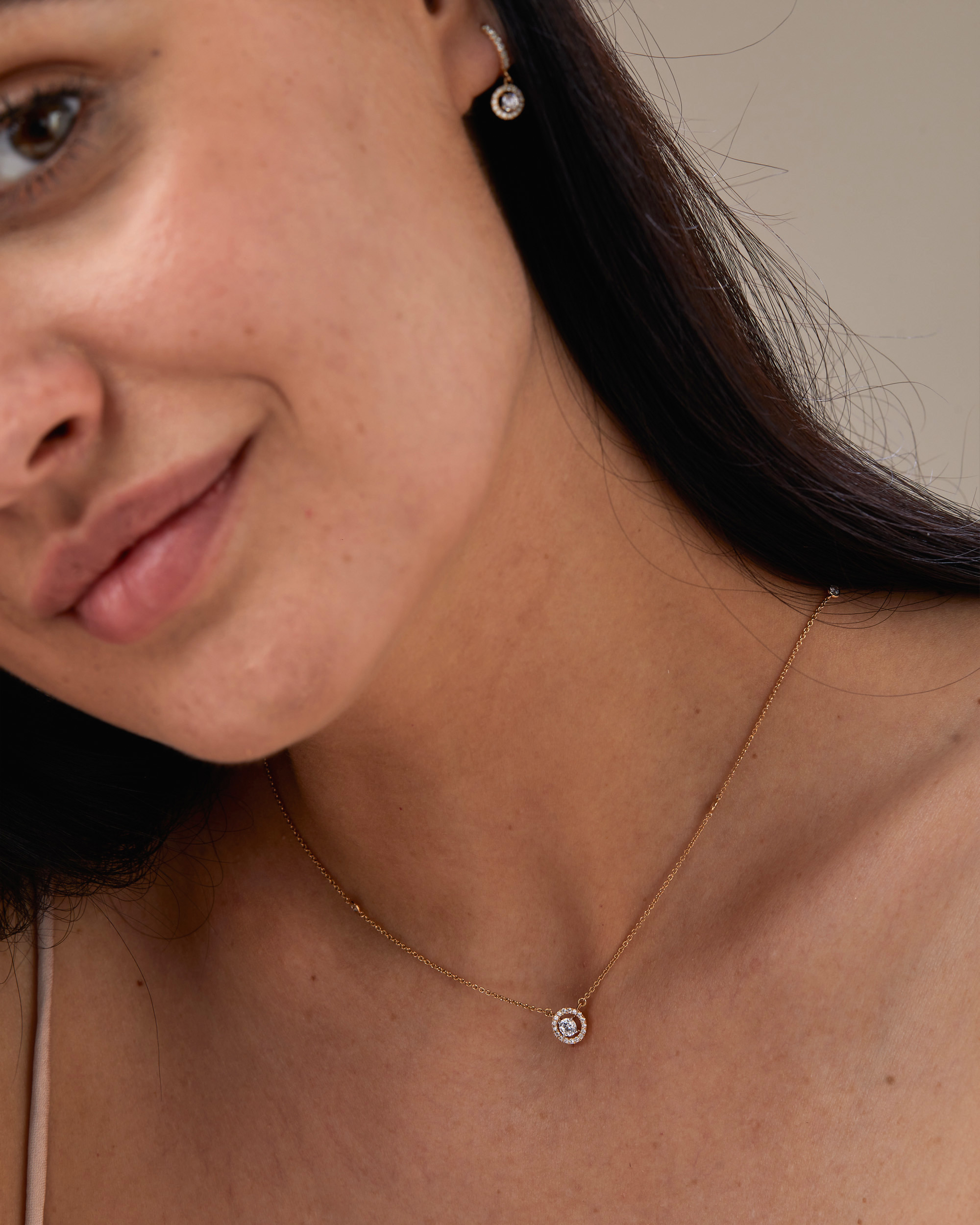 Sway with our classic and elegant piece. This necklace features a solitaire diamond (0.2ct) surrounded with floating halo of micro prong set shimmering sparkling diamonds and bezel set diamonds on the chain to elevate the look.