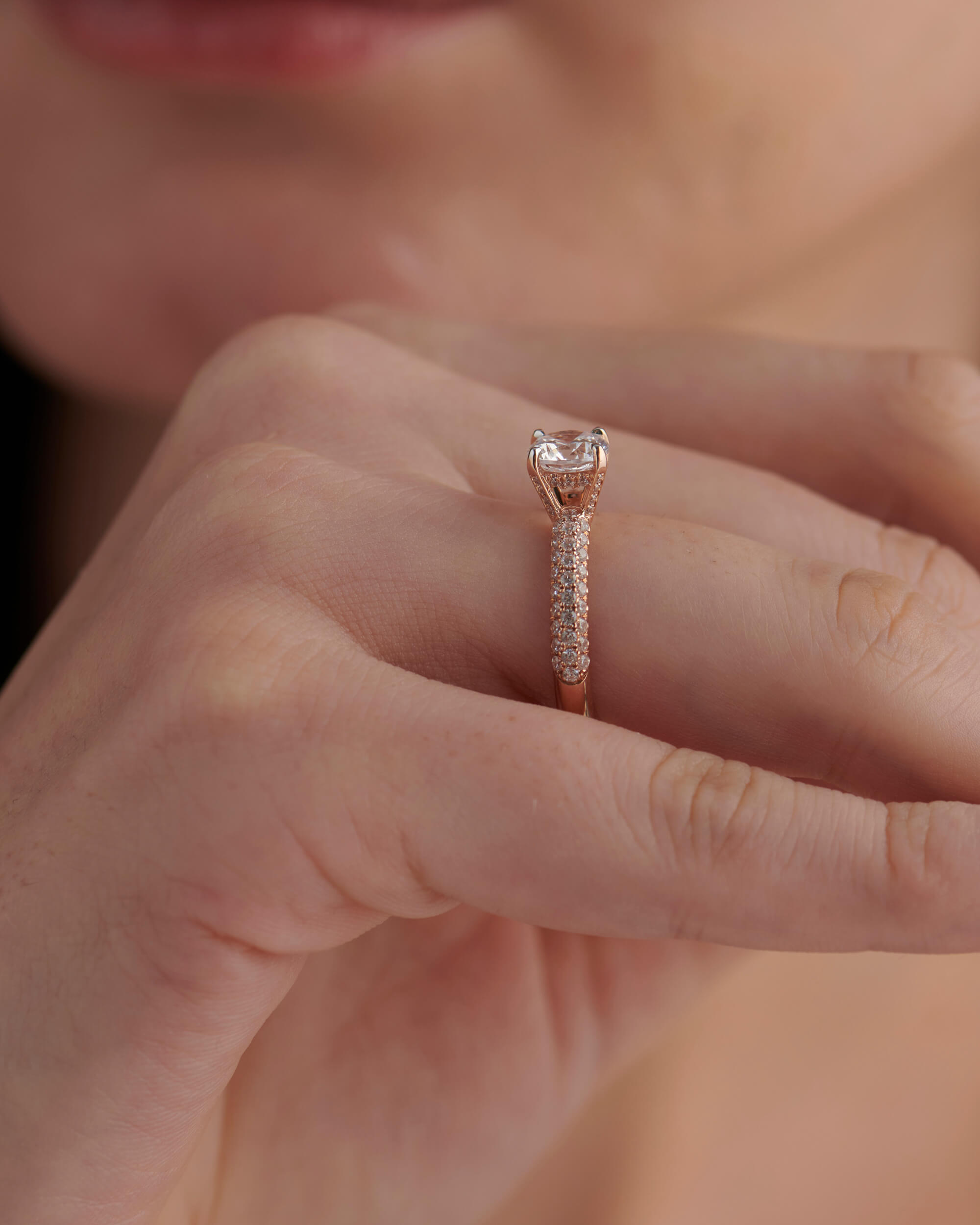 A ring that looks stunning from all angles and one to surprise and delight. Our beautiful and intricate Four Prong Petite Pave Solitaire Ring features a round diamond centre stone (1ct), with diamond studded prongs and embedded on round diamonds pave set all around the centre solitaire. The shank features a three row of pave set diamonds curled on the underside to display a round diamond accent.