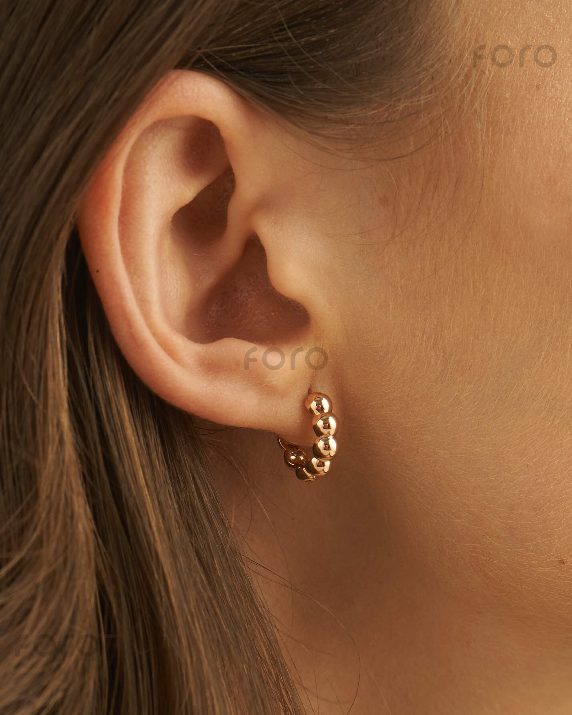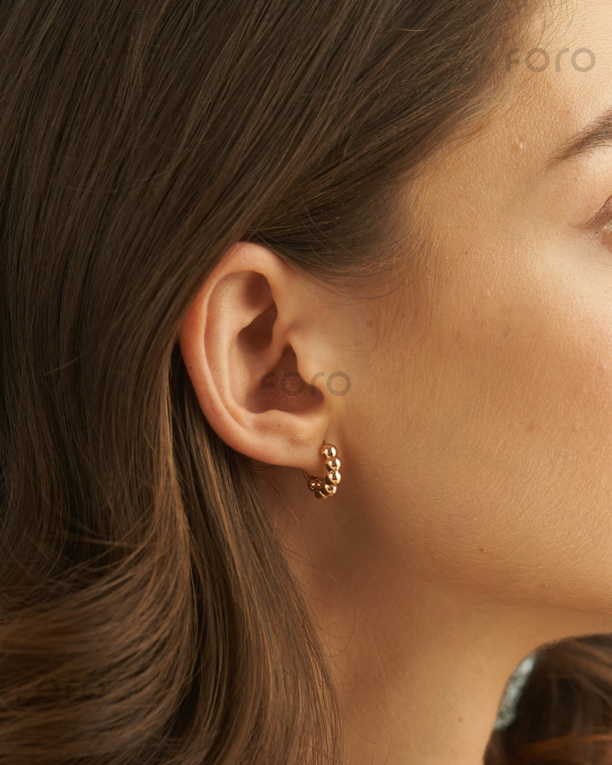 These Gold Beaded hoops (medium) are the perfect size for everyday wear and compliment any look. Handcrafted in solid gold and with high gloss finish. Wear on their own for a super chic vibe, or stack them up with daintier pieces for a curated look. These hoops are secured with hinged backs.