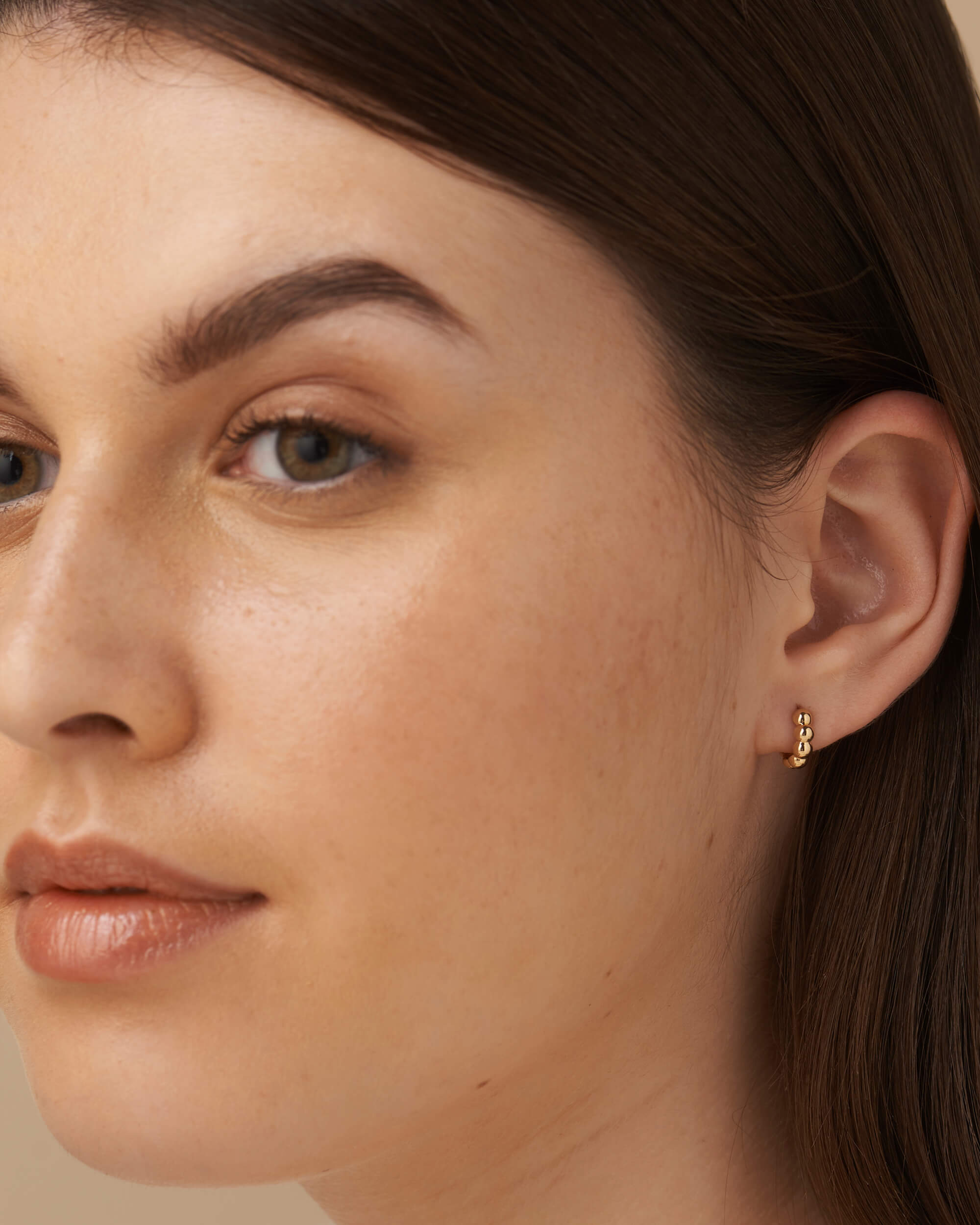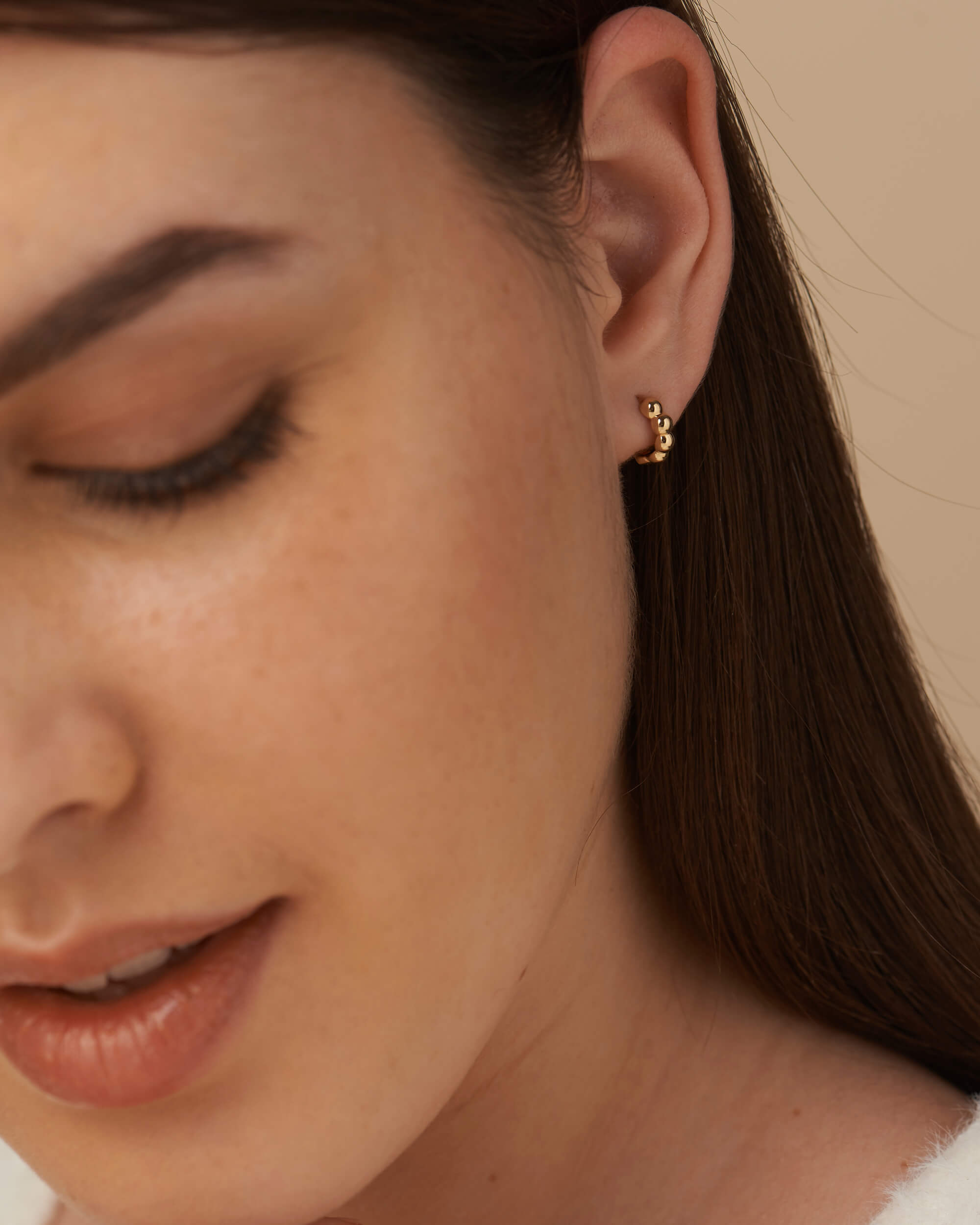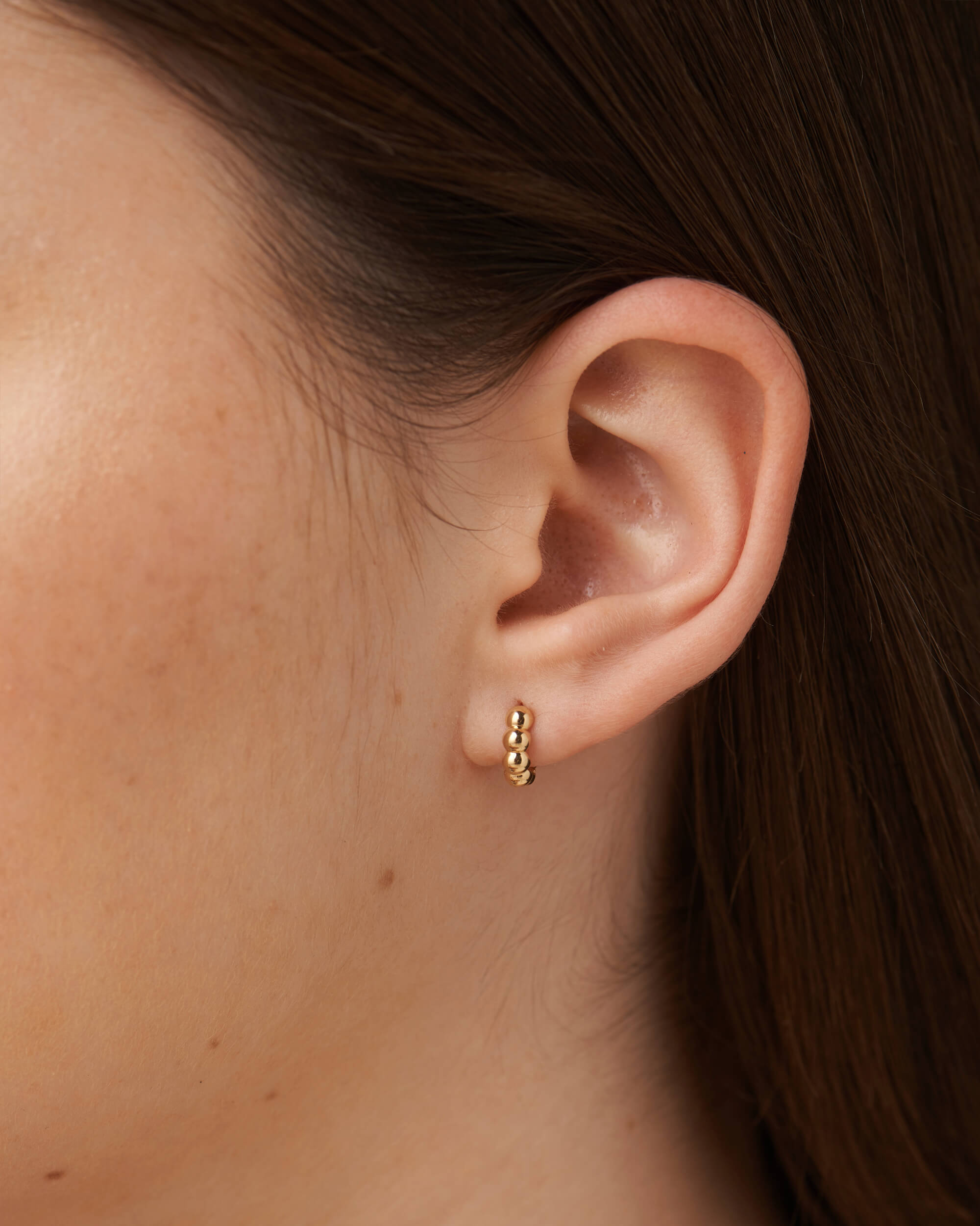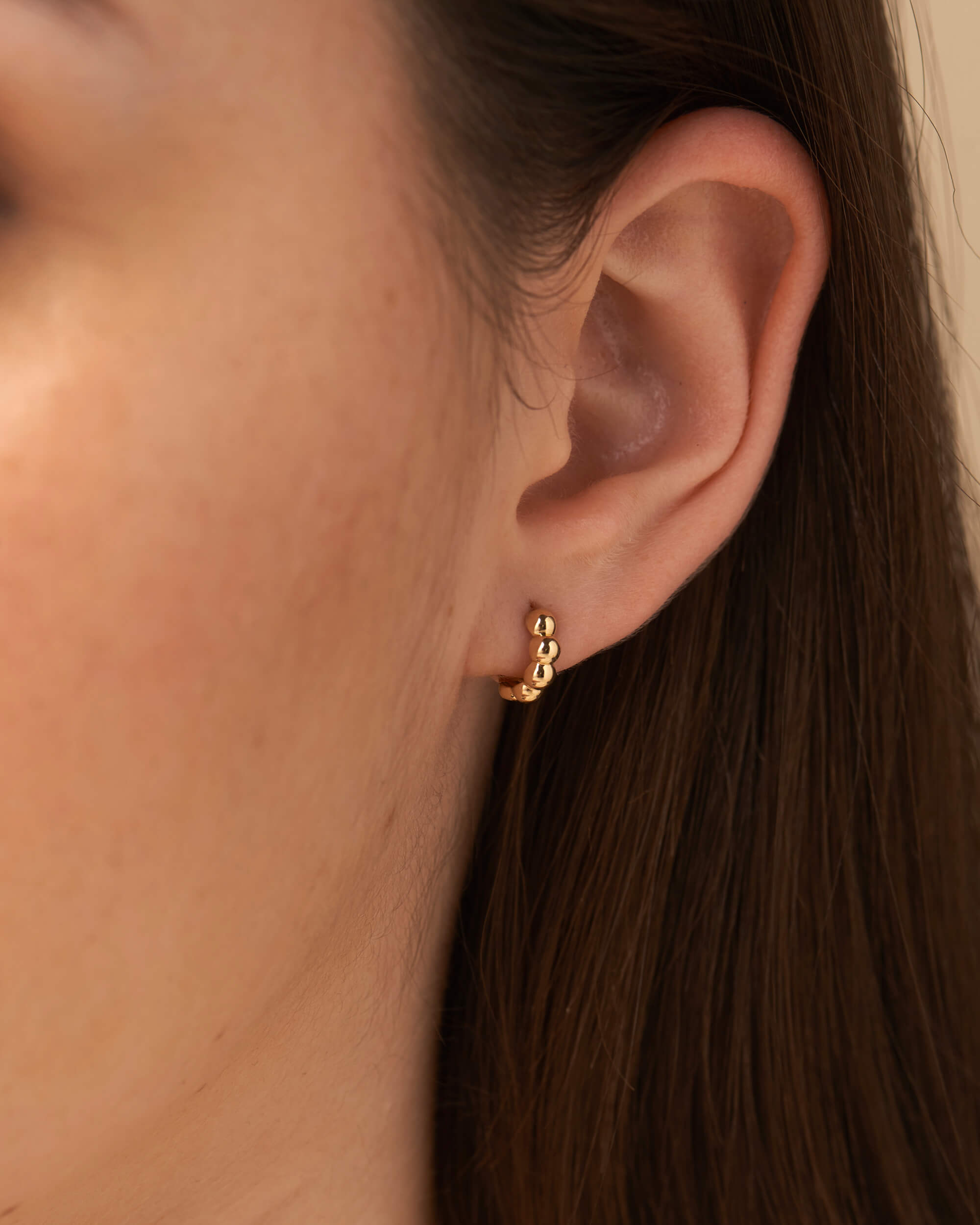 These Gold beaded hoops (small) are the perfect accessory for finishing off your look or giving as a gift for a friend who loves hoops. Handcrafted in solid gold and with high gloss finish. Wear on their own for a super chic vibe, or stack them up with daintier pieces for a curated look. These hoops are secured with hinged backs.