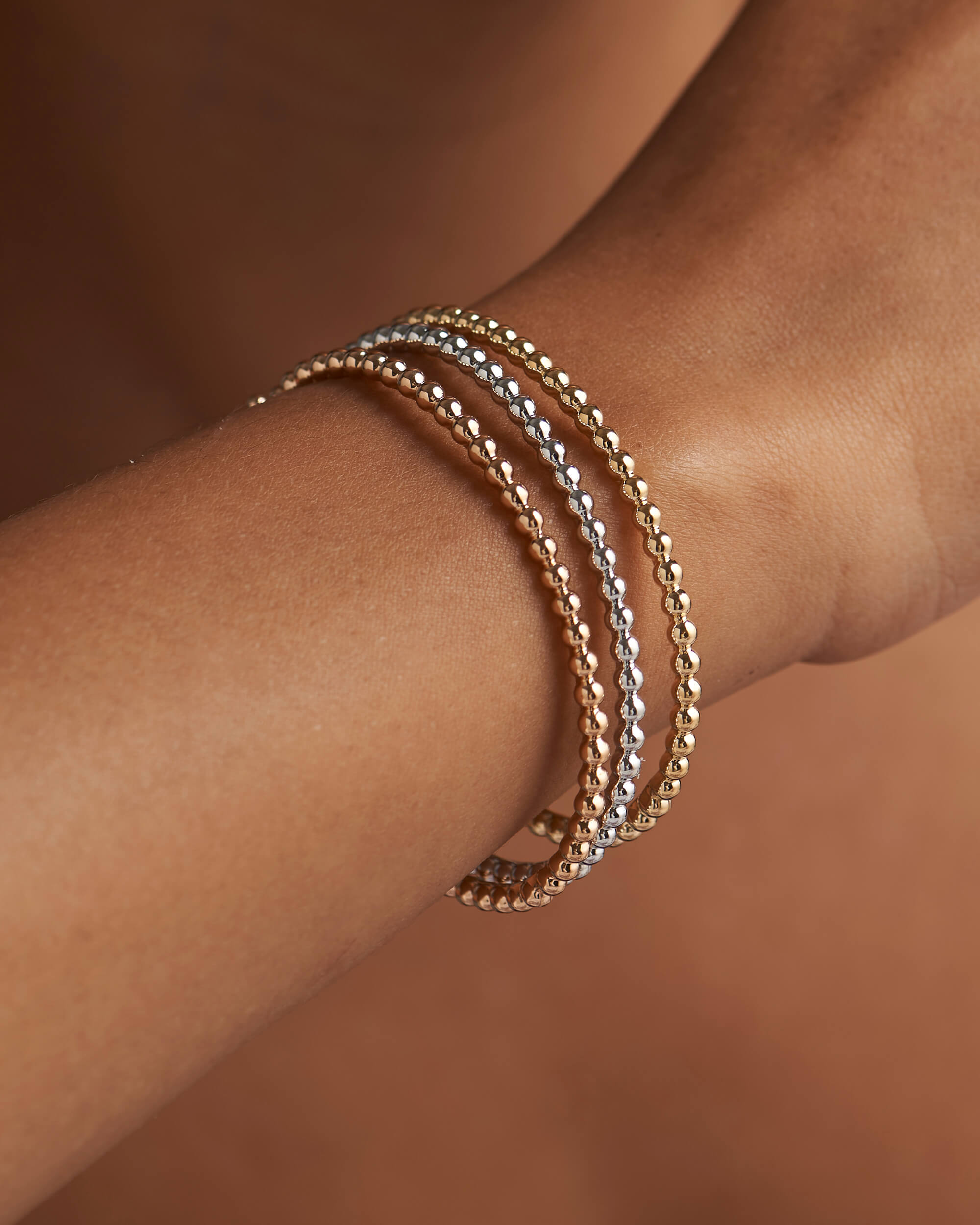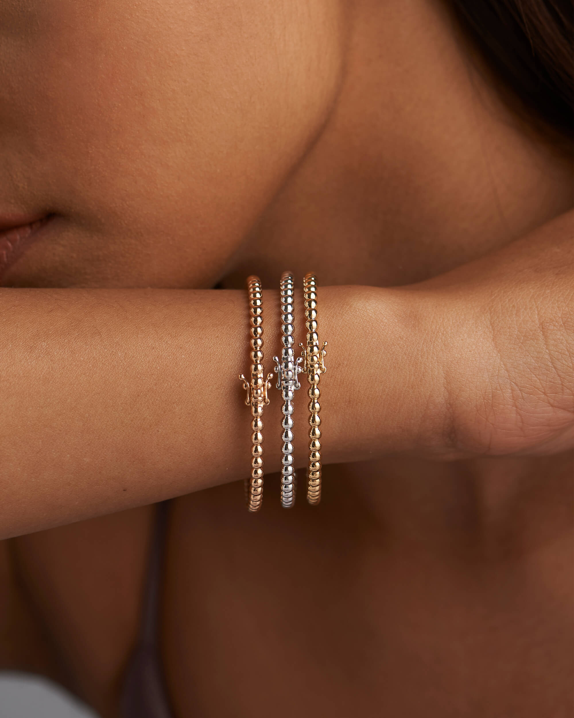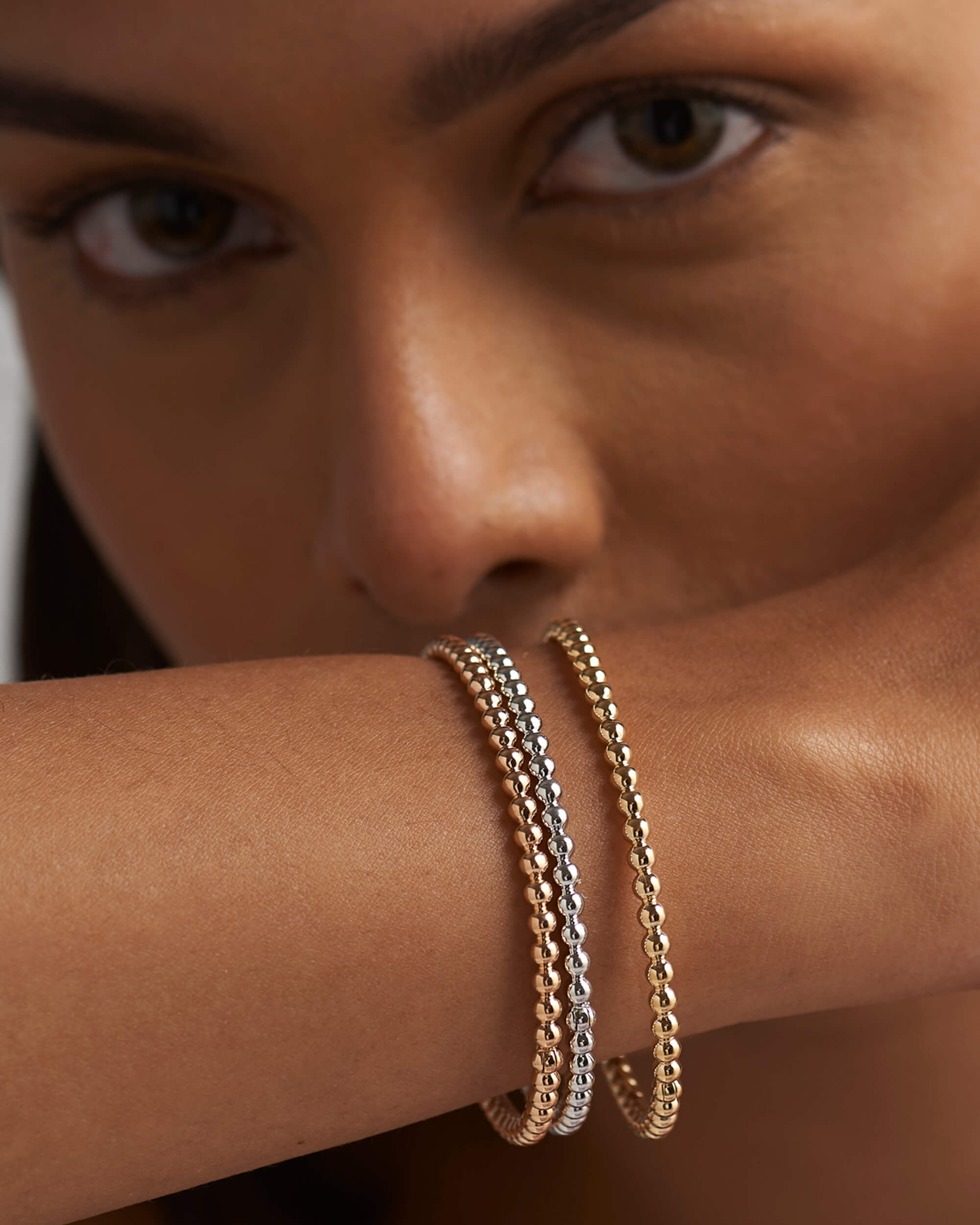 Add some texture and shape to your everyday. This Gold Beaded Oval Bangle features tiny beads and with high gloss finish. The bangle hinges open with a securely designed clasp