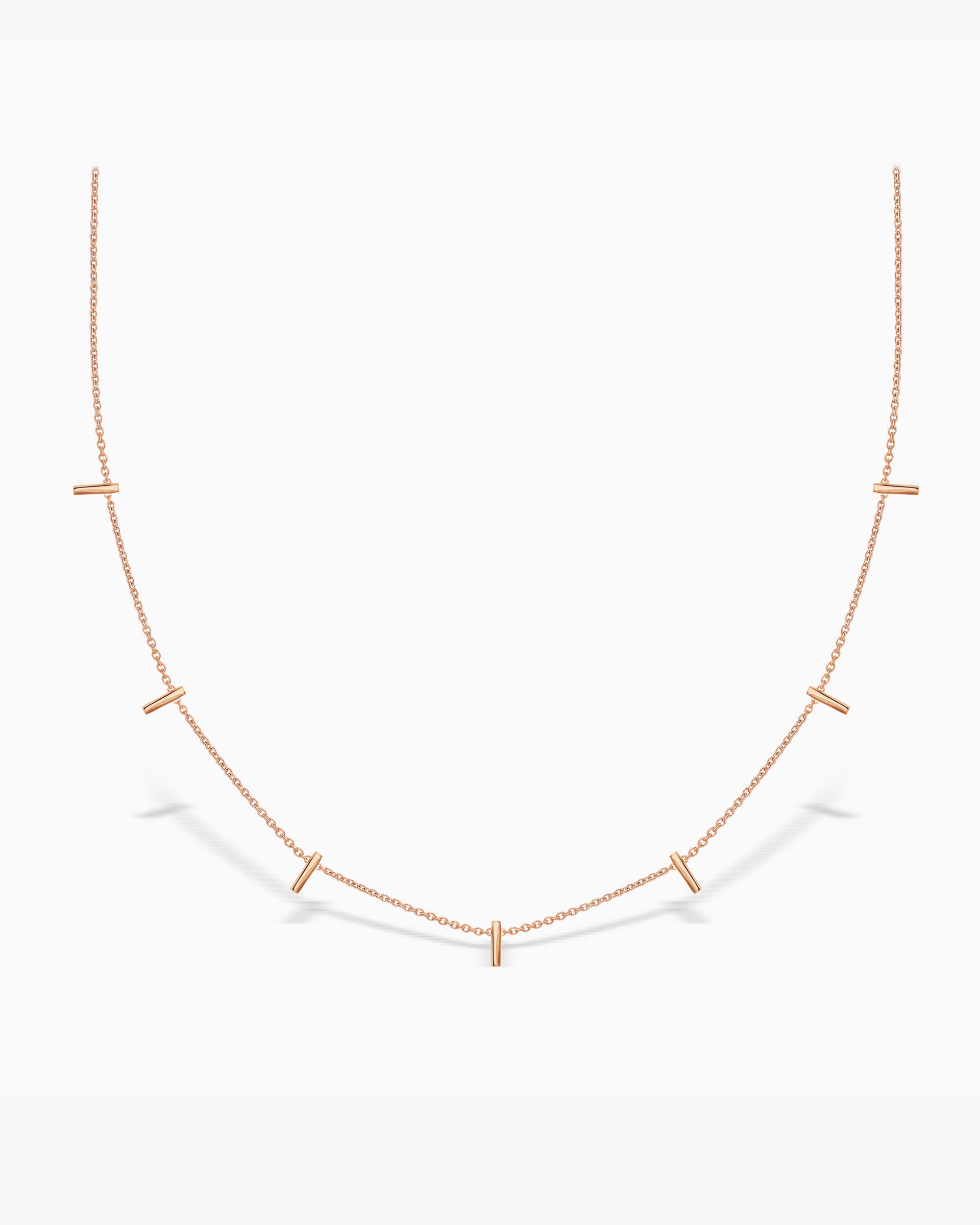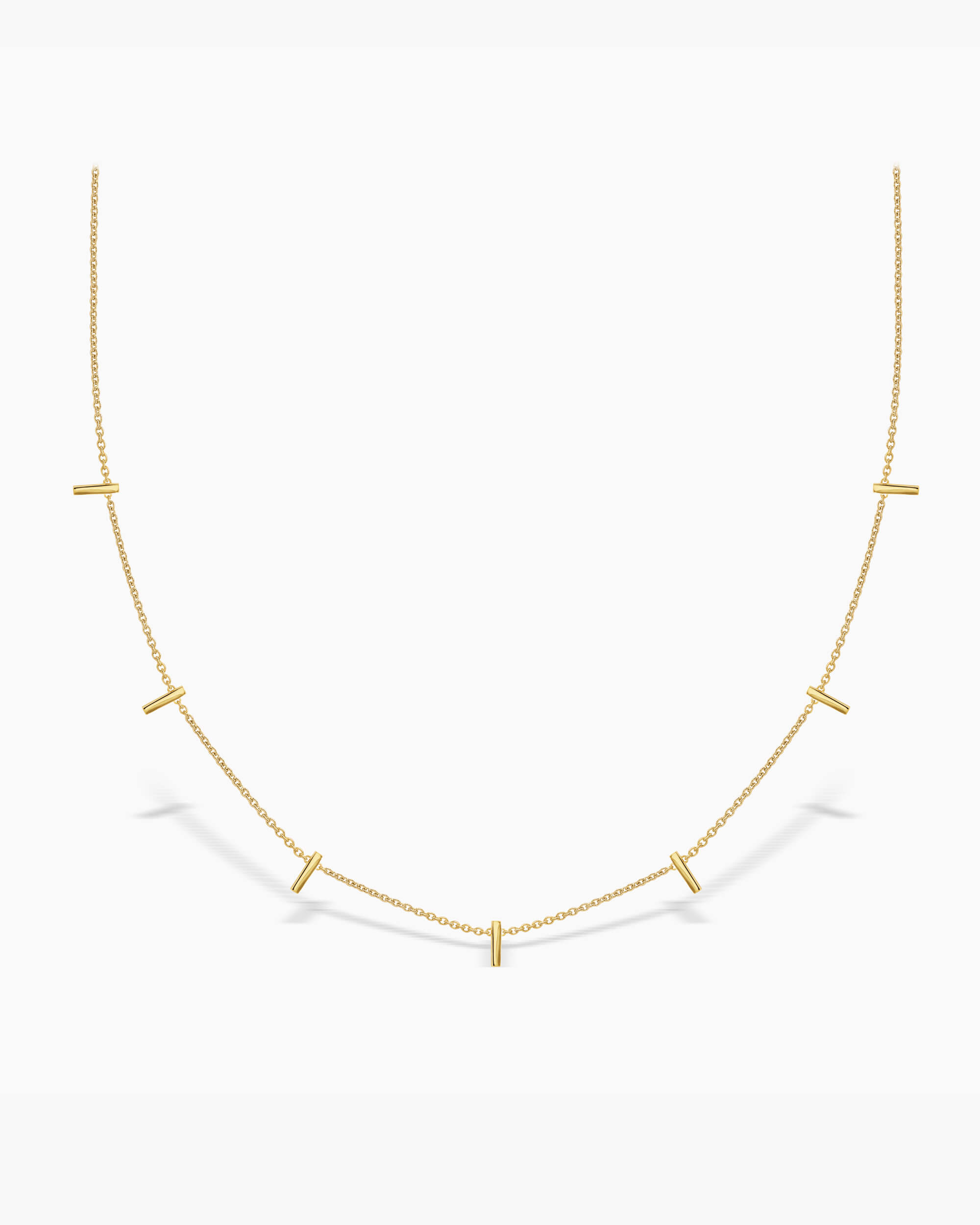 Great solo or as a dainty layering necklace, this Gold Multi-Bar Necklace adds an elegant touch to your ensemble. This necklace features 7 dangling tiny high polished gold bars which are stationed at regular intervals and they dangle from the chain elegantly.