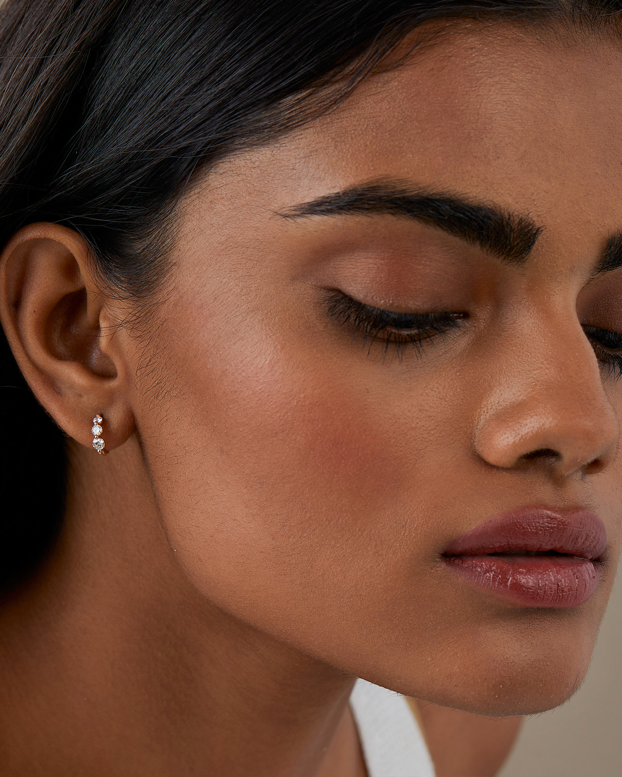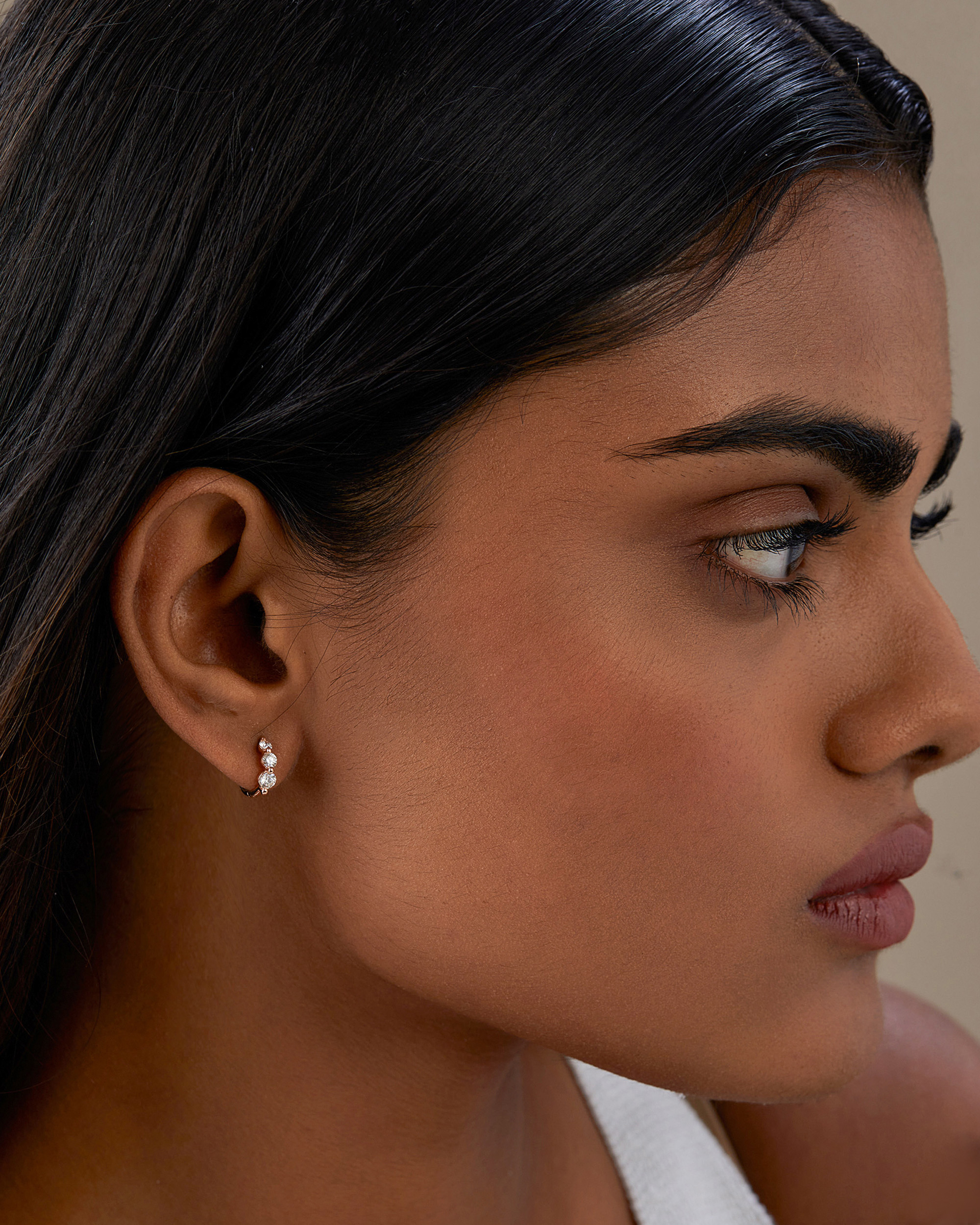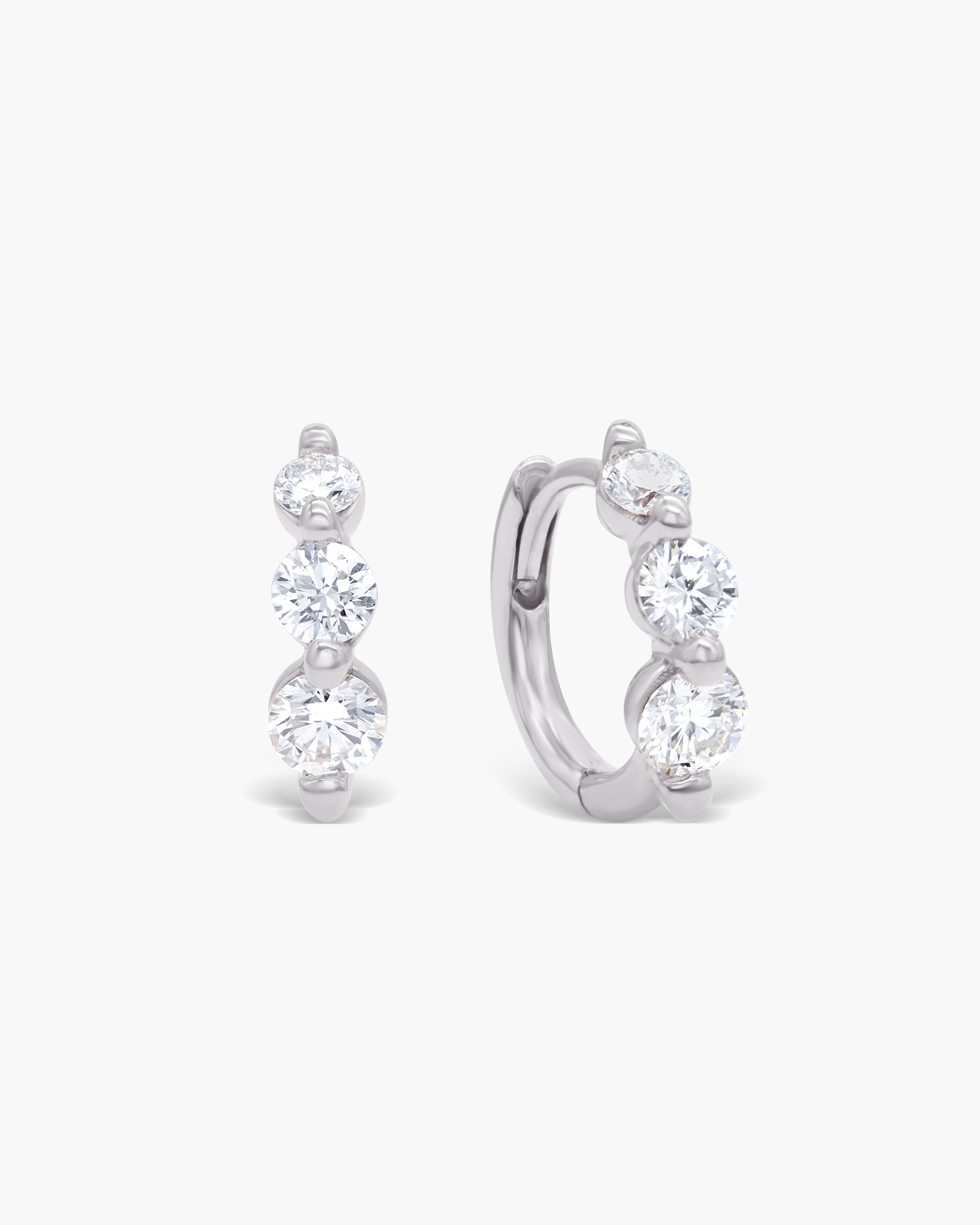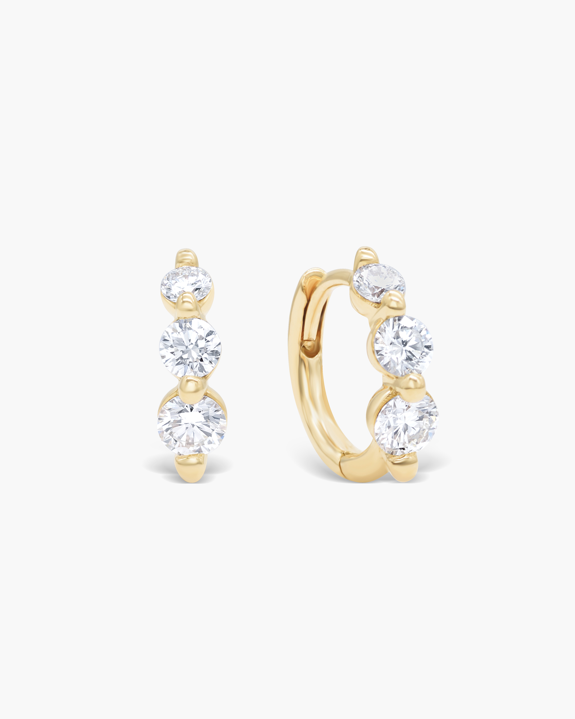 Perfect for day or night, these Graduated Diamond Huggie will never go out of style. Each earring showcases a row of prong set diamonds, artfully set to enhance size and sparkle, graduating in size from 12 cents at the base to the 5 cents at the top.
