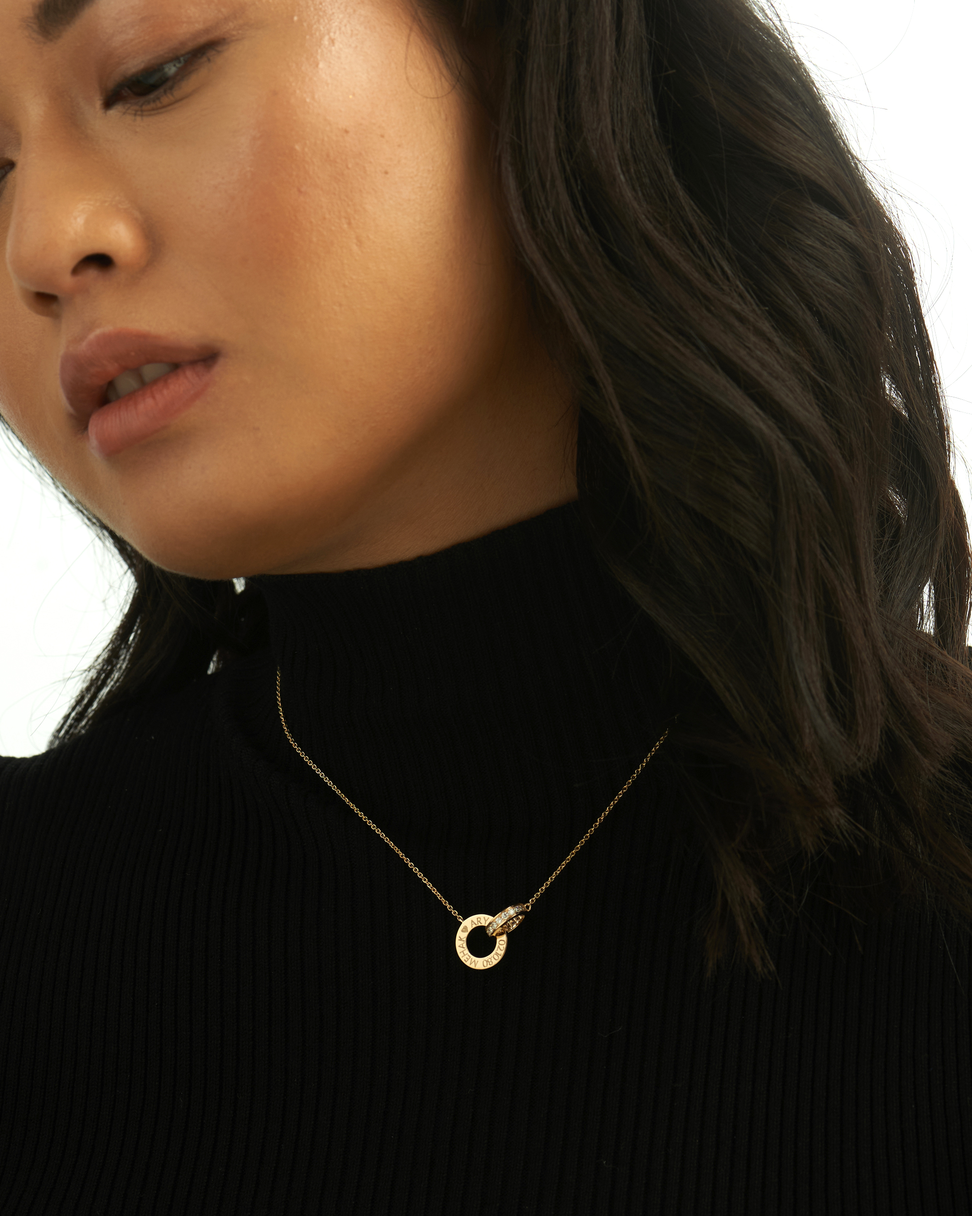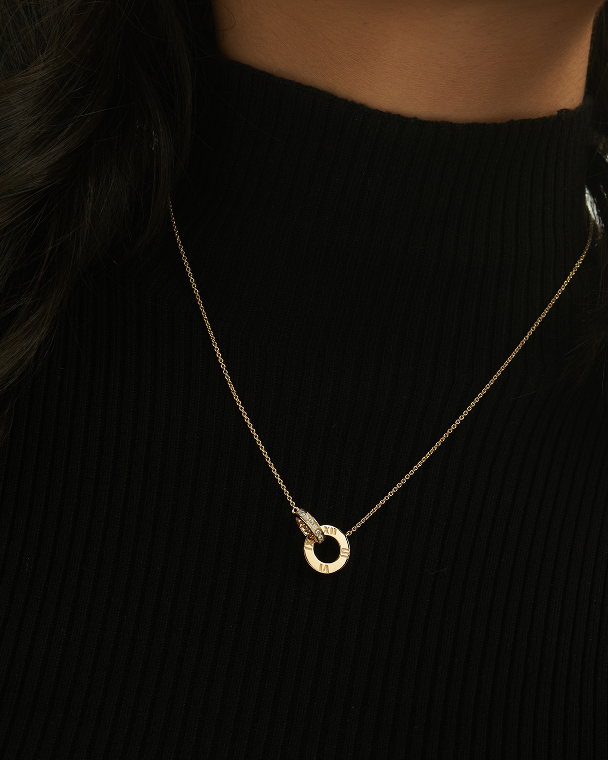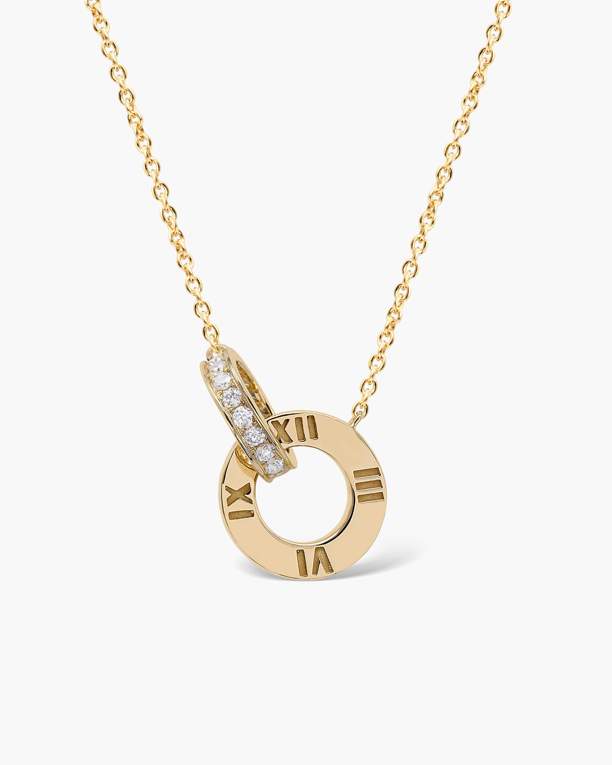 Symbolising the link between time and you, a timeless reminder of everlasting love and friendship. This Interlocked Diamond & Gold Engravable Circle Necklace has a bigger circle engraved with roman numbers and the smaller circle inlaid with natural diamonds.