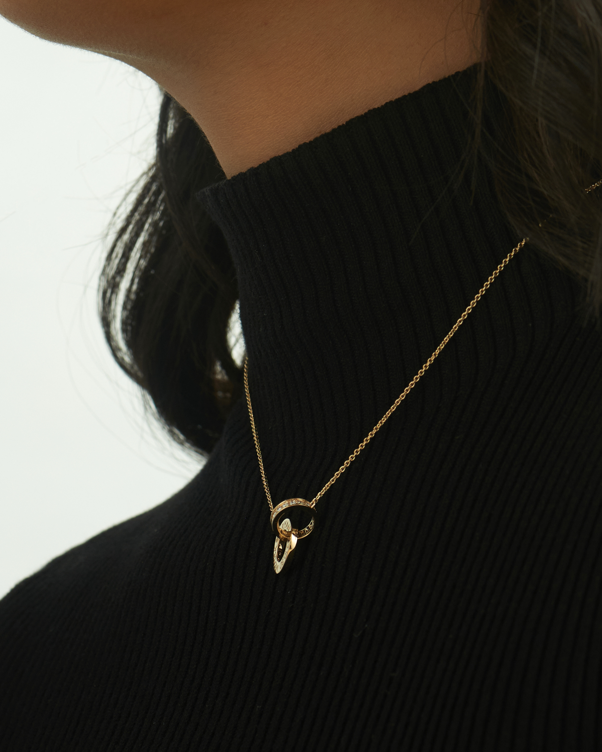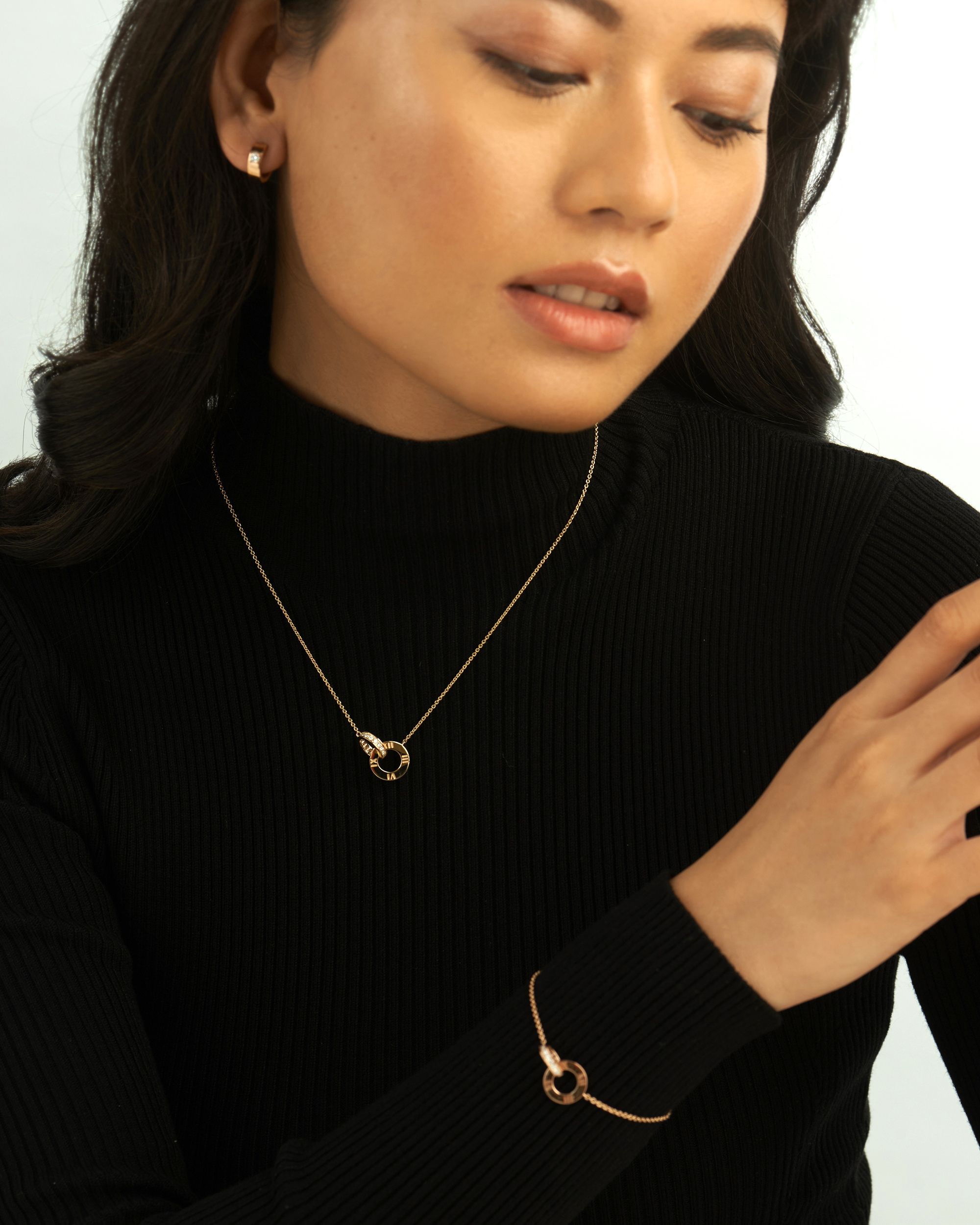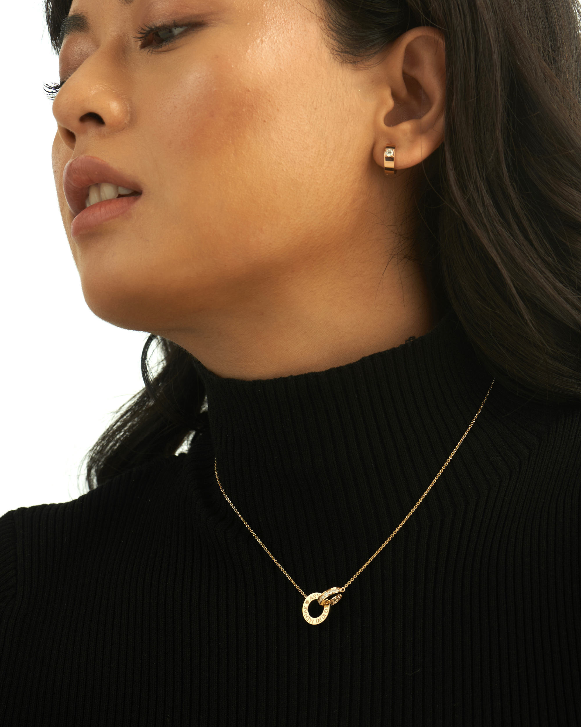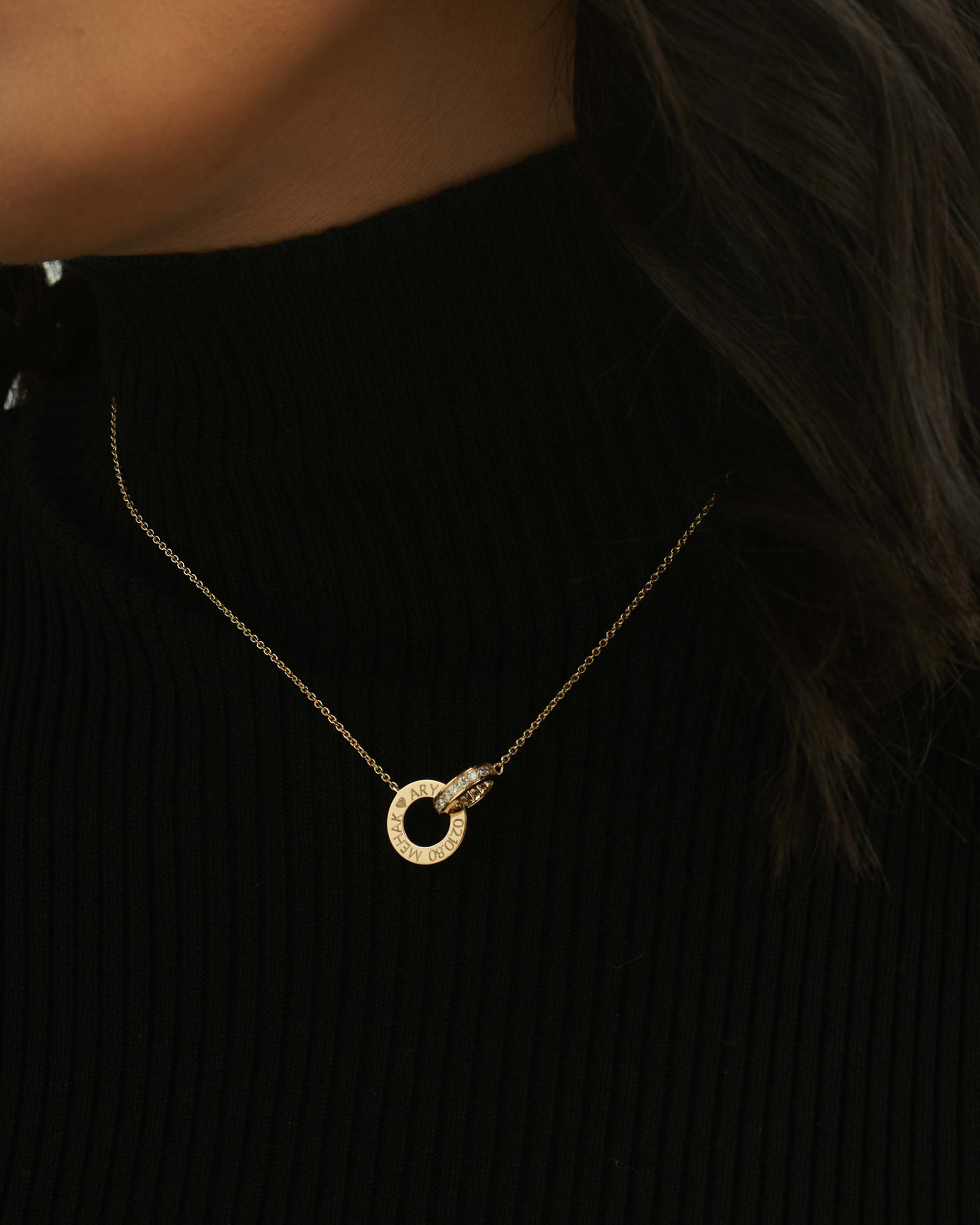 Symbolising the link between time and you, a timeless reminder of everlasting love and friendship. This Interlocked Diamond & Gold Engravable Circle Necklace has a bigger circle engraved with roman numbers and the smaller circle inlaid with natural diamonds.