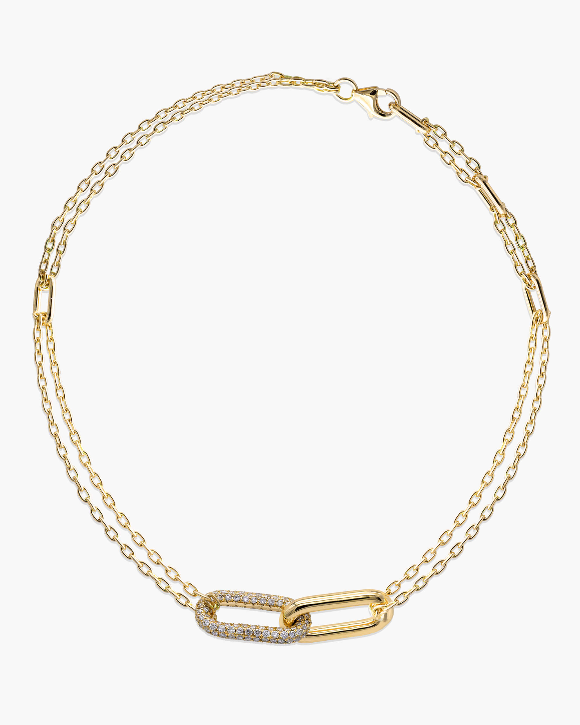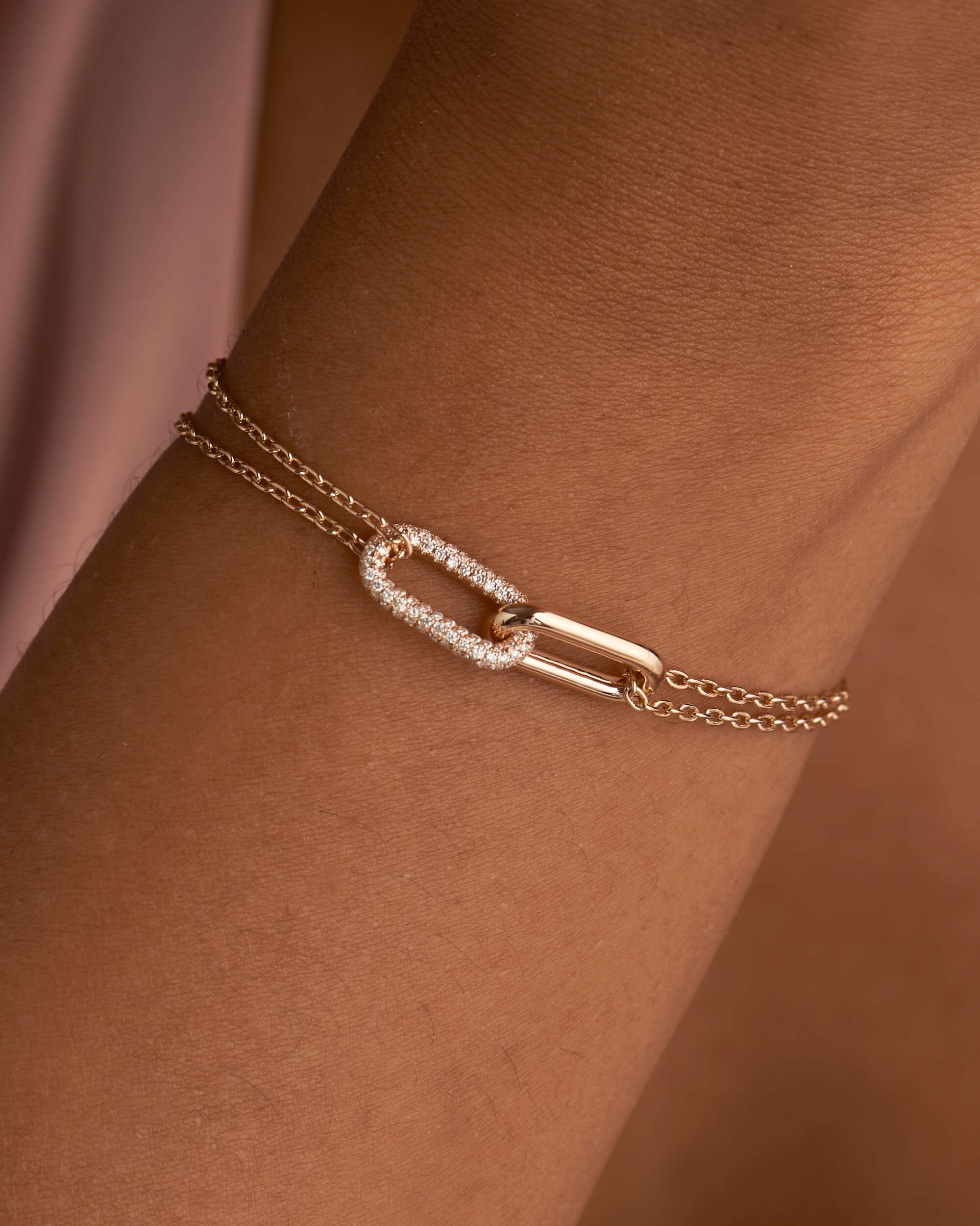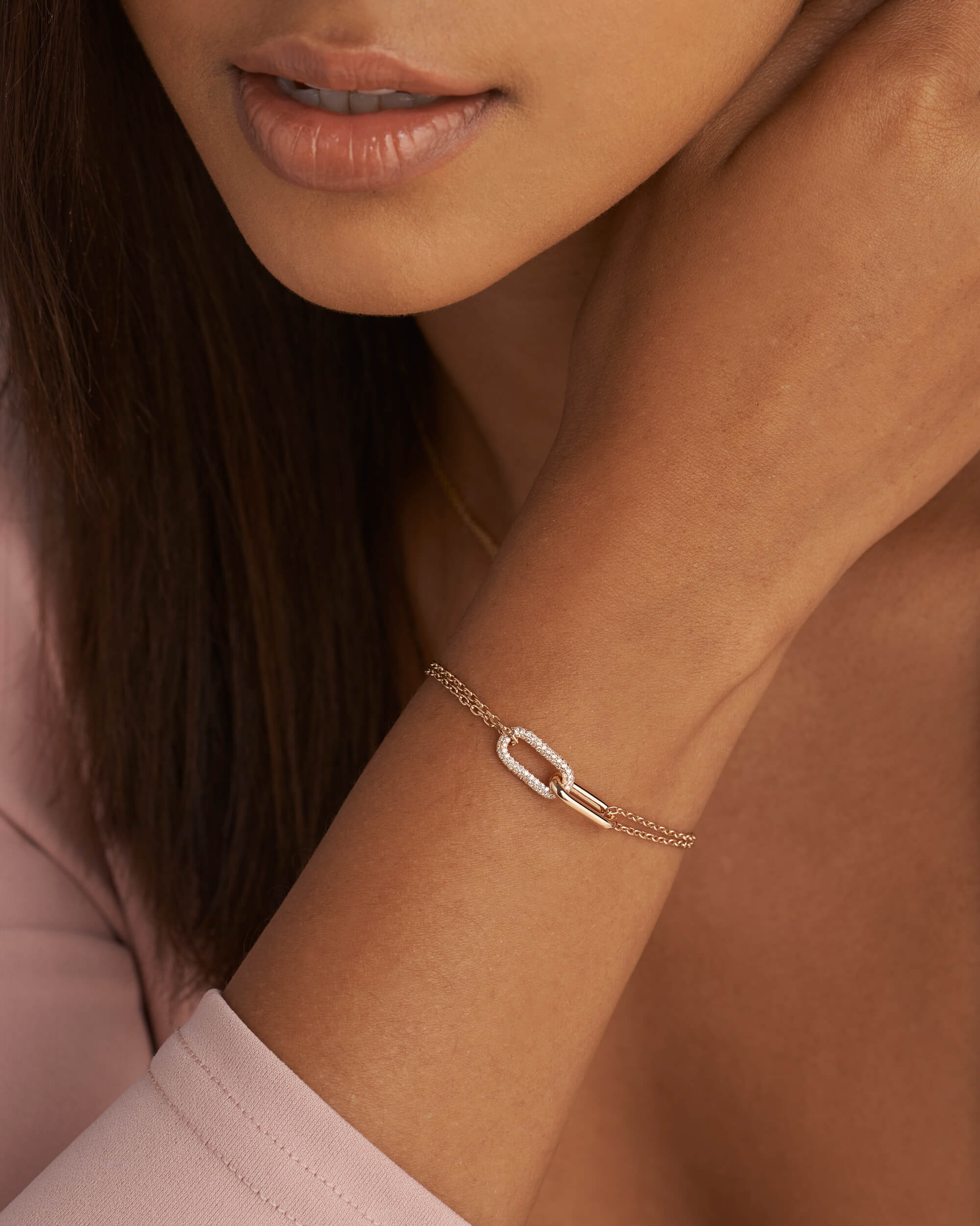 Make an opulent statement on special occasions with our Interlocked Gold & Diamond Paperclip Link Bracelet. Handcrafted in solid gold with a double cable chain bracelet with two solid interlocking links. One link is encrusted with sparkling diamonds and the other is finished with high polish.