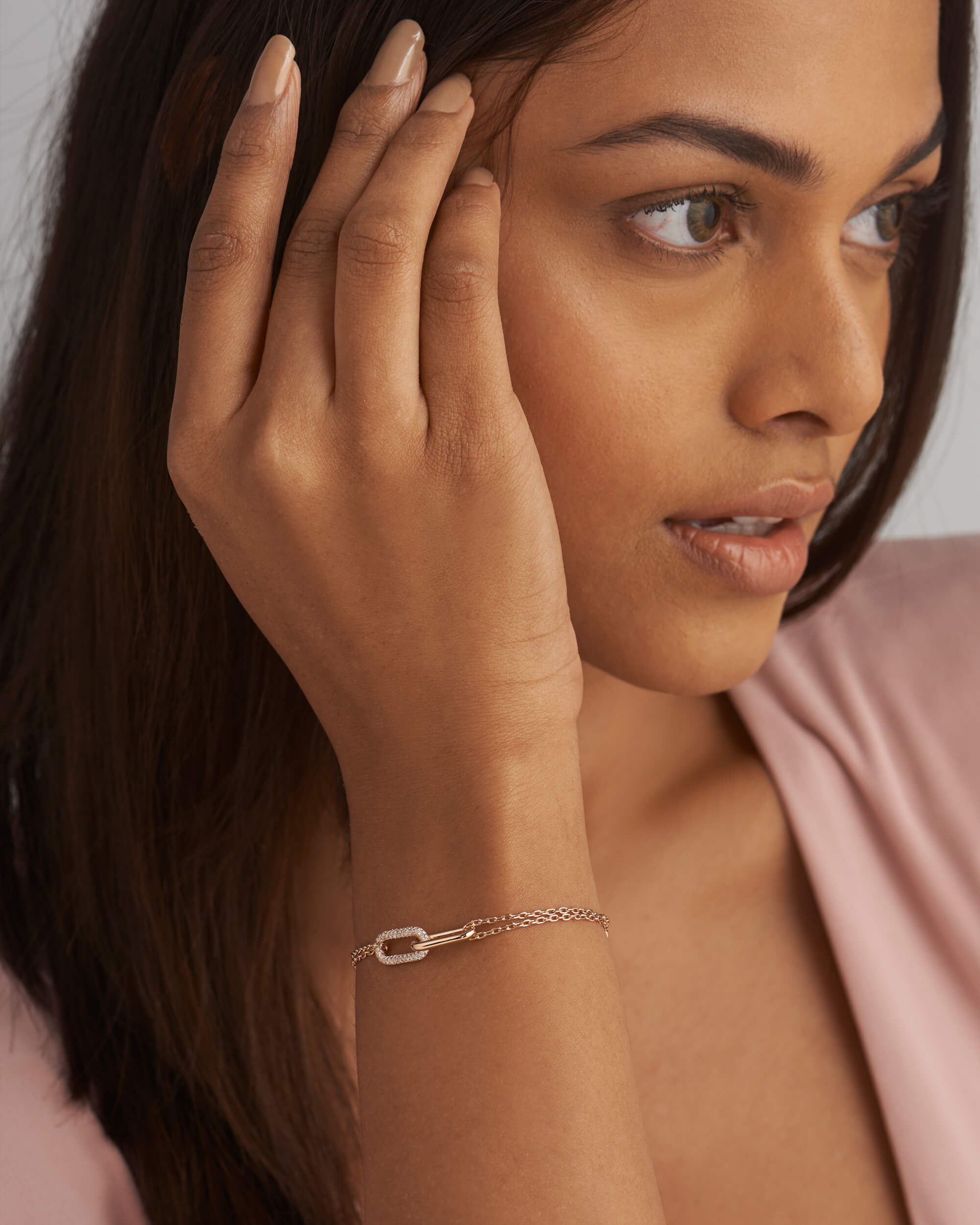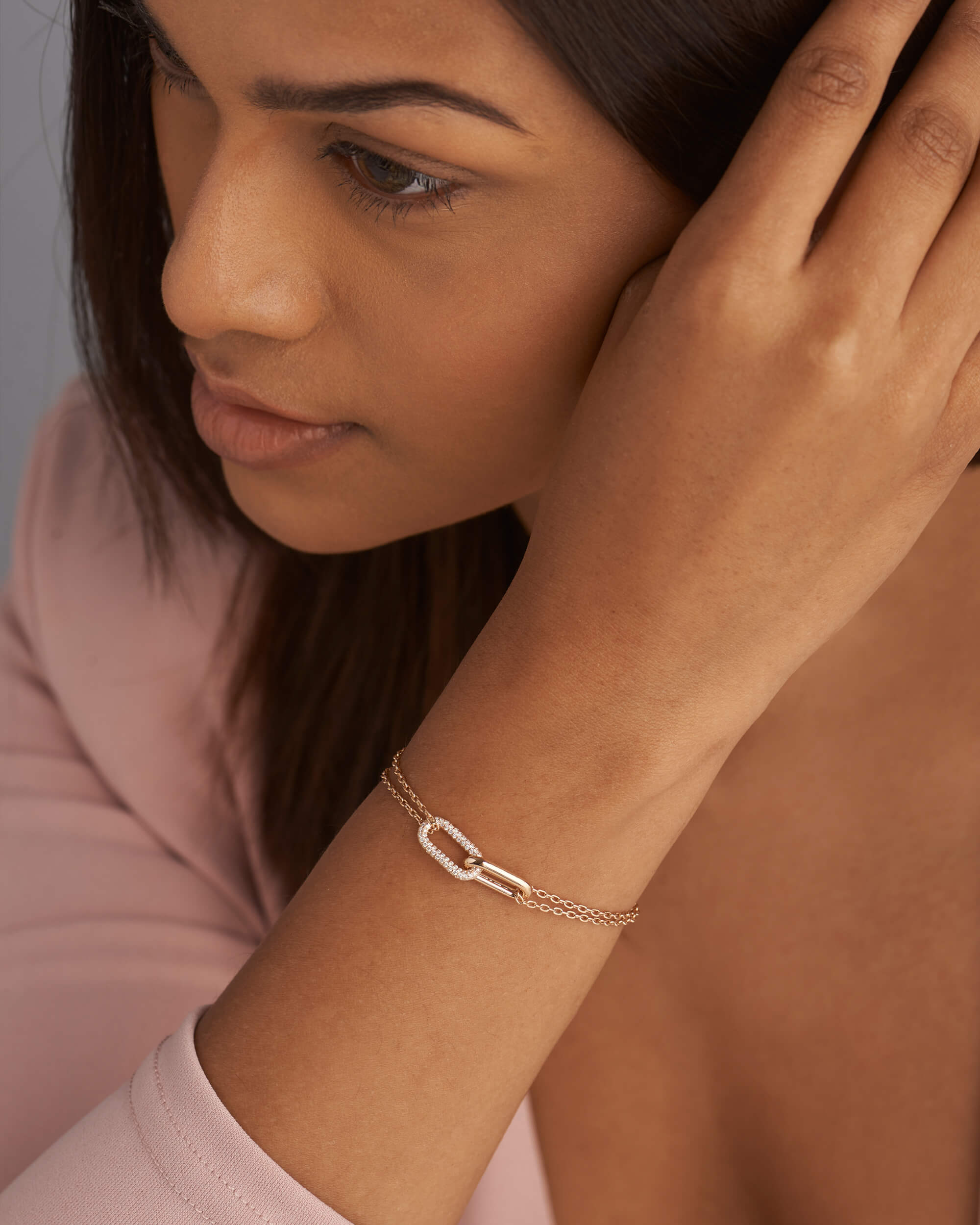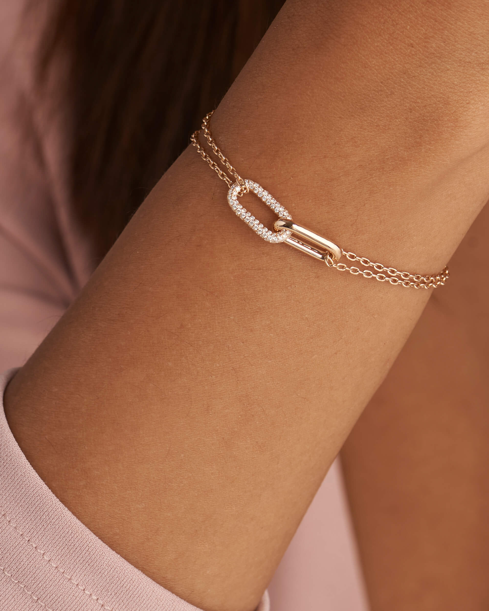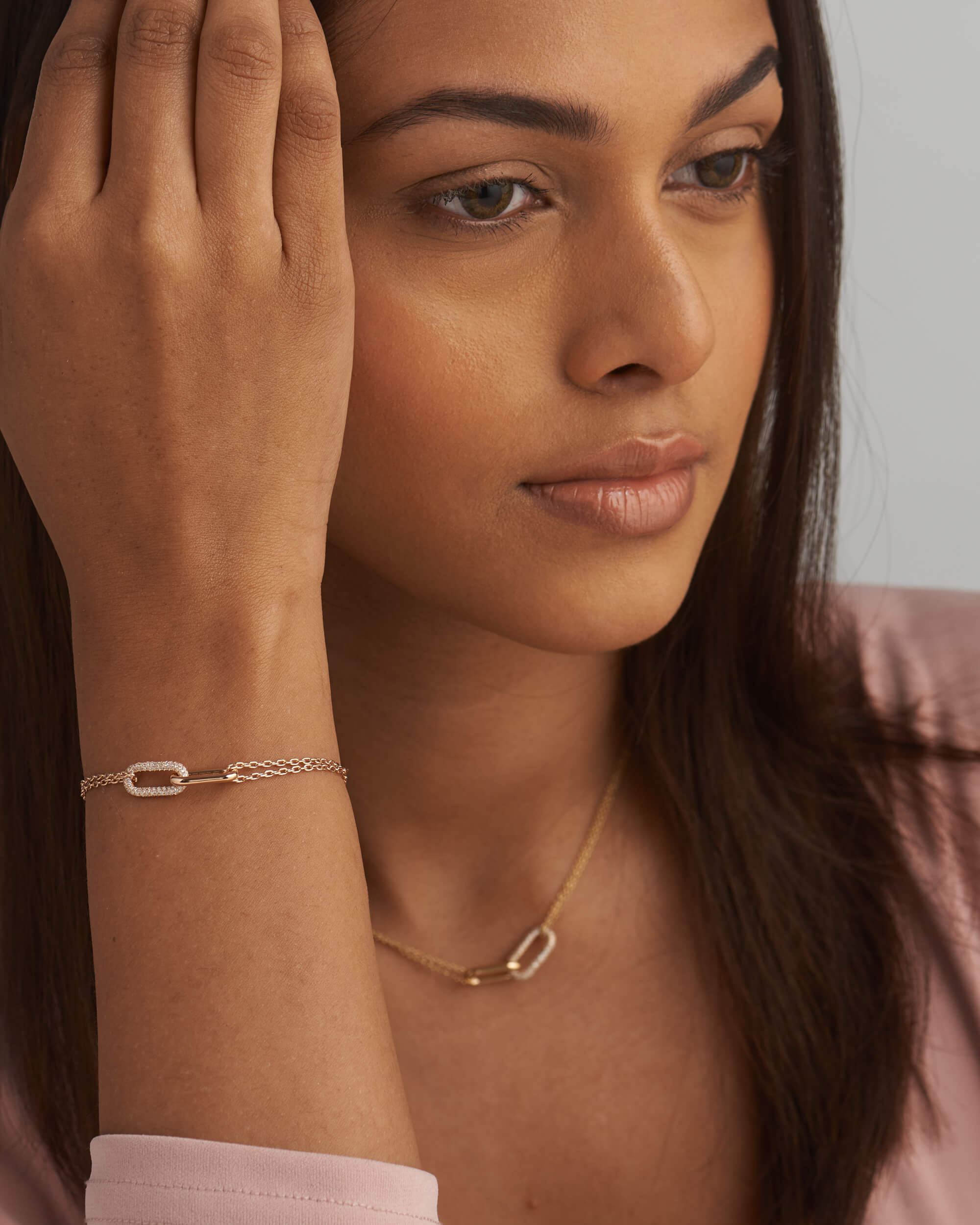 Make an opulent statement on special occasions with our Interlocked Gold & Diamond Paperclip Link Bracelet. Handcrafted in solid gold with a double cable chain bracelet with two solid interlocking links. One link is encrusted with sparkling diamonds and the other is finished with high polish.