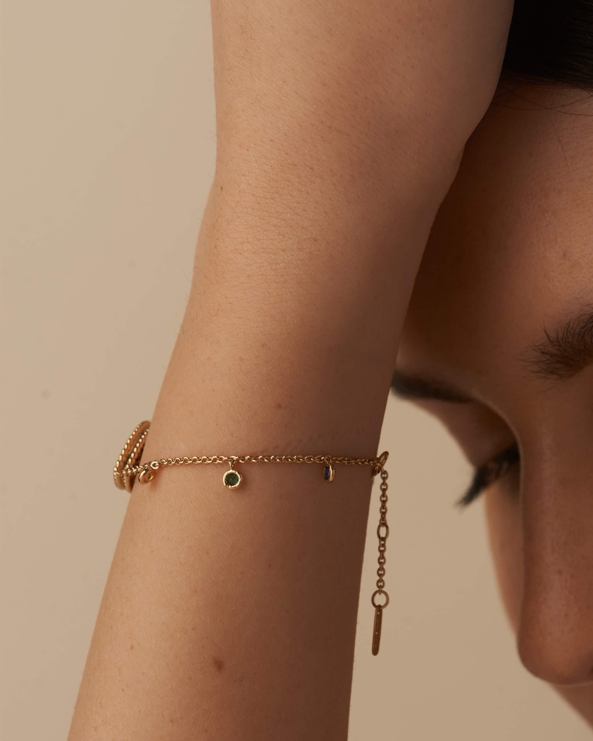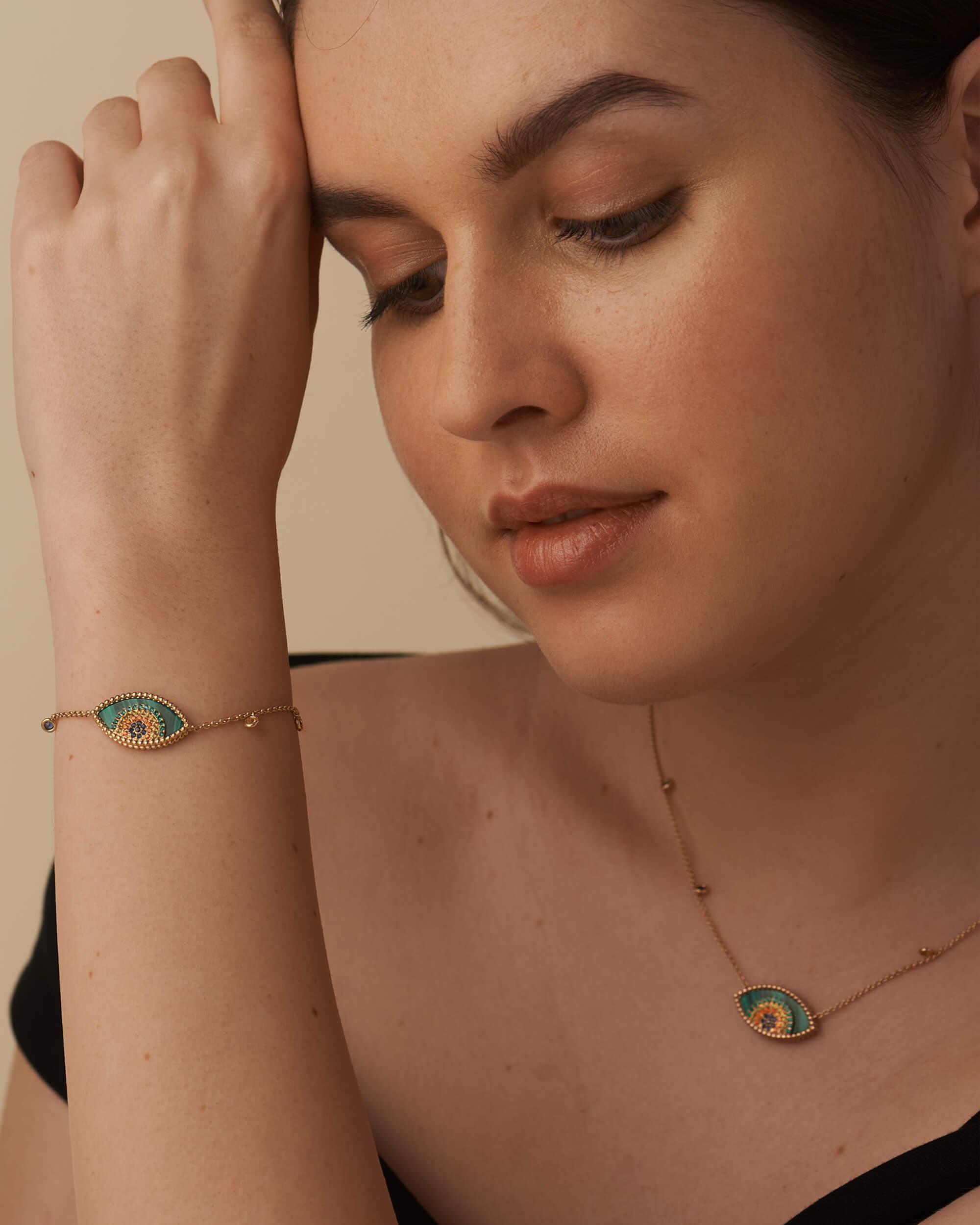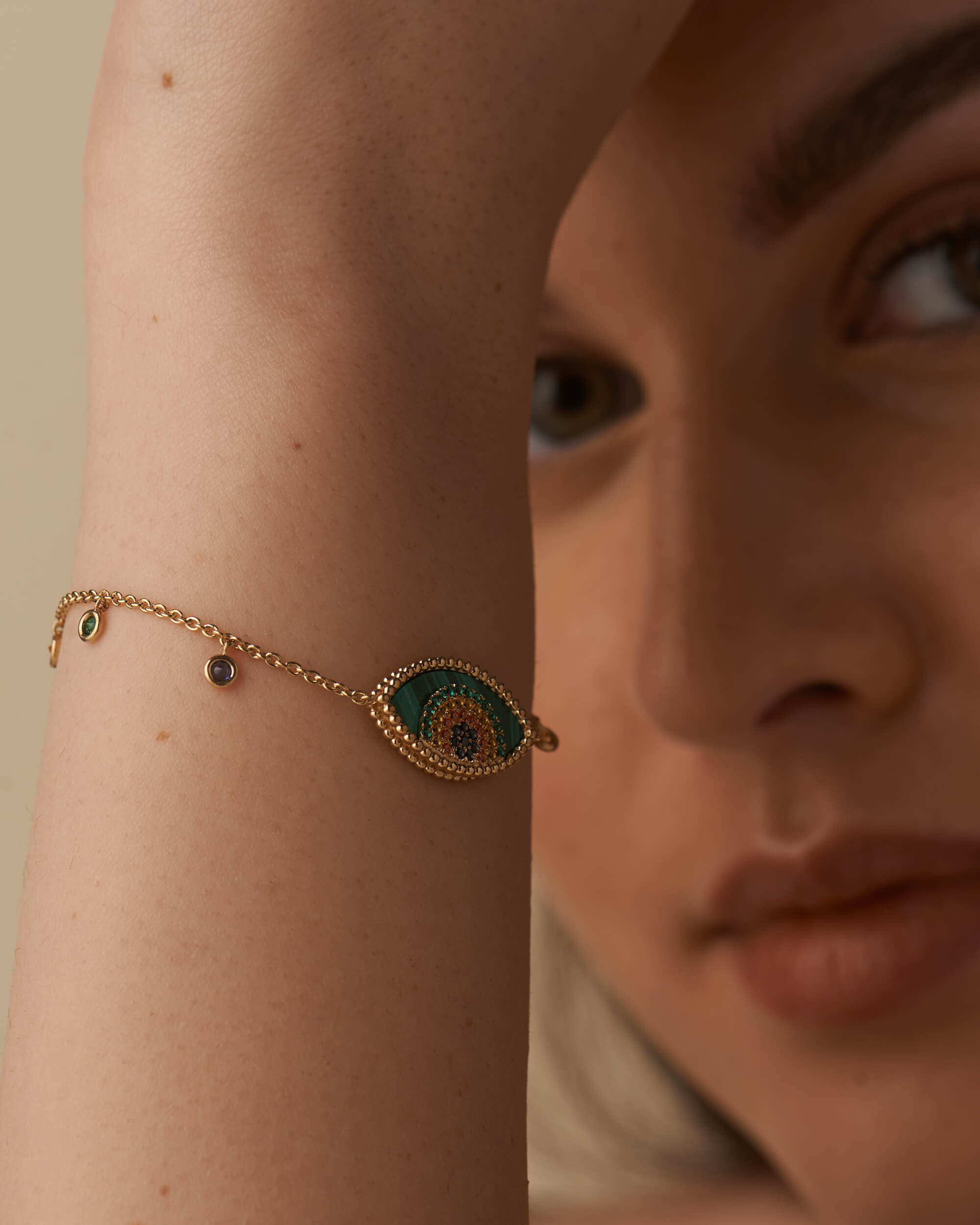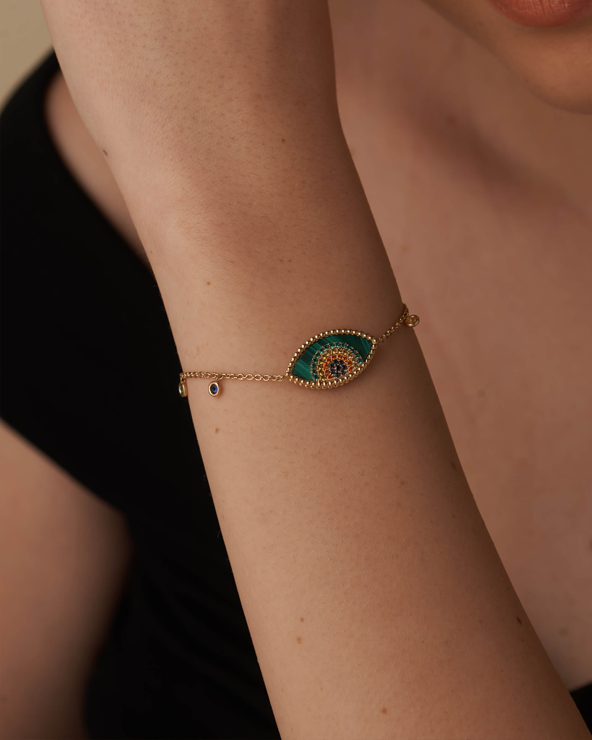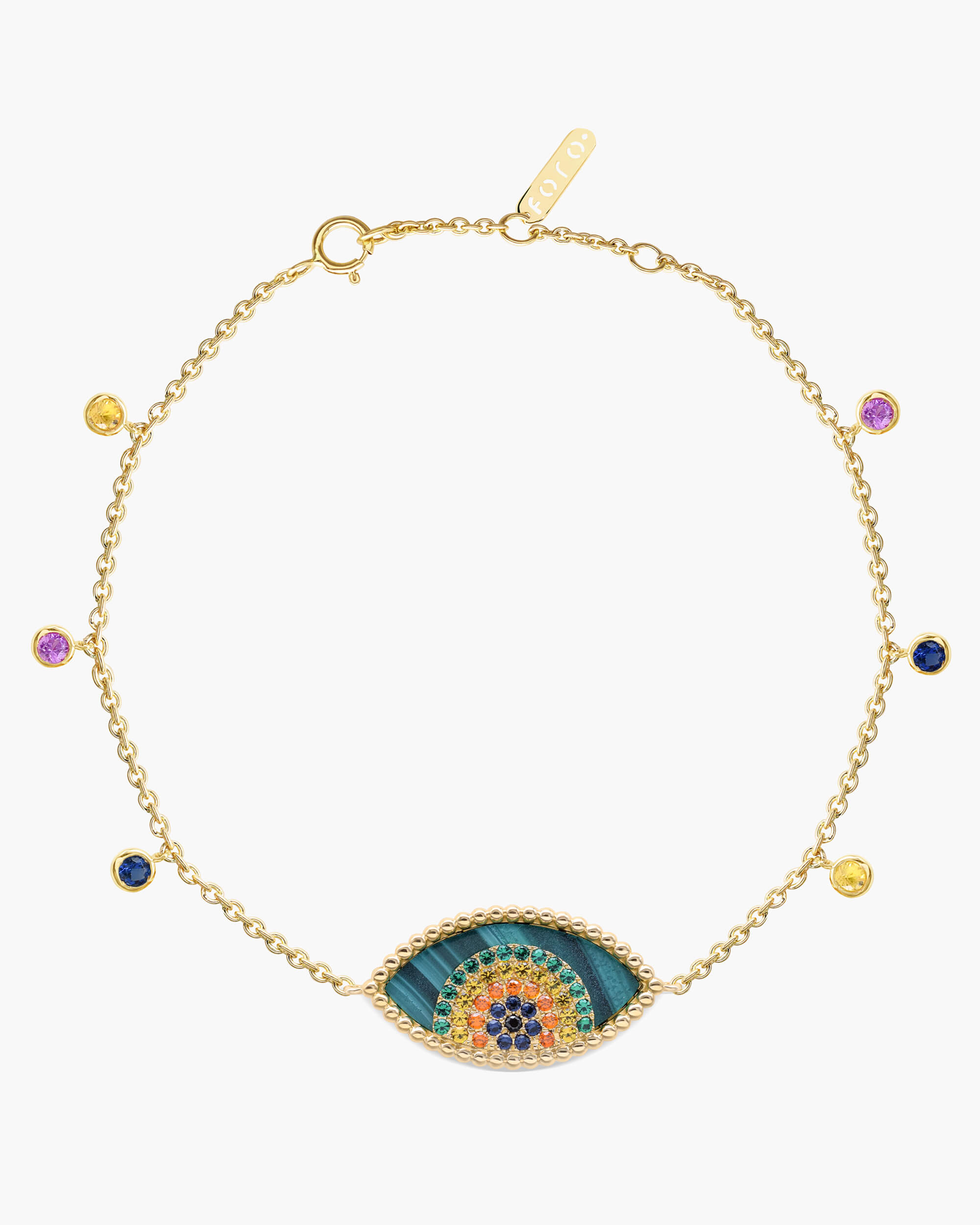 Amp up with our next generation evil eye collection. This Malachite & Gemstone Evil Eye Bracelet features malachite with a gold beaded frame .The pupil of the eye is detailed out with vibrant synthetic gemstones, which are embedded in the malachite, to add the perfect splash of colours. The bracelet has dangling bezel set synthetic gemstones at intervals. The rear side of the motif features an intricate filigree gold detailing.