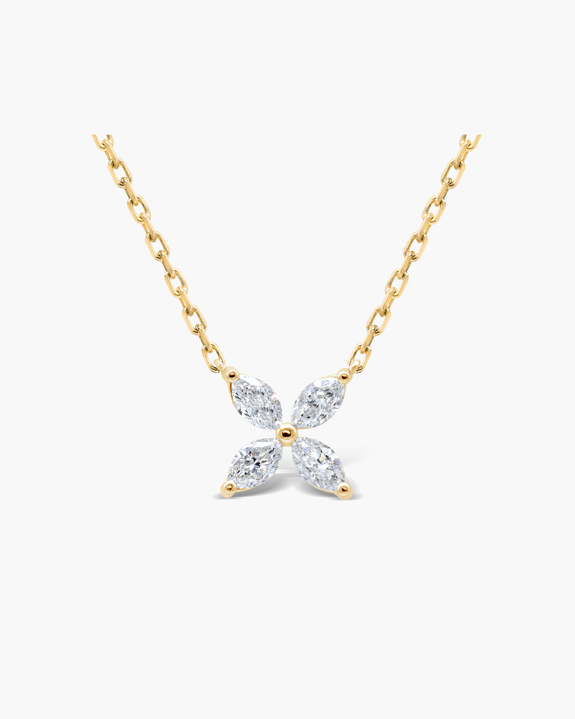 This elegant and classic Marquise Diamond Flower Necklace would be perfect to wear everyday. Featuring a 4 petal sparkling flower, designed as a cluster with marquise shape diamonds (approx. 15 cent each), all set in solid gold.