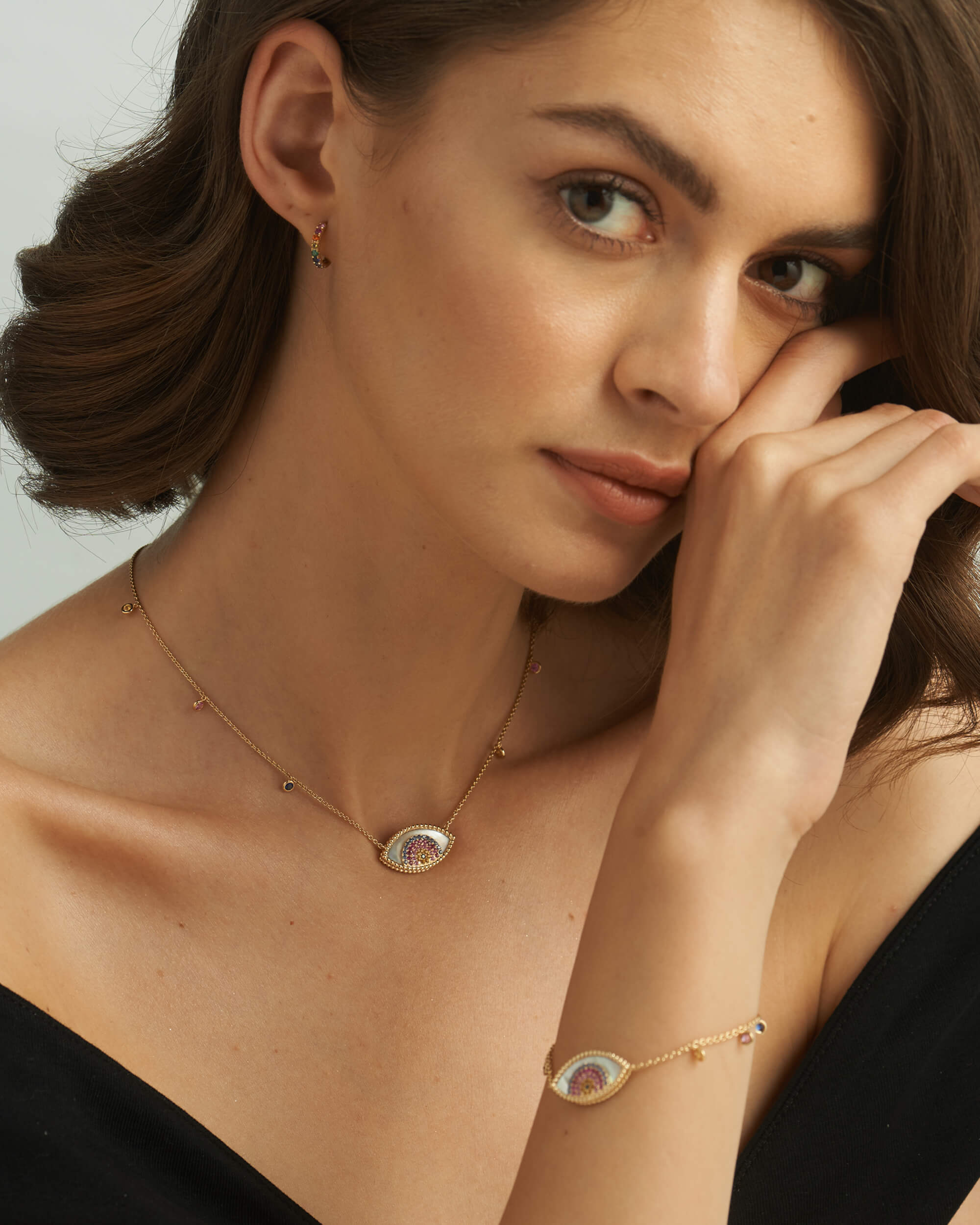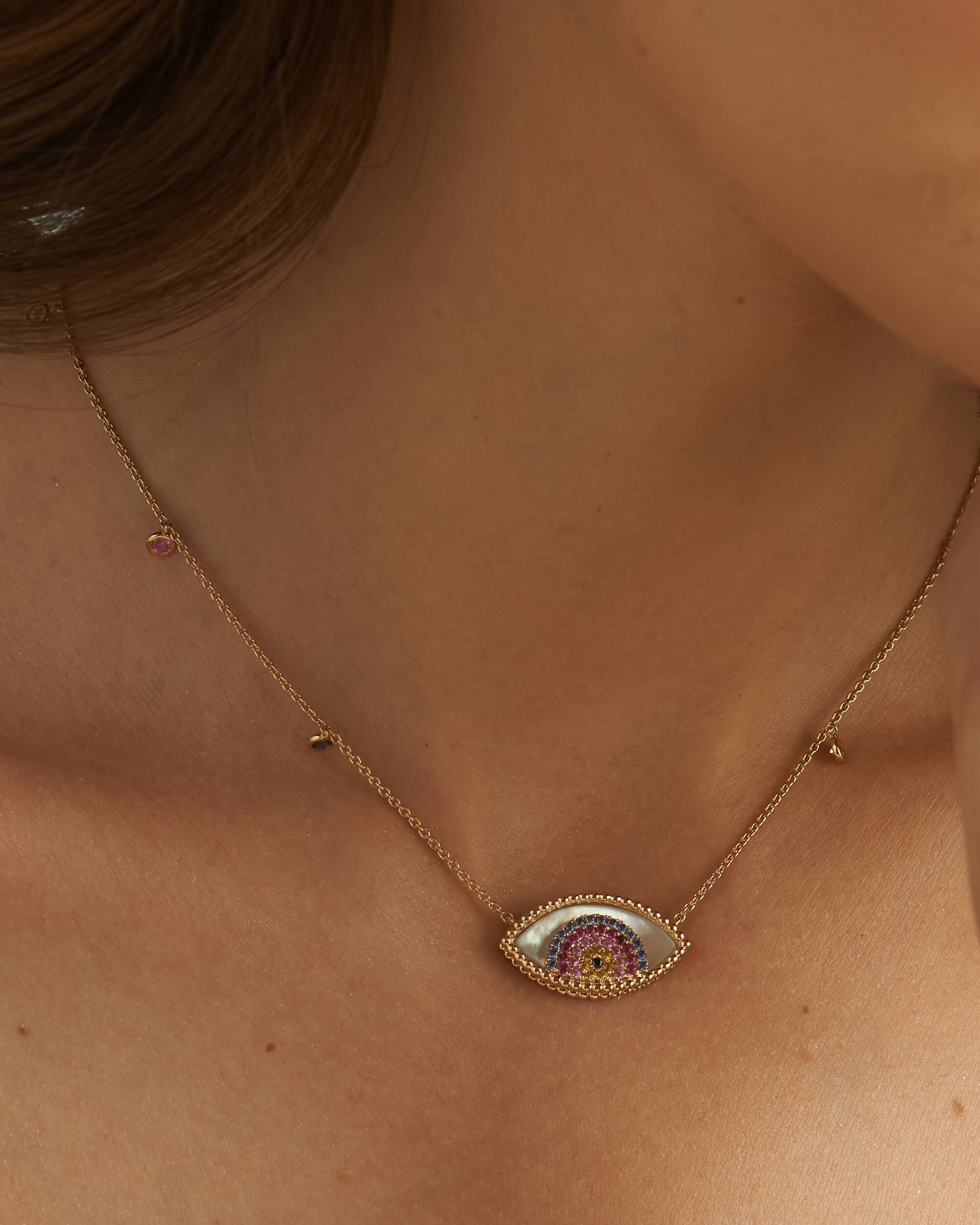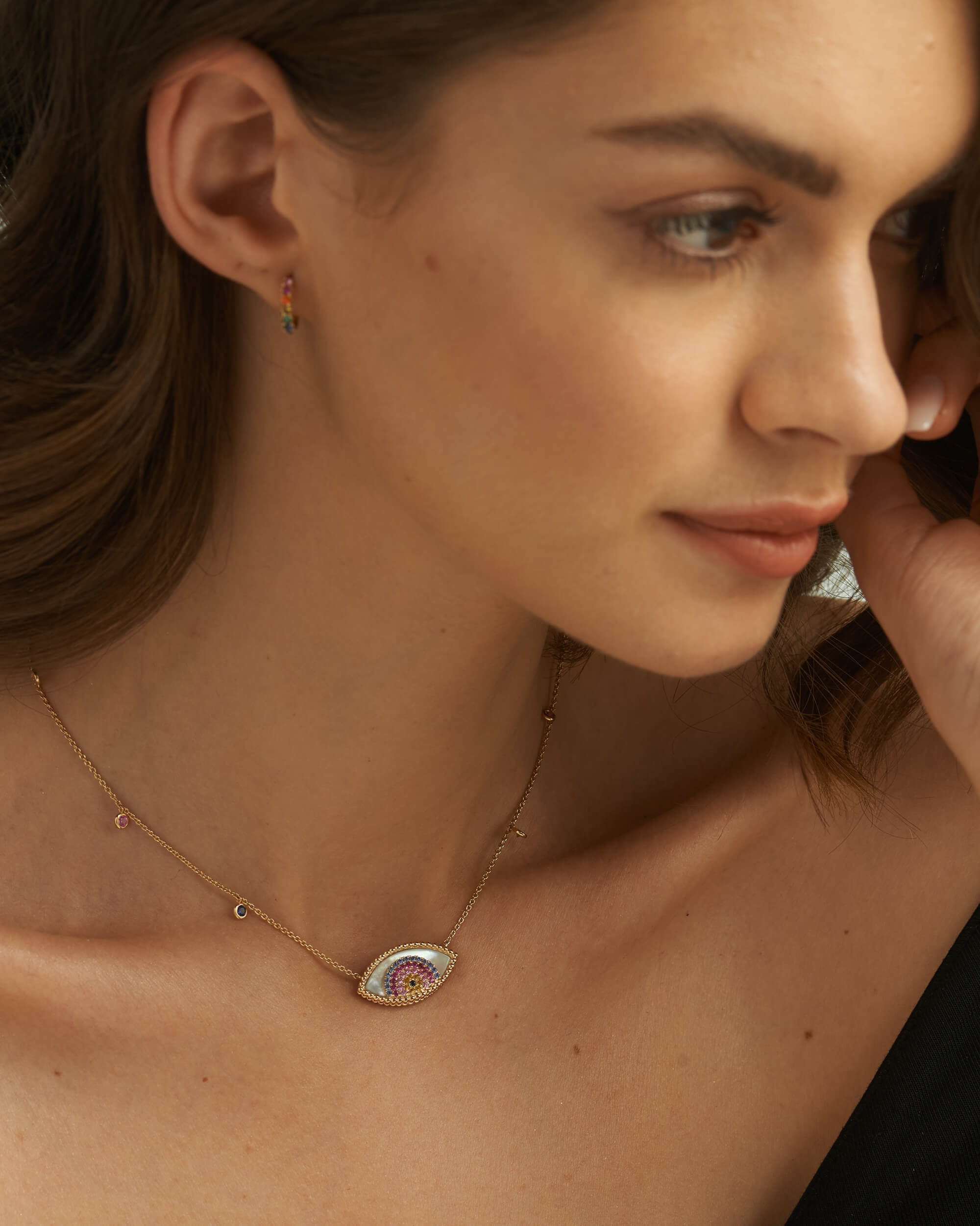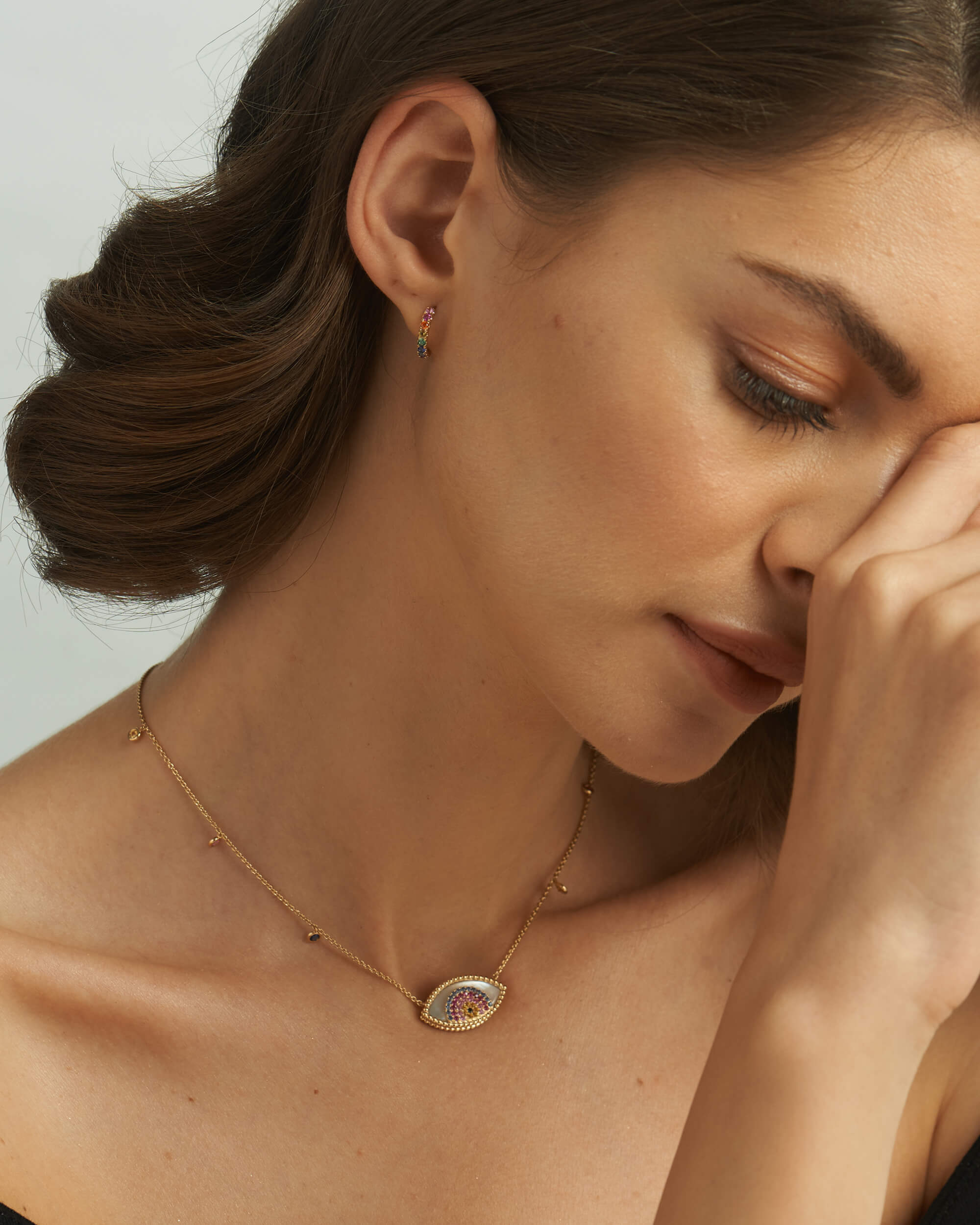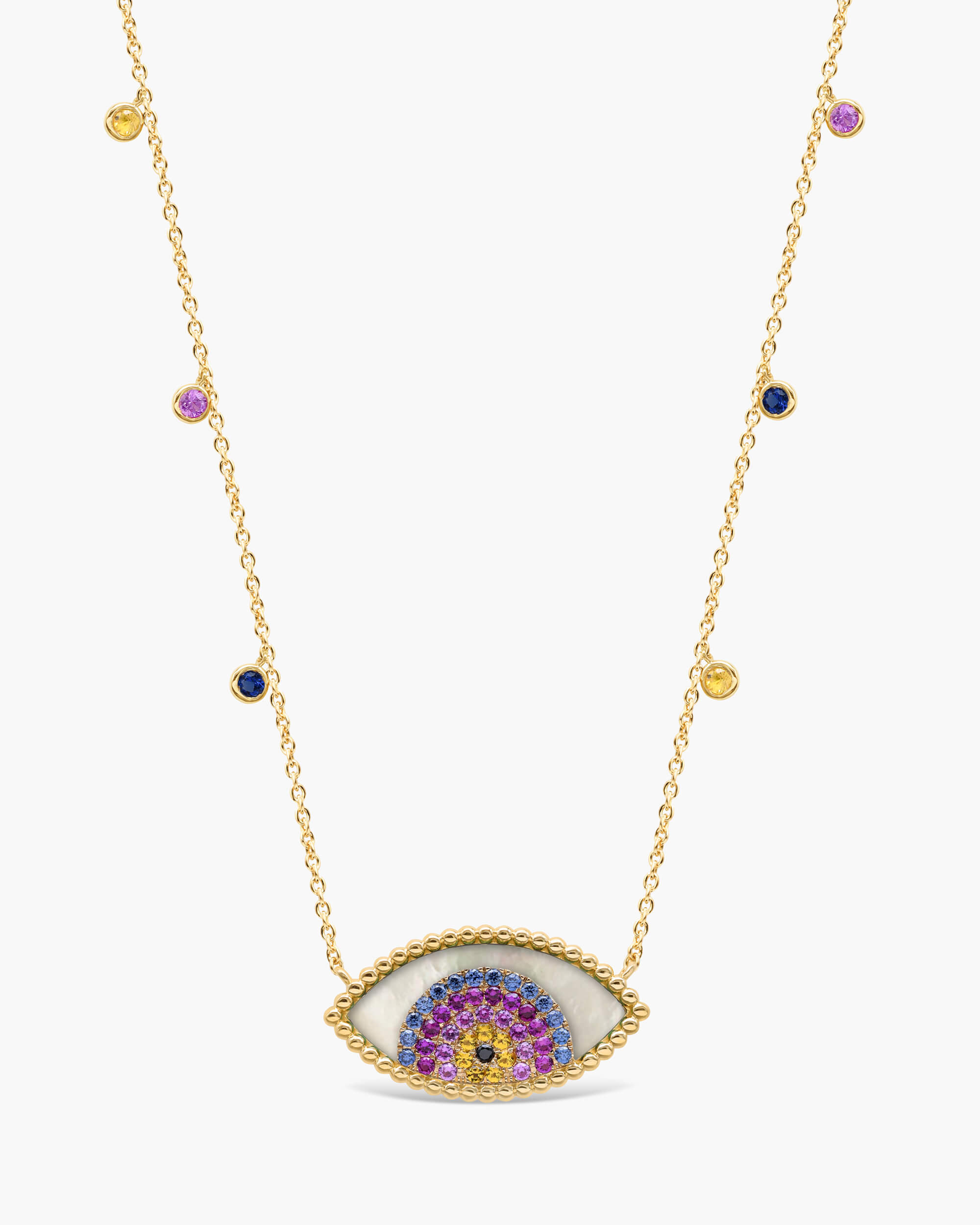 A powerful statement piece and a perfect alternative to the traditional evil eye. This white Mother of Pearl Gemstone Evil Eye Necklace features a white natural MOP with a gold beaded frame . The pupil of the eye is detailed out with vibrant synthetic gemstones, which are embedded in the MOP, to add the perfect splash of colors. The necklace has dangling bezel set synthetic gemstones at intervals. The rear side of the pendant features an intricate filigree gold detailing.