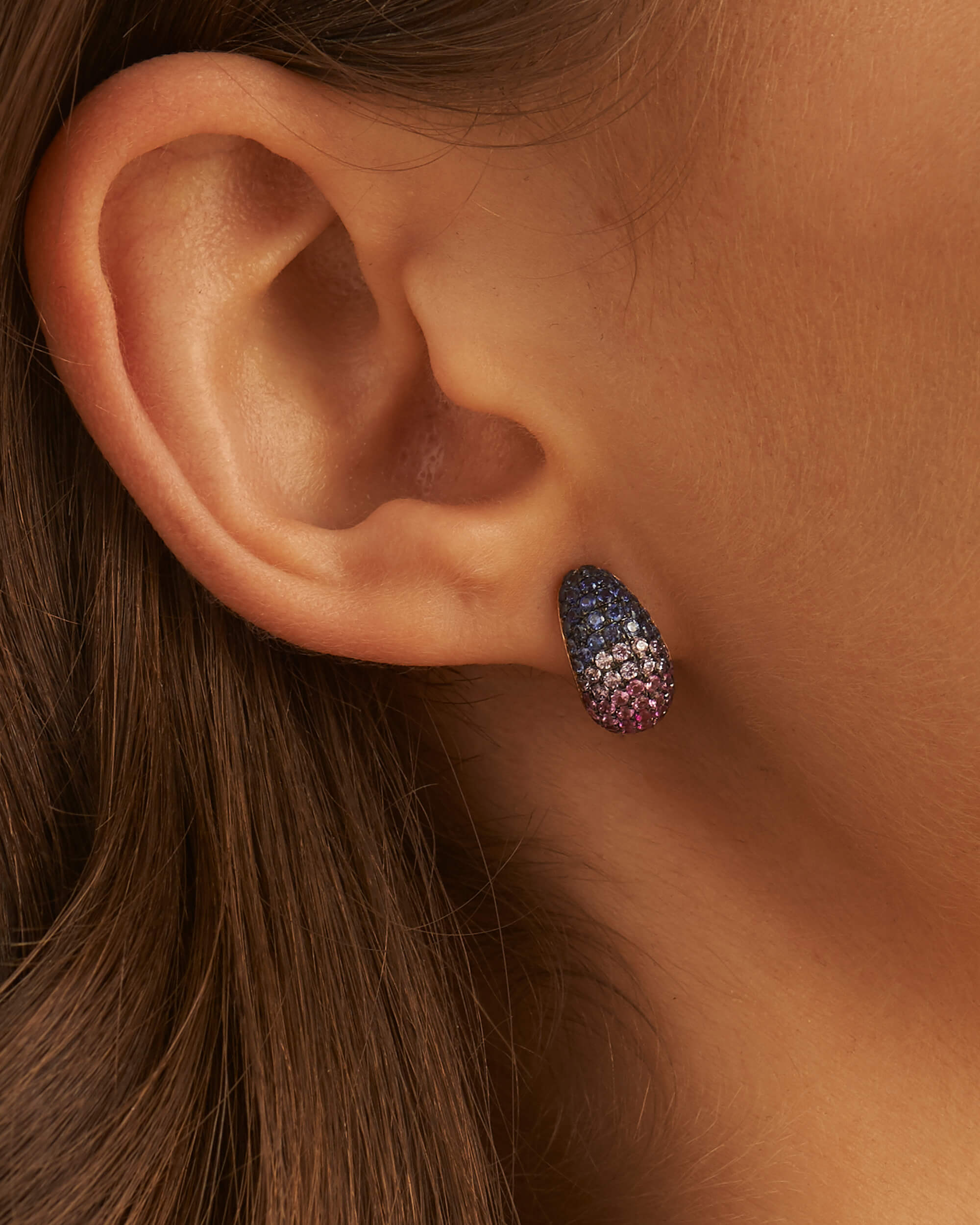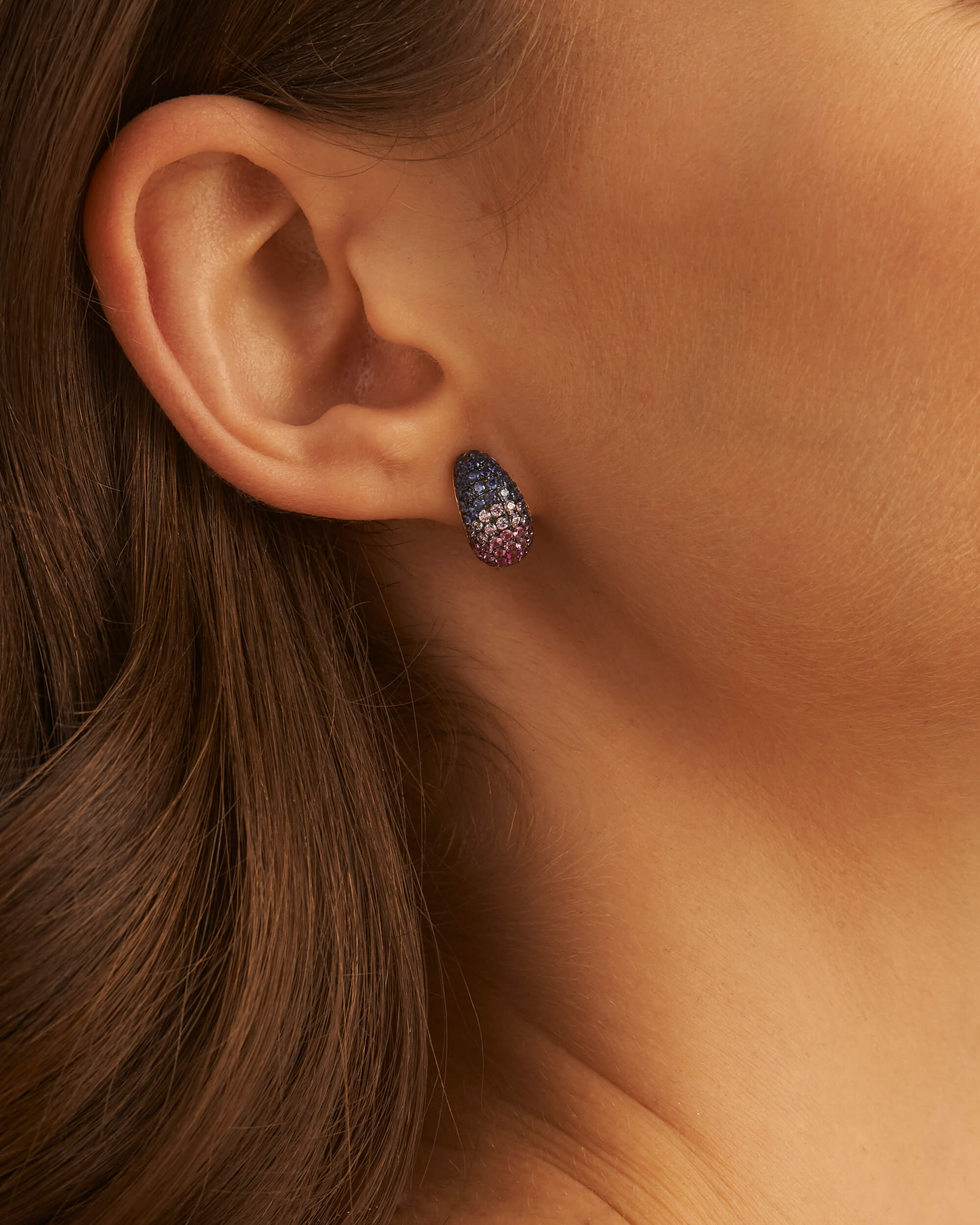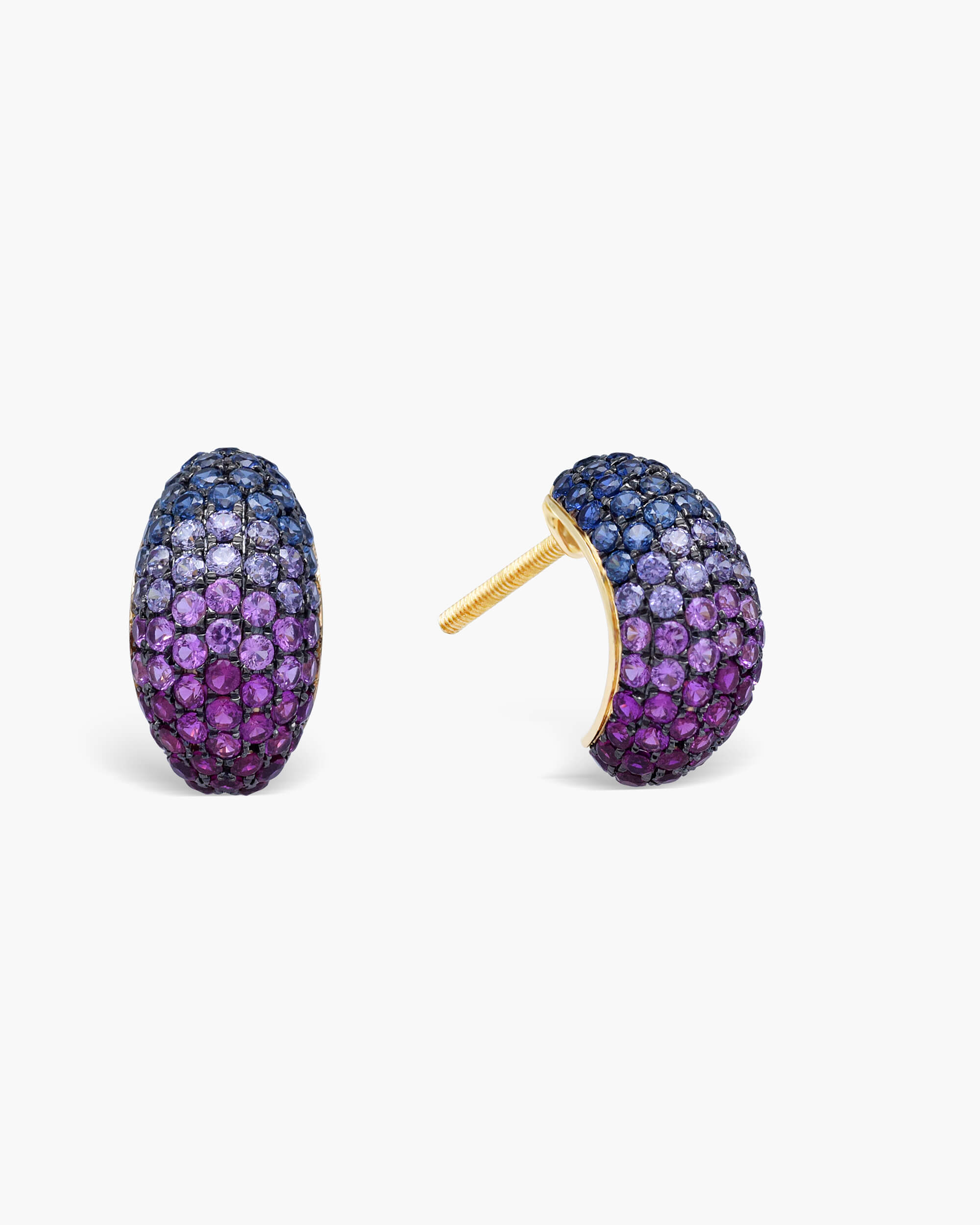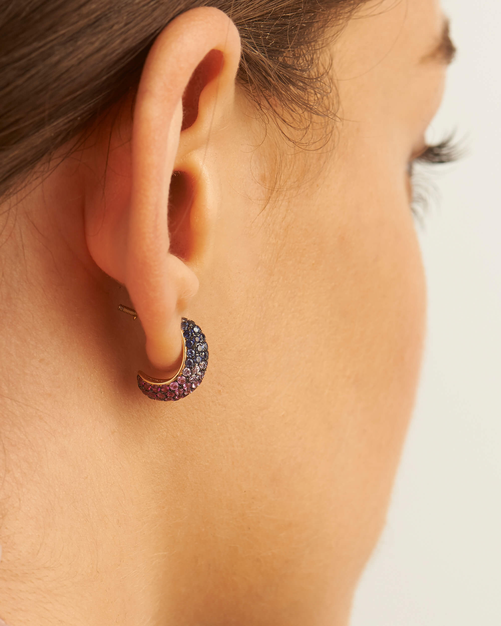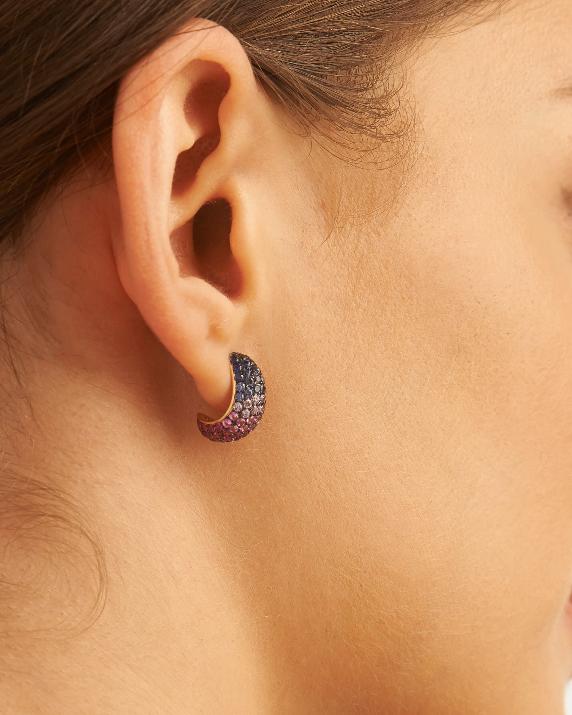 Brighten your look and add an array of colours with our Multicolour Dome Huggies. Handcrafted in solid gold and studded with coloured round synthetic gemstones in gradient shades of red and blue.