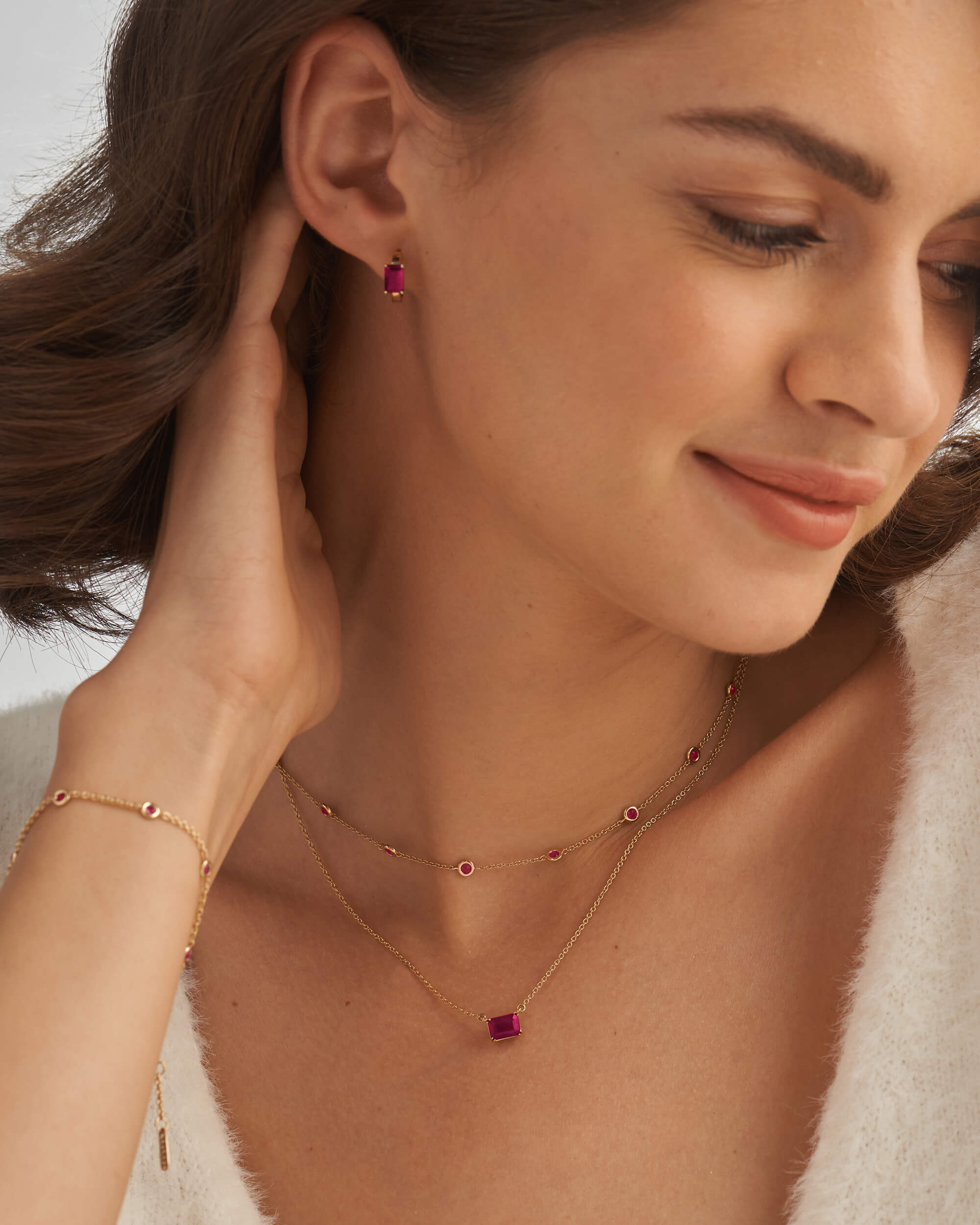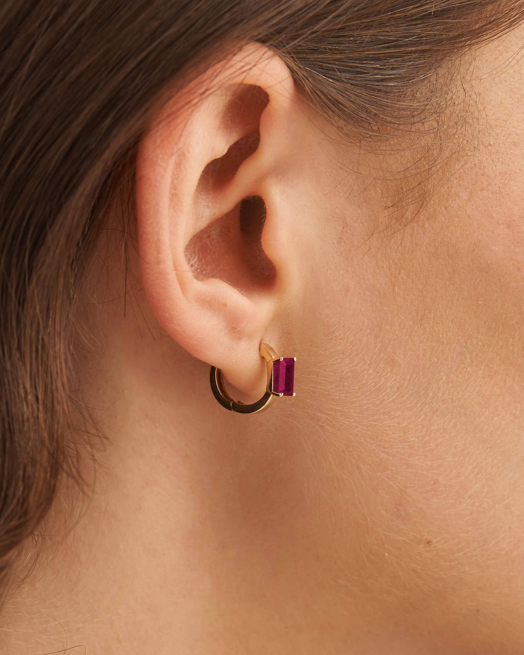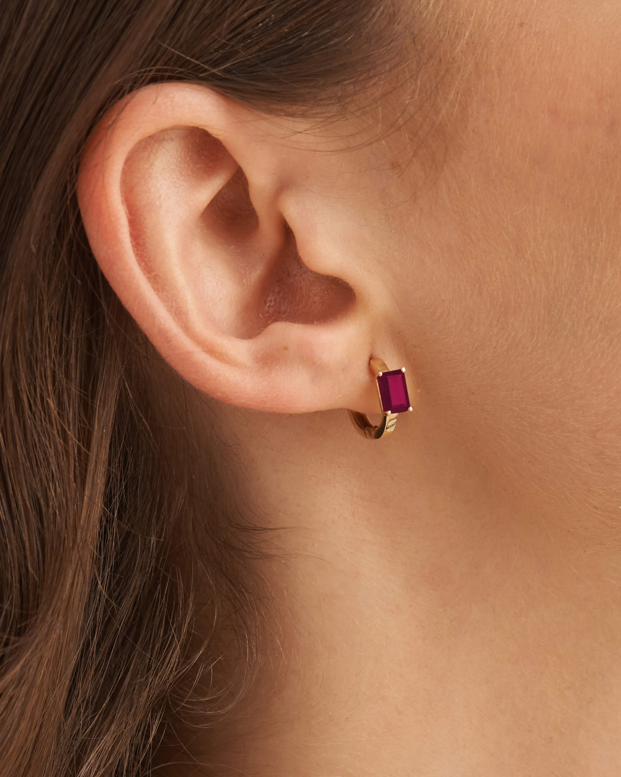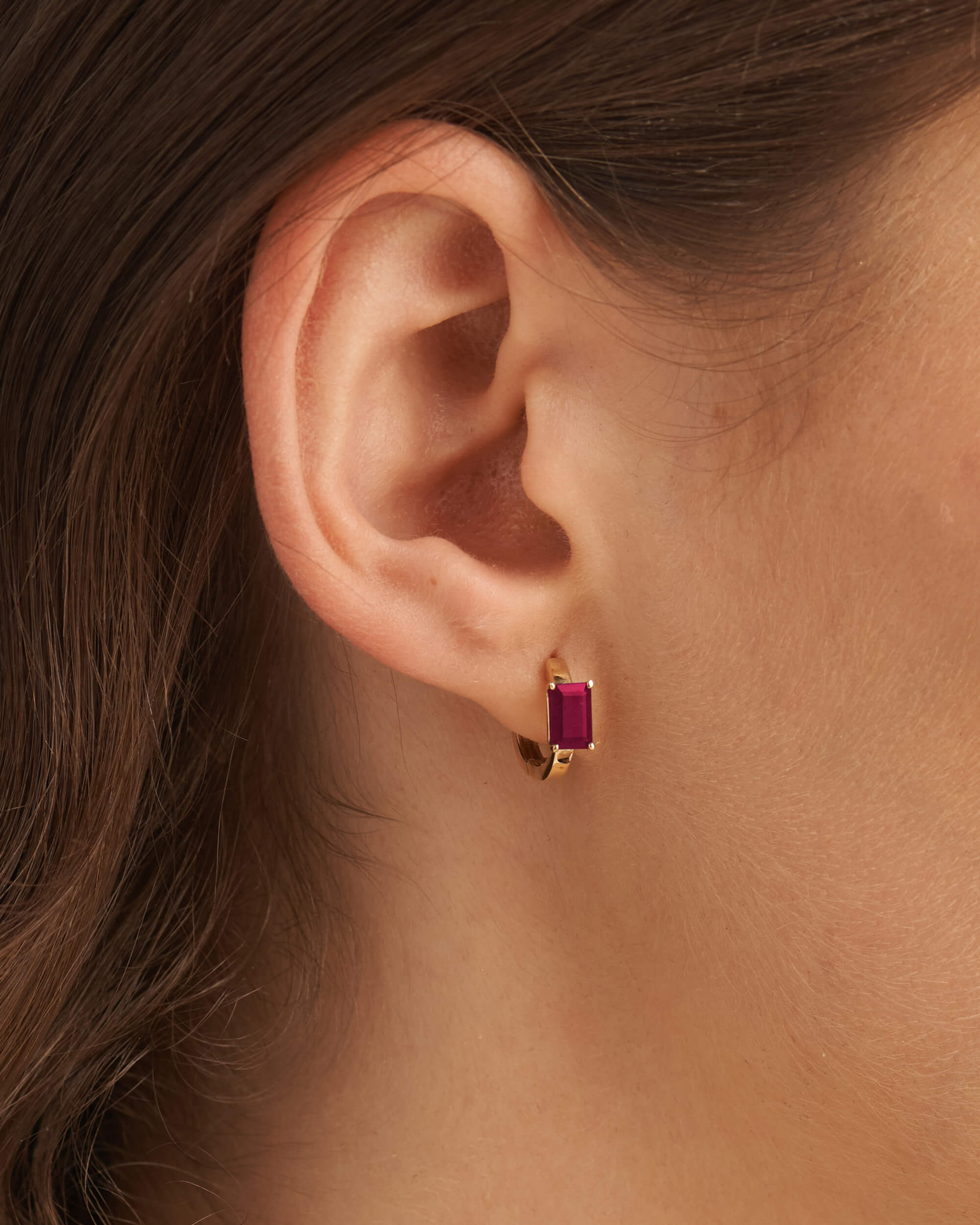 A contemporary take to timeless classic hoops. Adorn with this symbol of passion, protection, and wealth. This Octagon-cut Ruby Huggies features natural ruby (weigh approximate 0.5 ct each) set within a sleek four claw setting and fixed to our solid gold hoops.