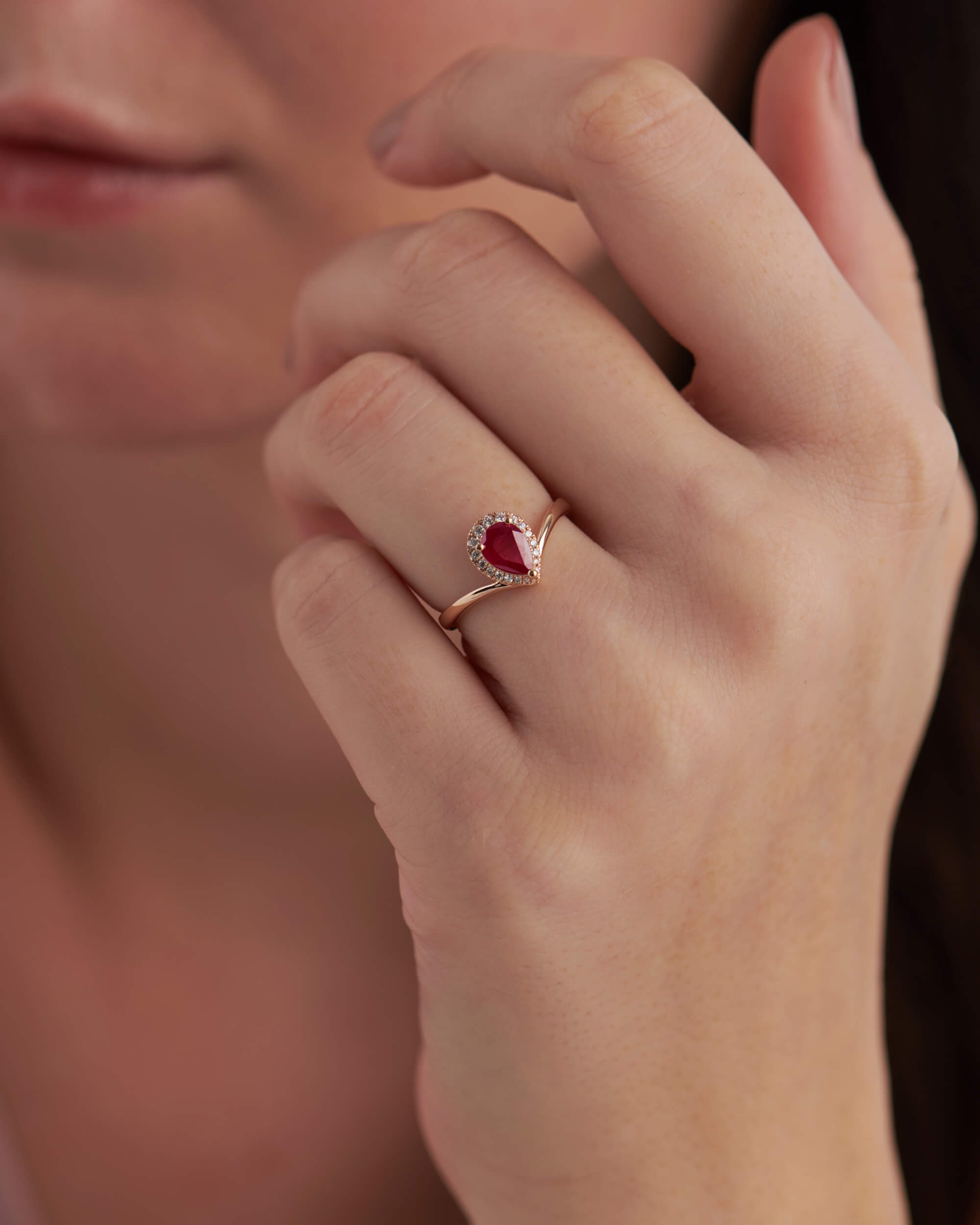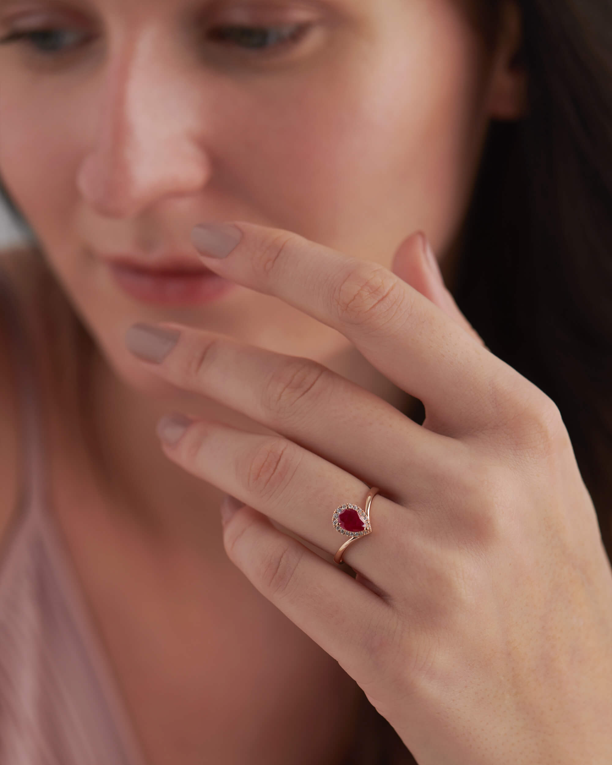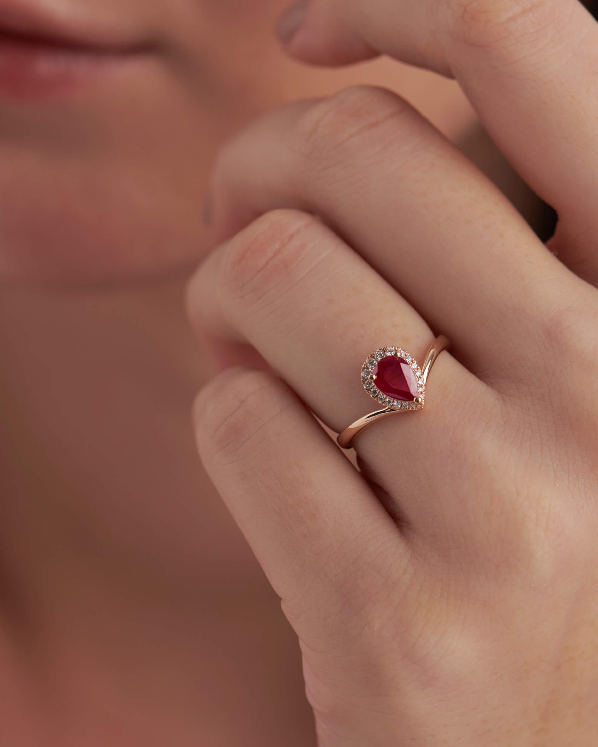 Pear-Shaped Ruby & Diamond Halo Chevron Ring