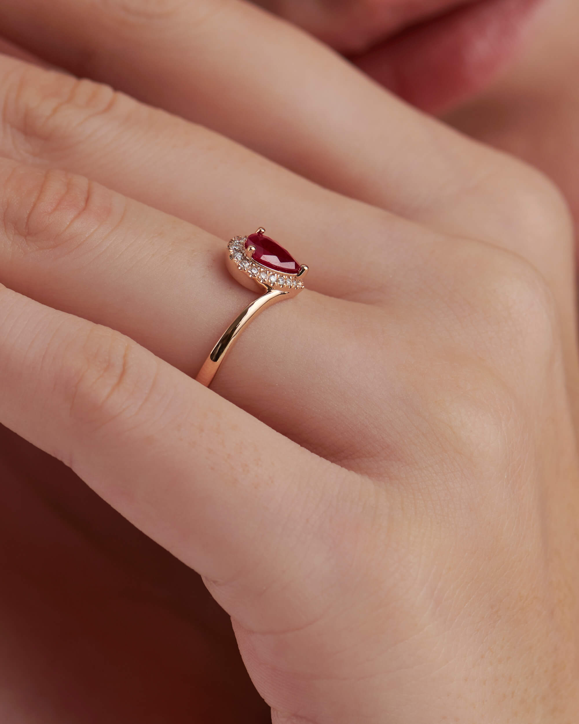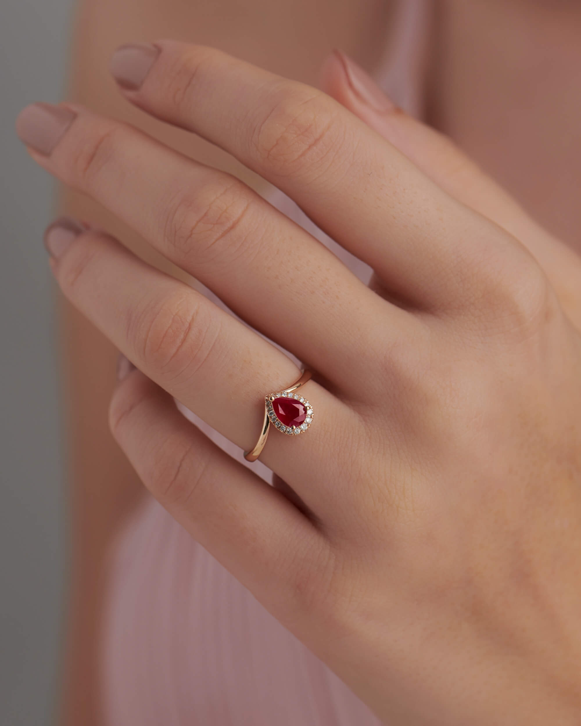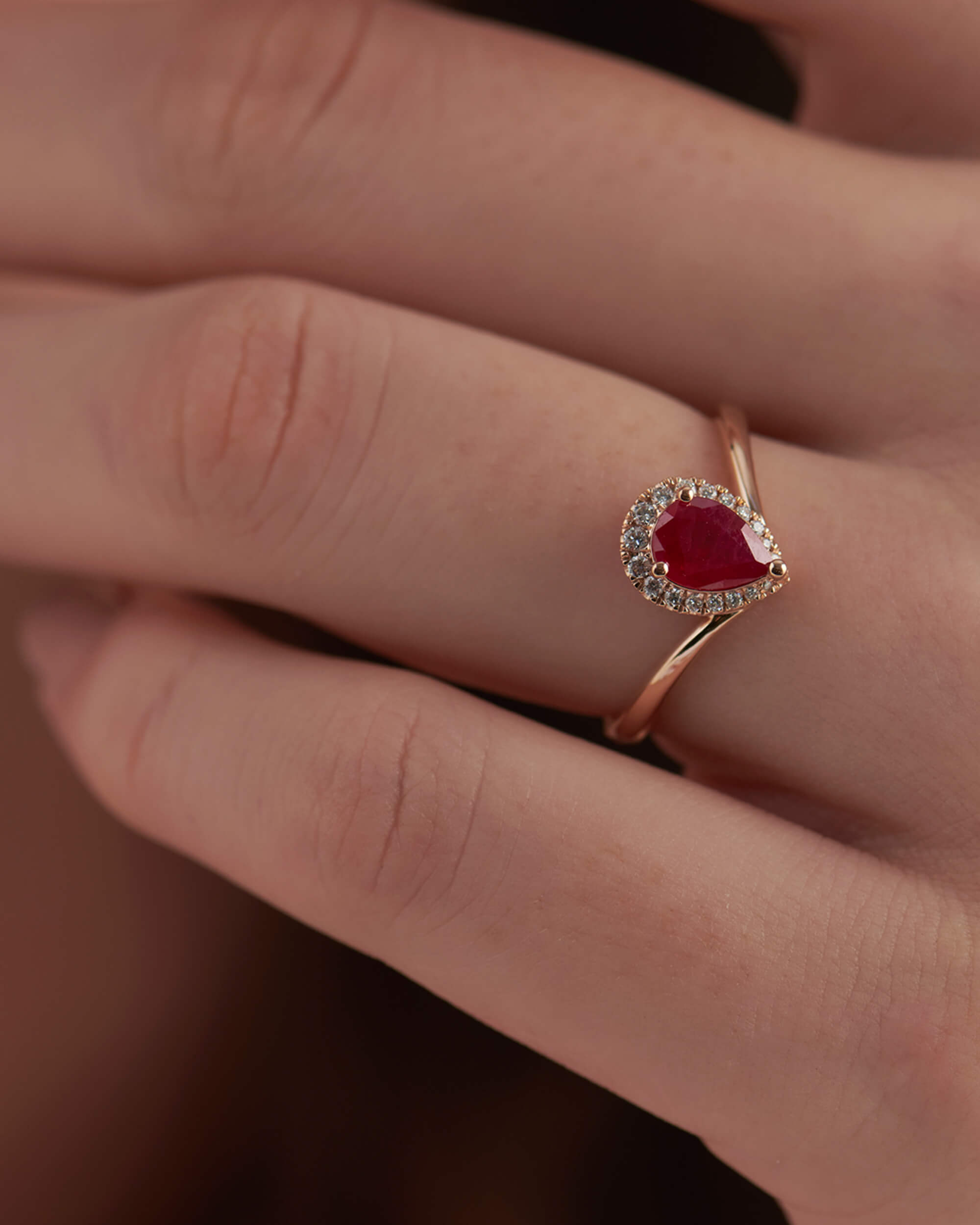 Pear-Shaped Ruby & Diamond Halo Chevron Ring