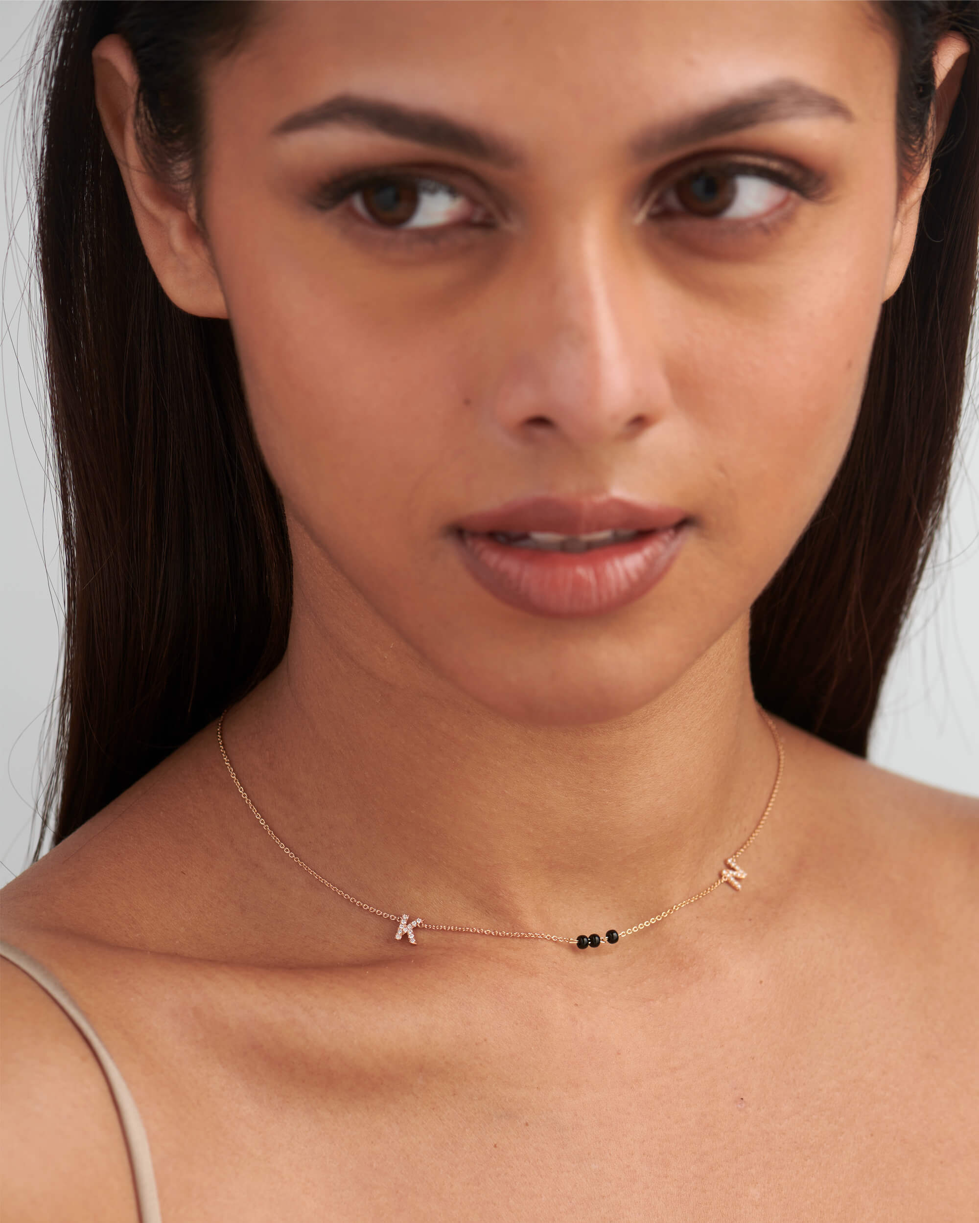 Choose your preferred length, gold colour and the letters. Each 6mm (H) x 5mm (W) letter is handcrafted in solid gold and pave set diamonds, assembled using the cable chain and is stationed at a distance of 1.25” on either sides on the black beads.