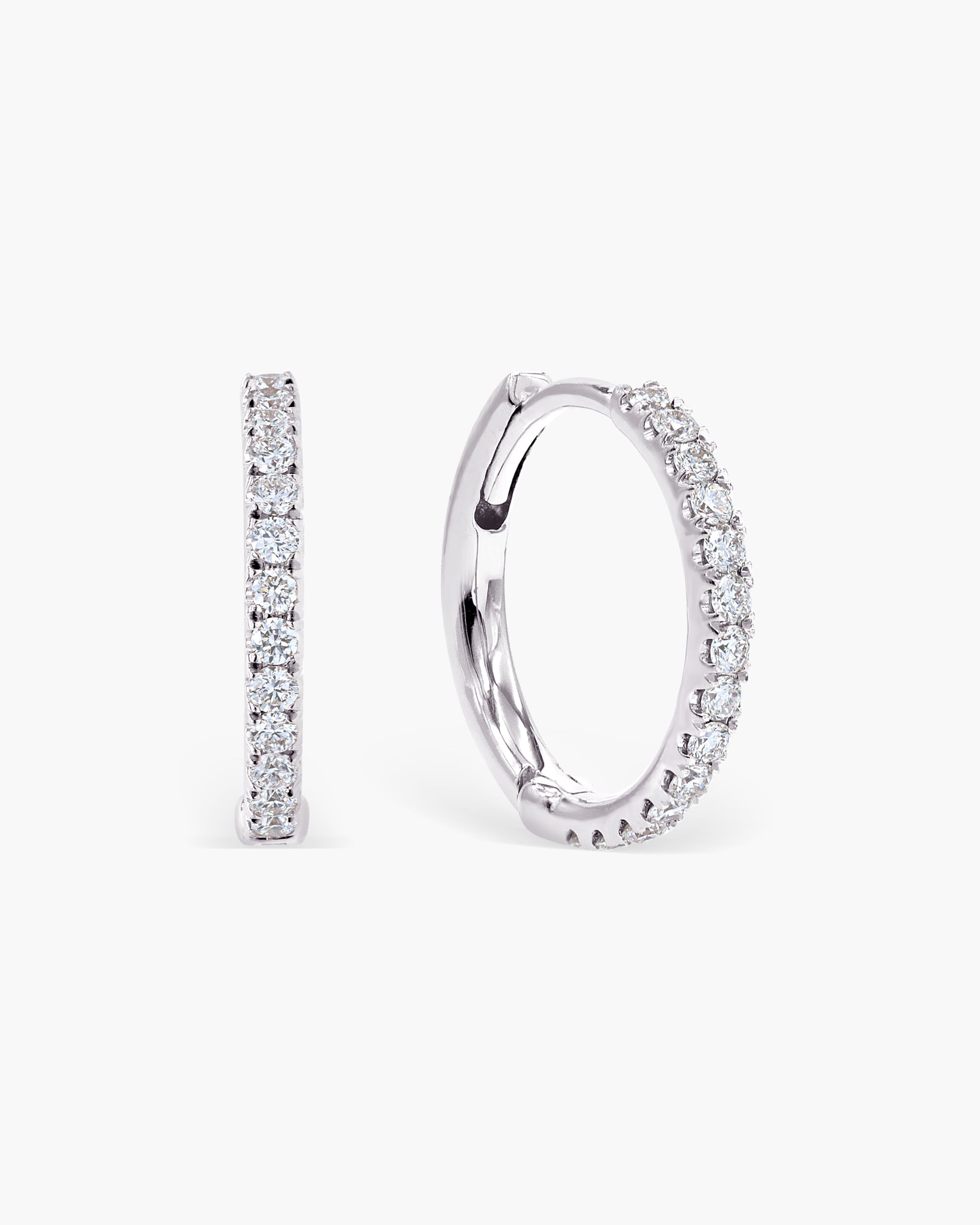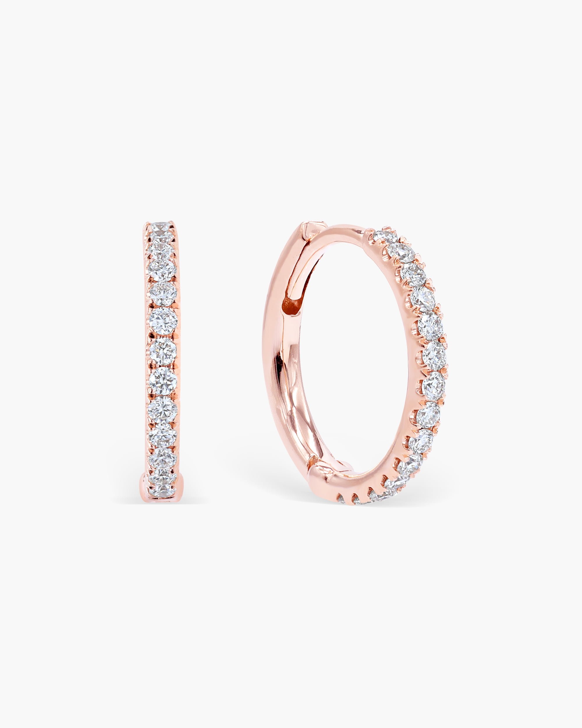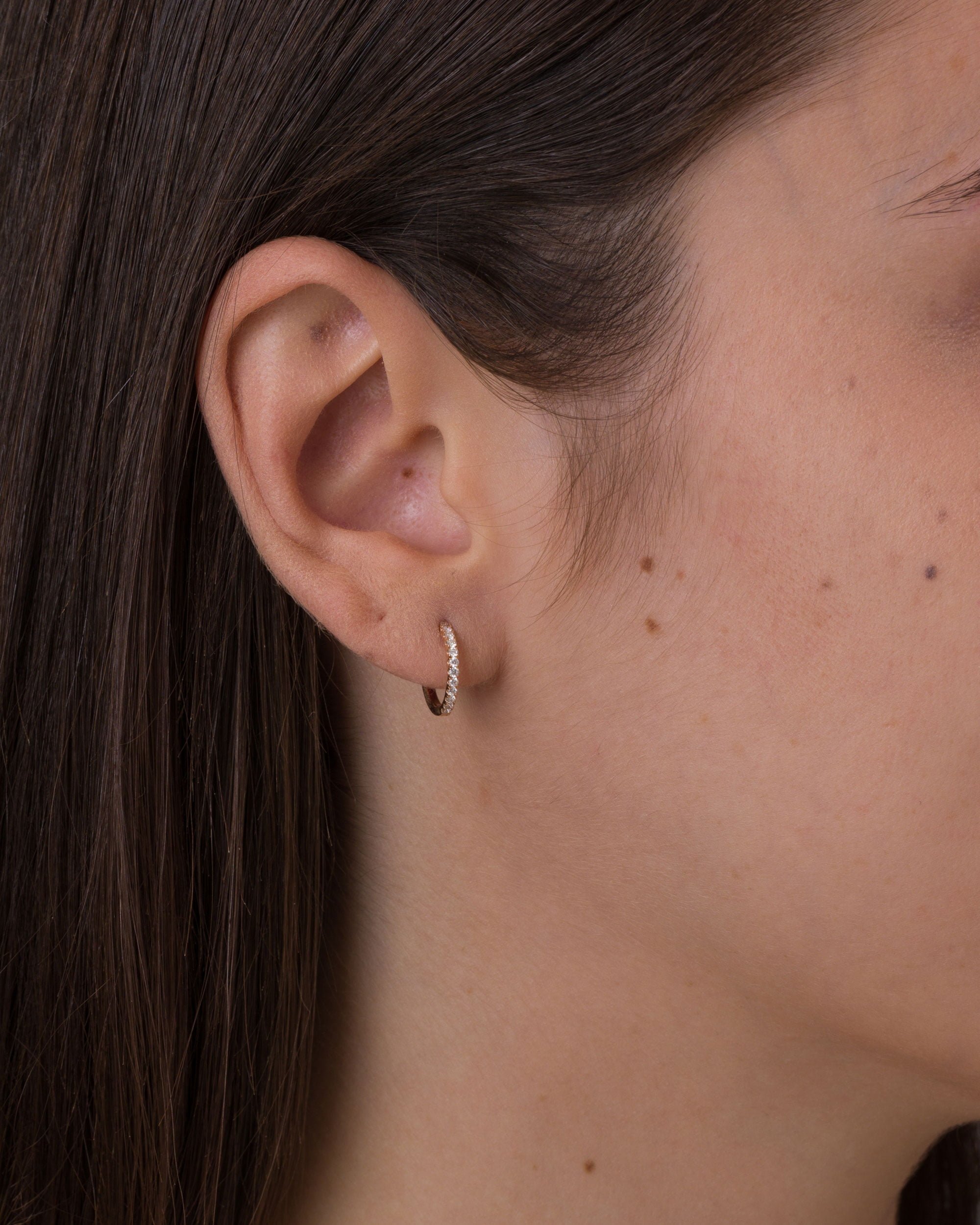 These round brilliant-cut pavé diamond hoop earrings are elegant and understated; what more could you possibly want from an earring! Handcrafted in Solid Gold, perfect for office or outing or simply to be worn regularly. Designed to stack from lobe to helix, a true jewelry staple piece to be cherished for years to come.