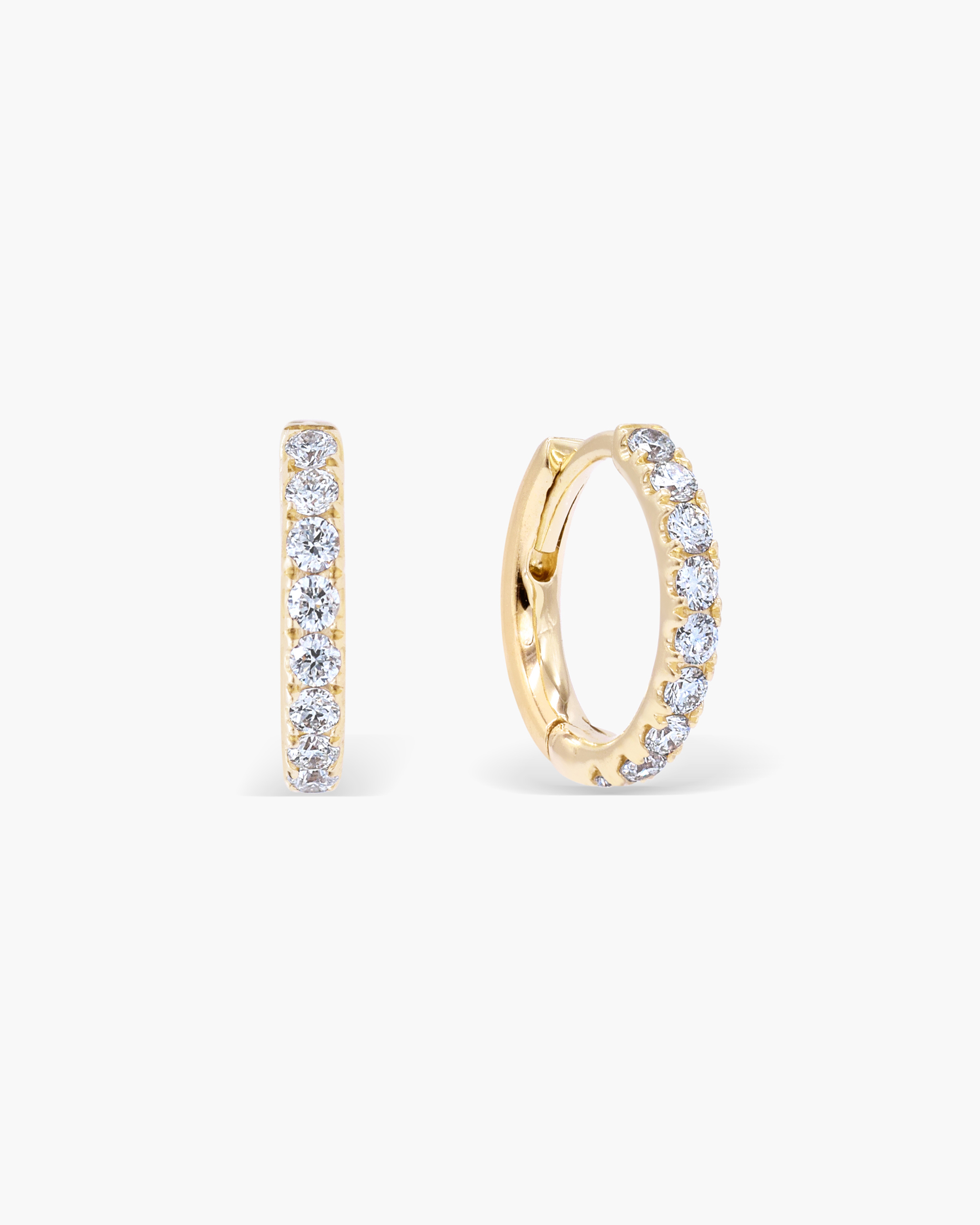 These round brilliant-cut pavé diamond hoop earrings are elegant and understated; what more could you possibly want from an earring! Handcrafted in Solid Gold, perfect for office or outing or simply to be worn regularly. Designed to stack from lobe to helix, a true jewelry staple piece to be cherished for years to come.