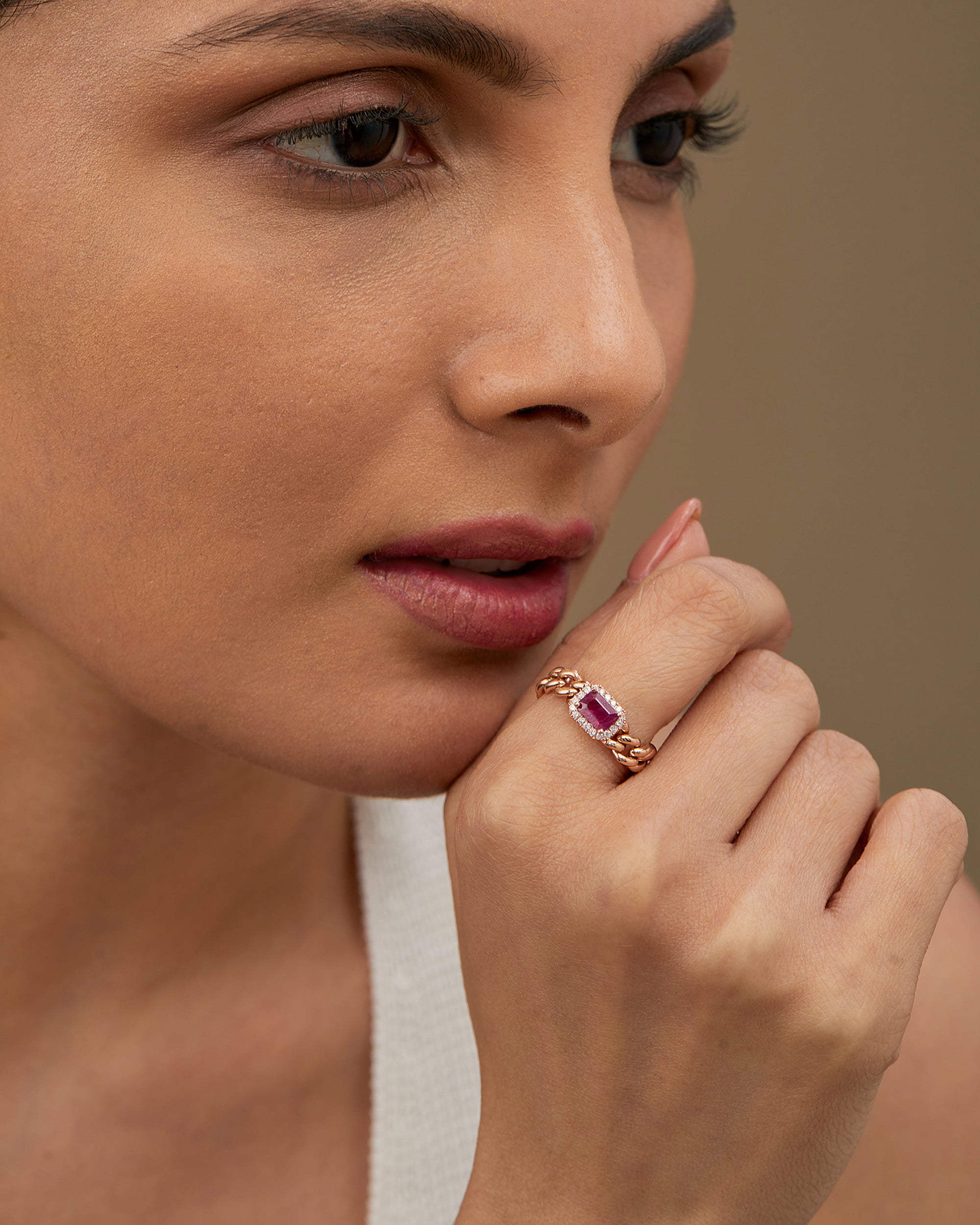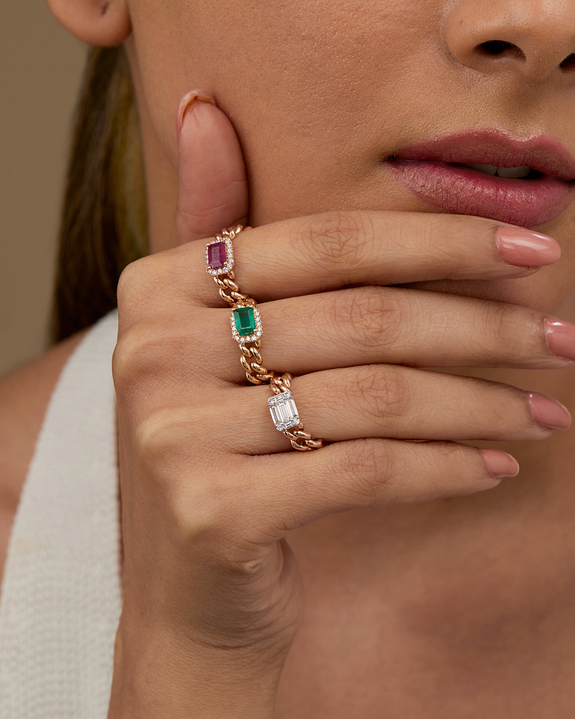 This Rectangular Ruby Cuban Chain Ring features an eye-catching emerald cut red natural ruby (weighs approximate half carat)) with shimmering pave diamond halo, set into a chic Cuban chain design made from flexible links.