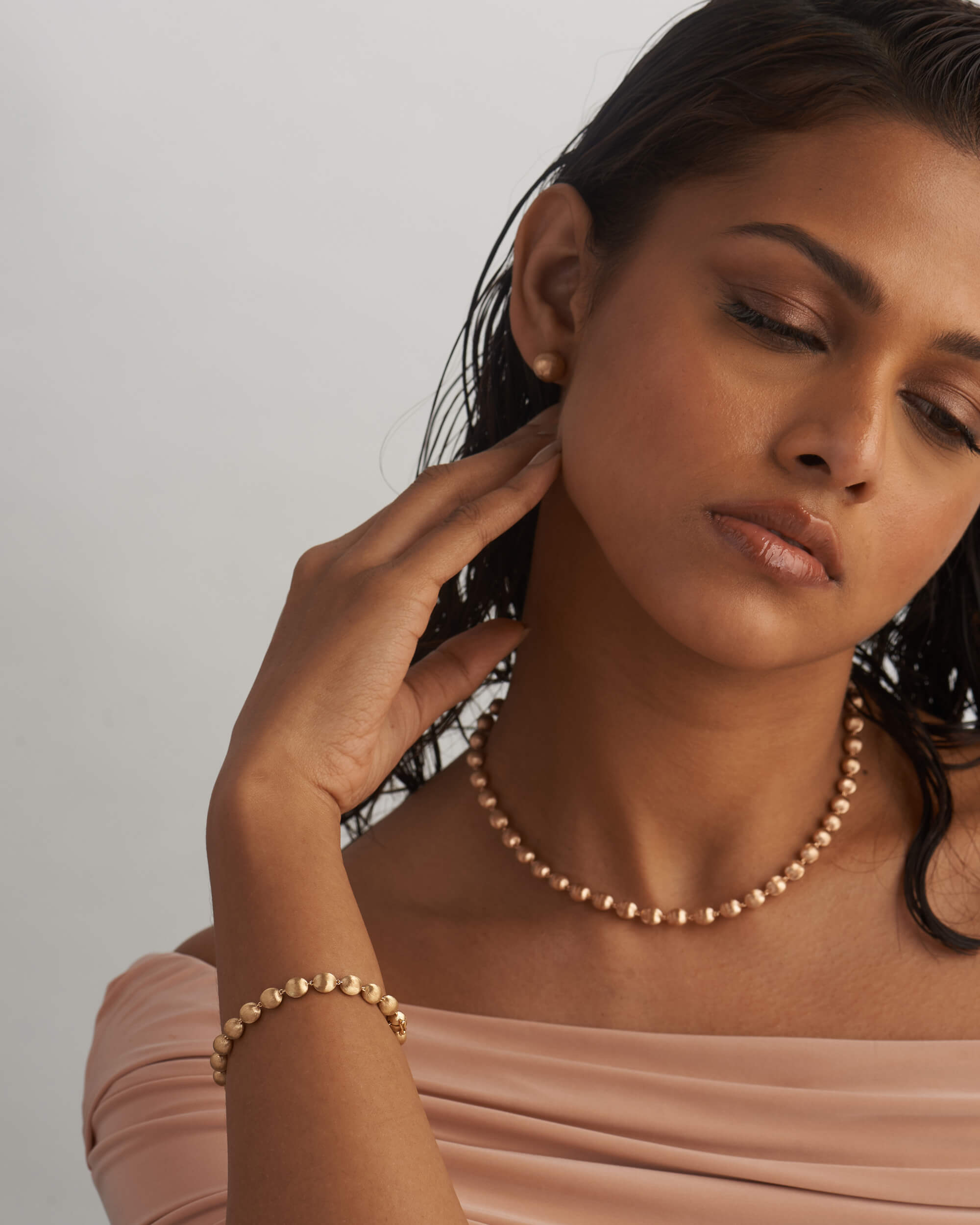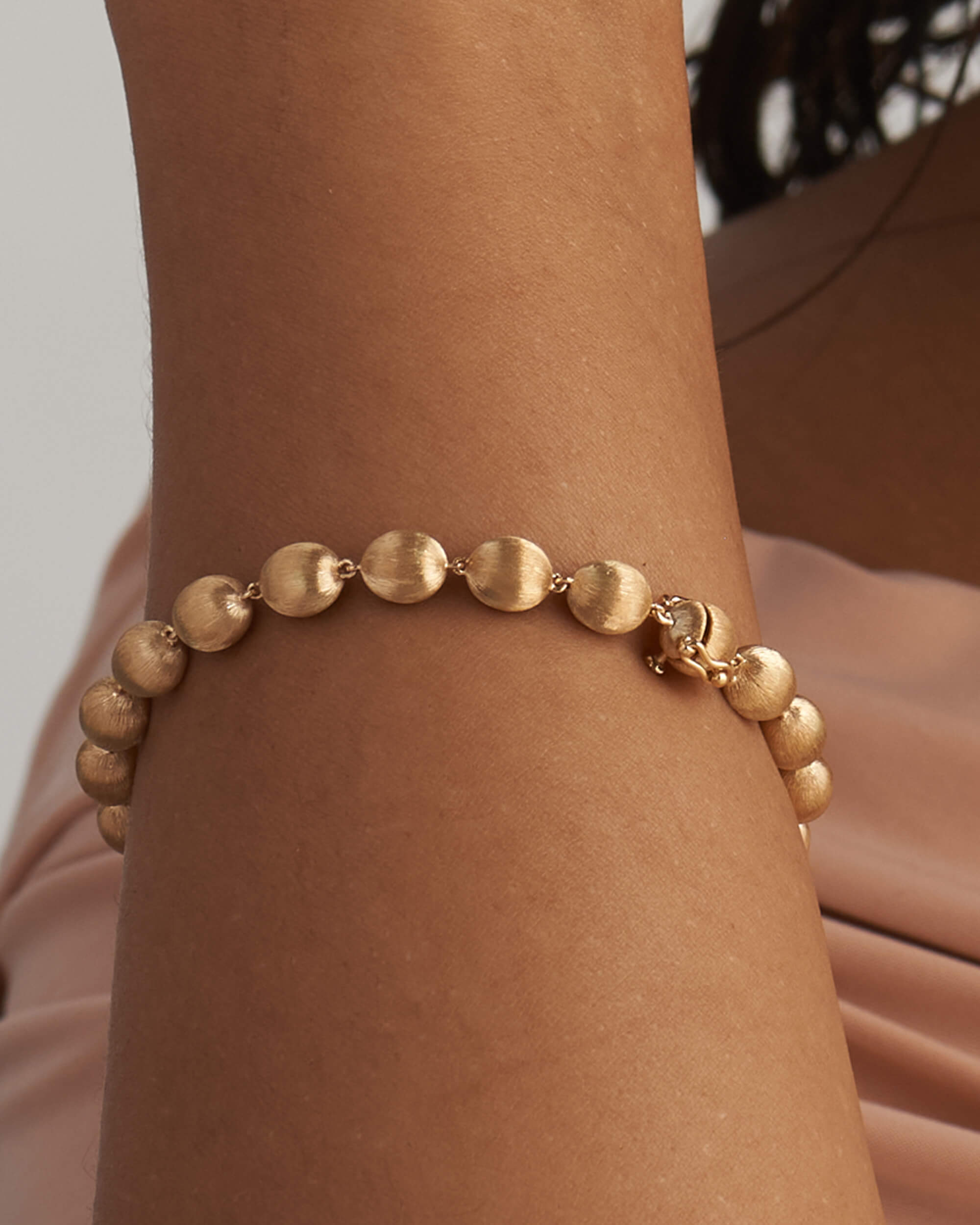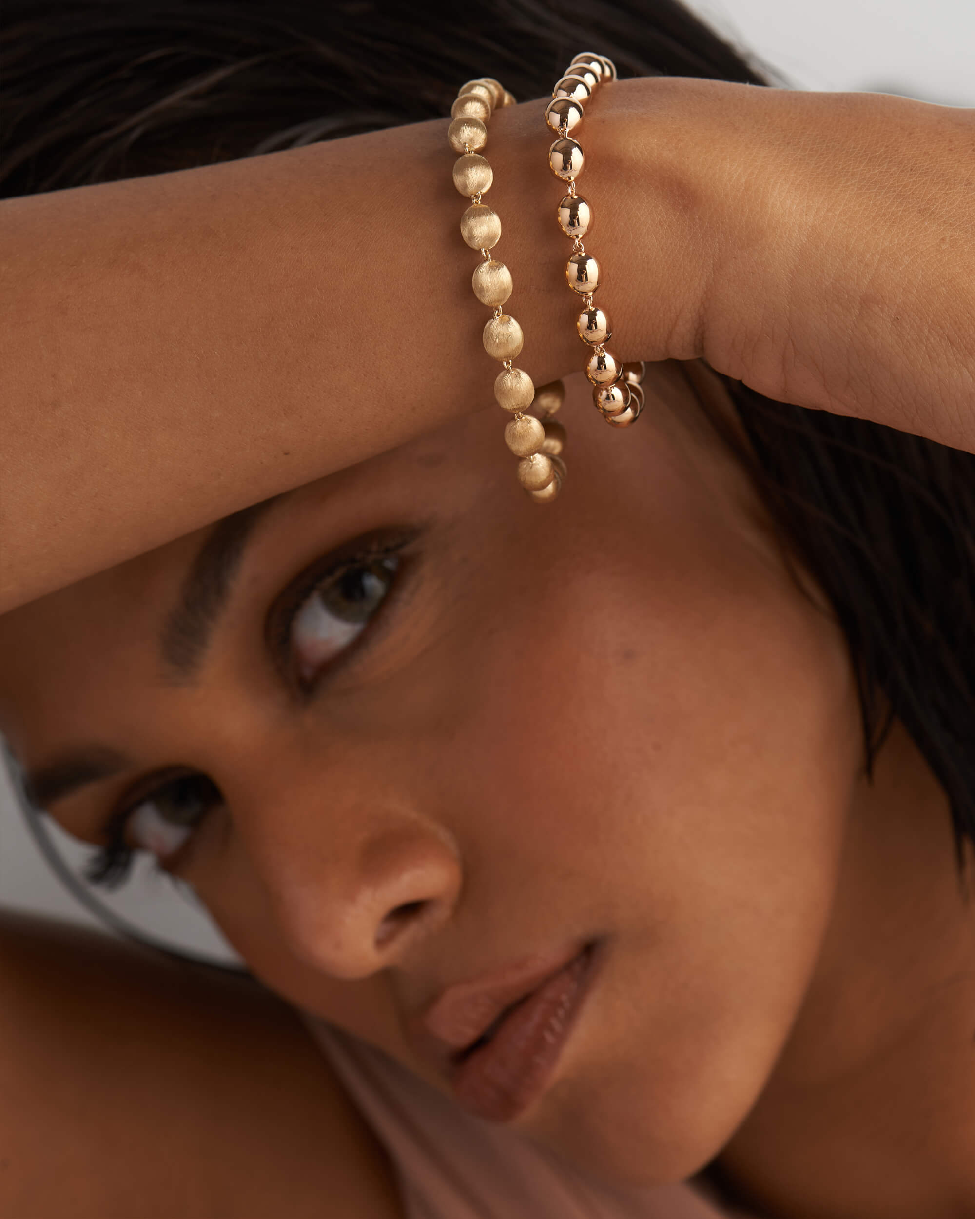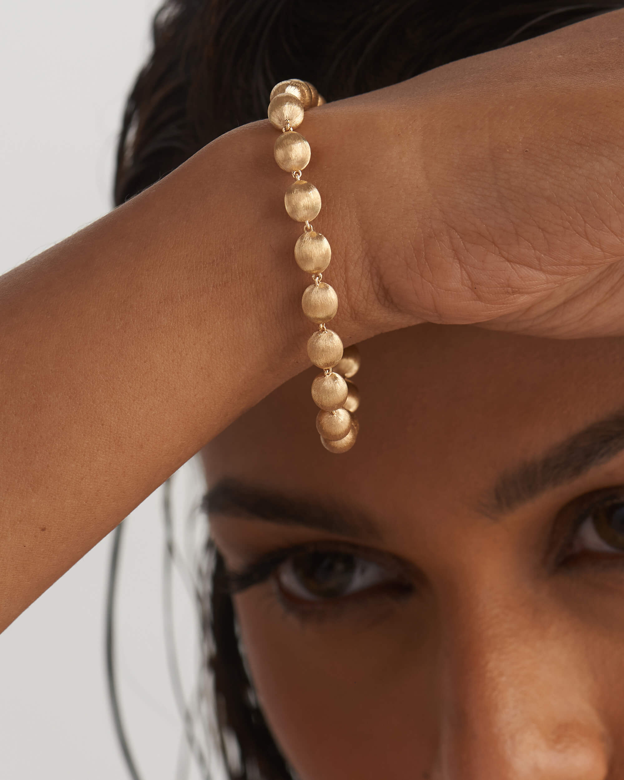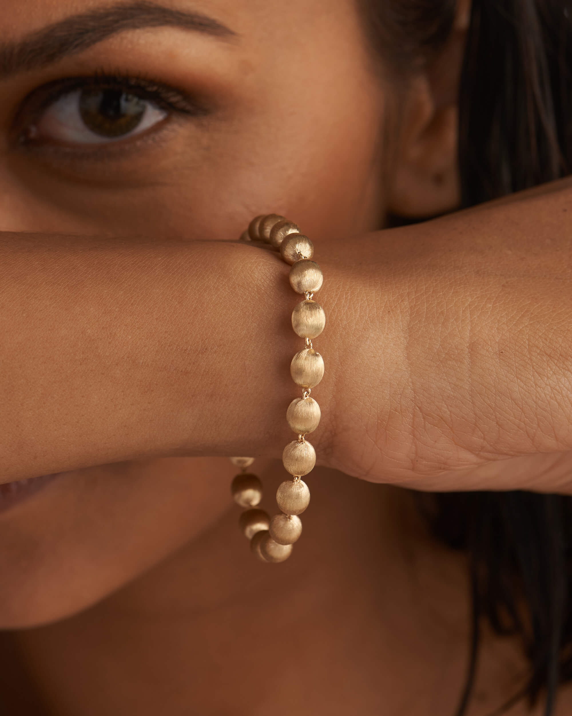 Wrap your wrist in this Silk Gold Beaded Bracelet or stack it up with your other bracelets or watch. A string of gold oval beads each of size 7*6mm, casted to perfection and finished with brushed silk finish. This bracelet secures with box clasp.