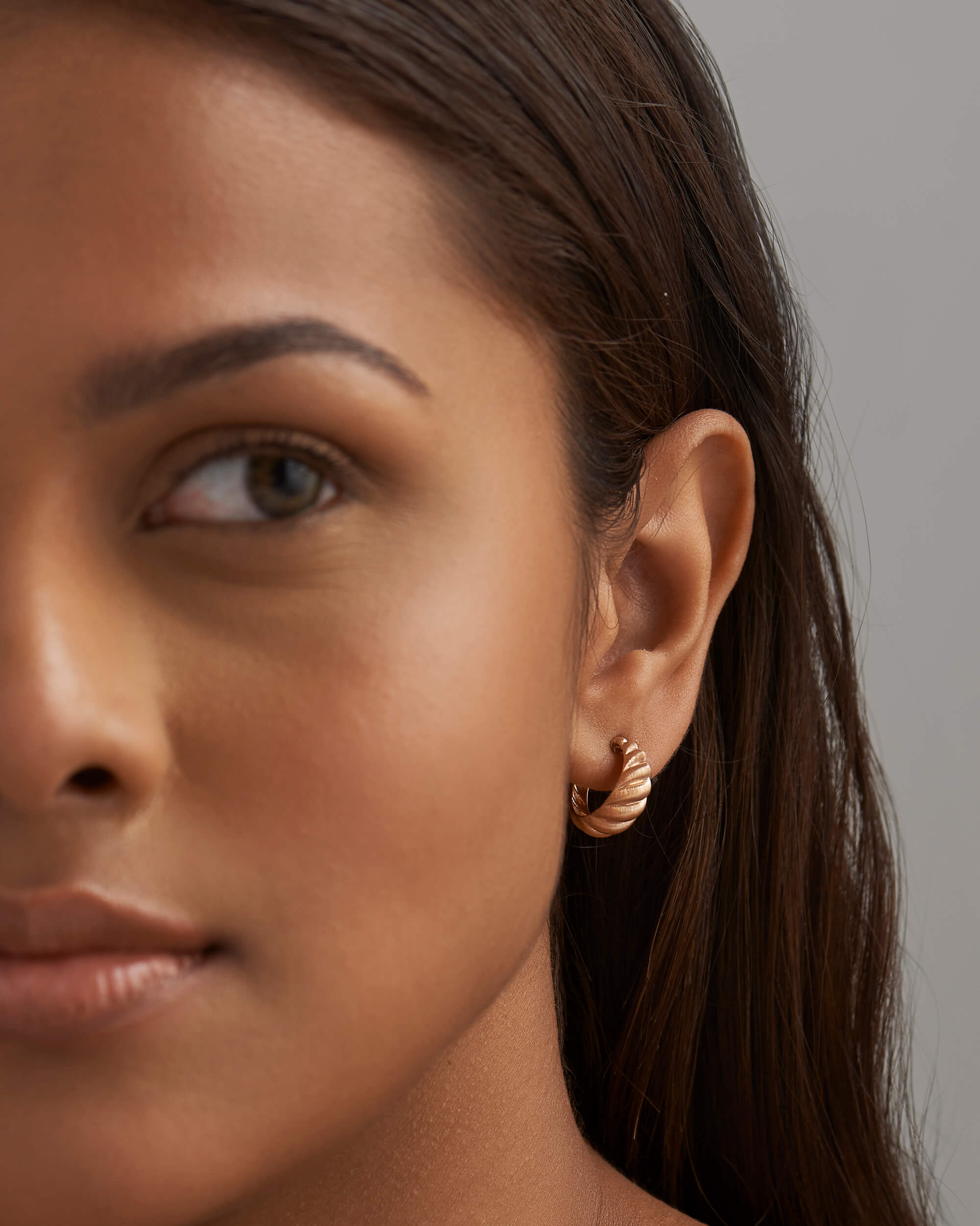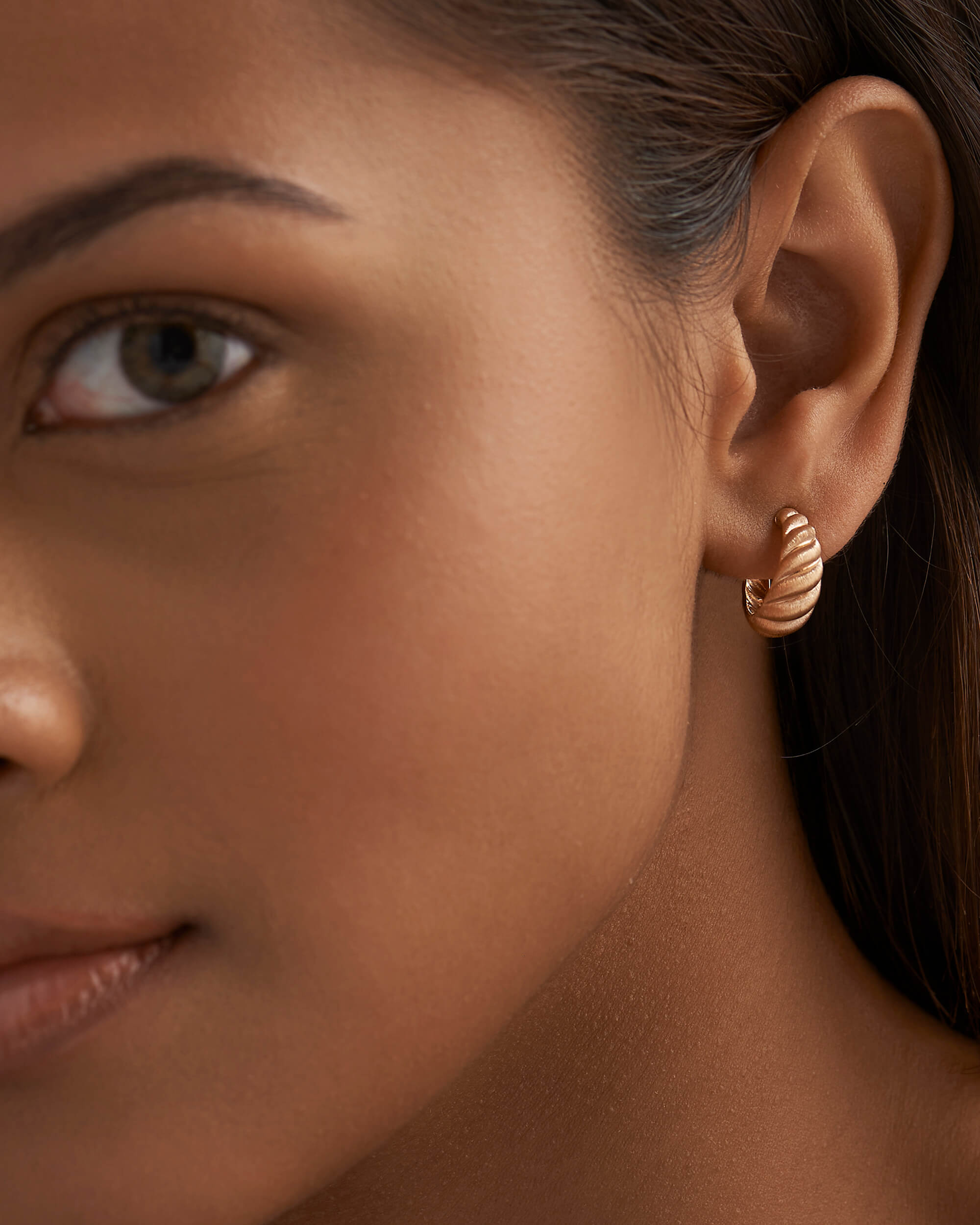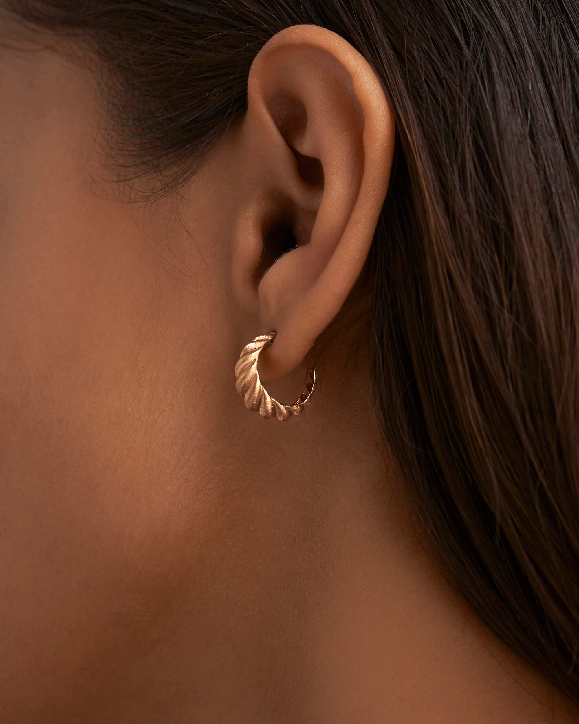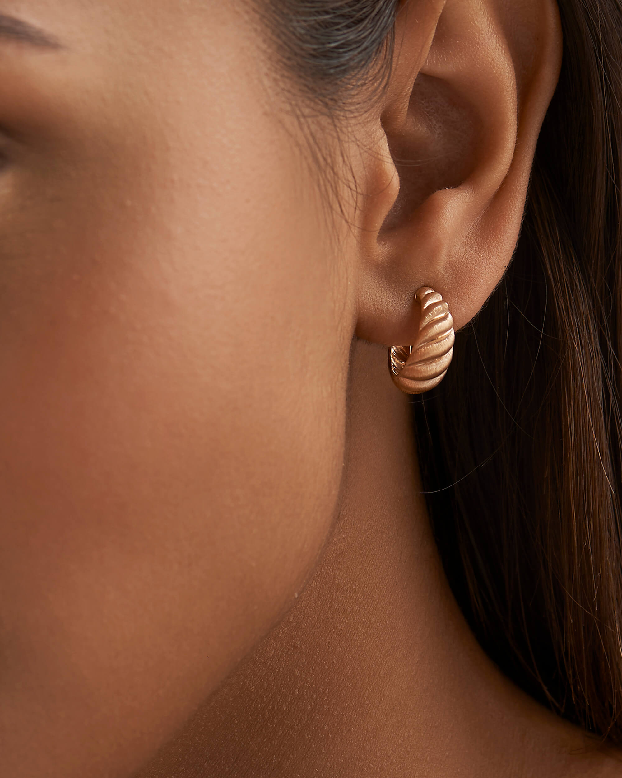 These Silk Gold Croissant Hoops will look beautifully worn alone as a statement piece or to amp up up your ear stack. Handcrafted in solid gold and features twisted swirls with brushed silk finish. Lightweight and comfortable for everyday. These earrings are secured with a threaded post and nut.