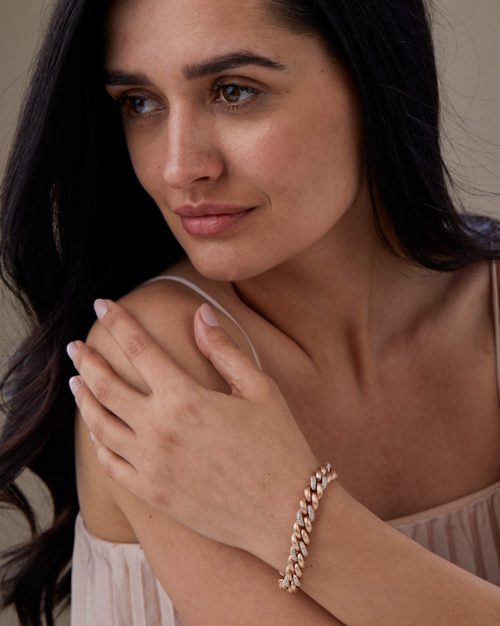 Silk Gold & Diamond Cuban link bracelet made for those who loves statement. This 10mm wide chic cuban styled chain links is encrusted with sparkling pavé diamonds alternating in between 2 brushed silk finish links. This bracelet secures with a box clasp.