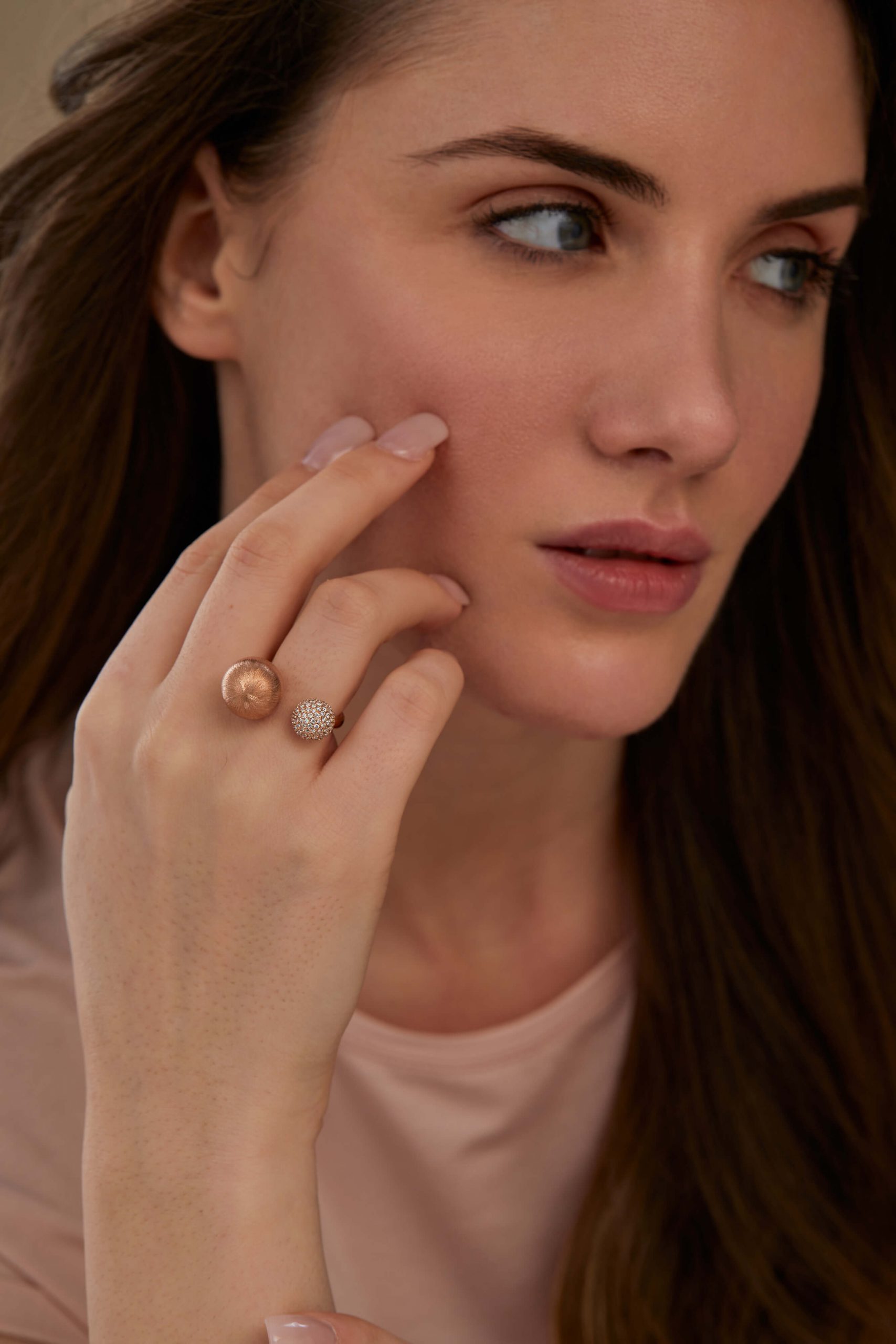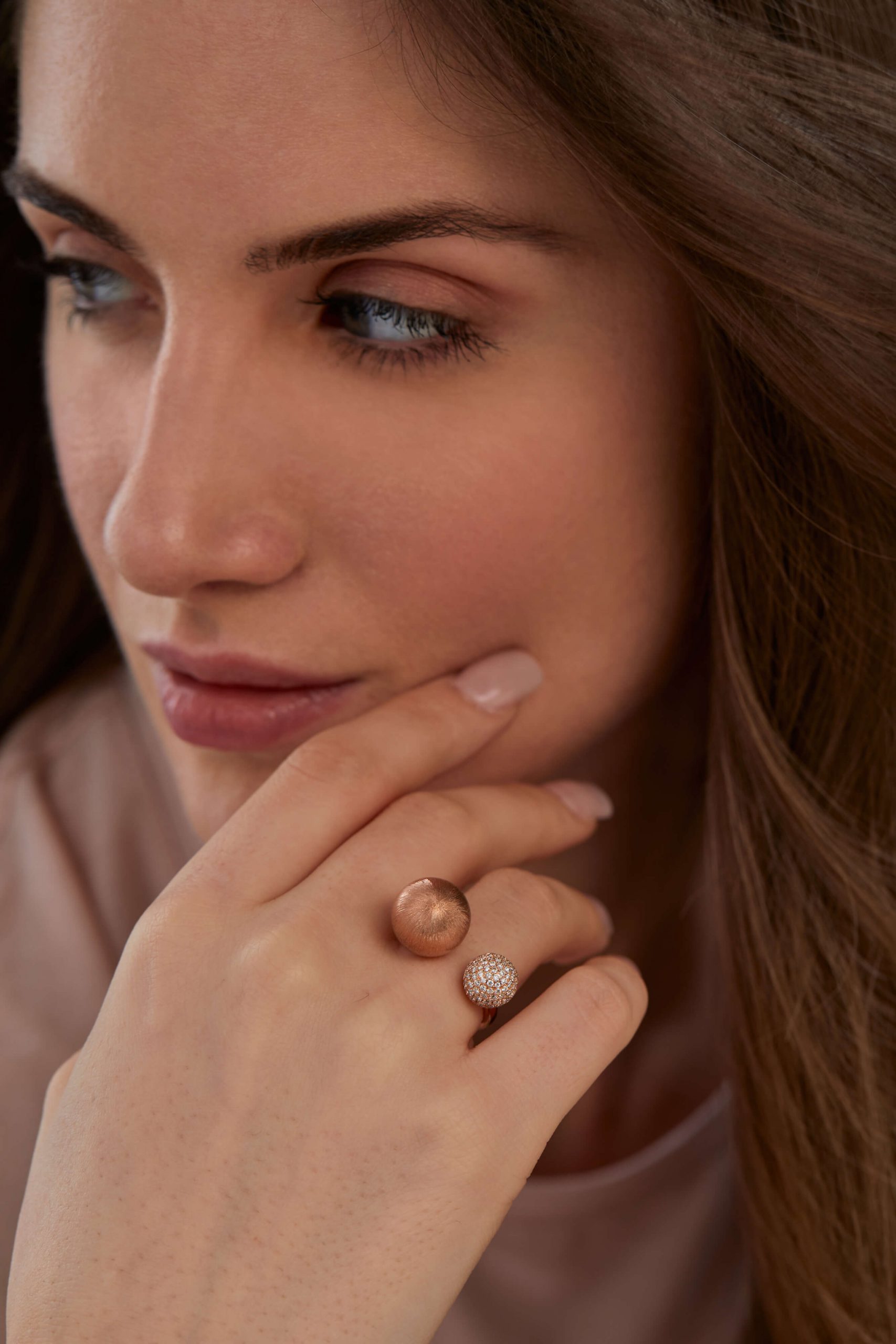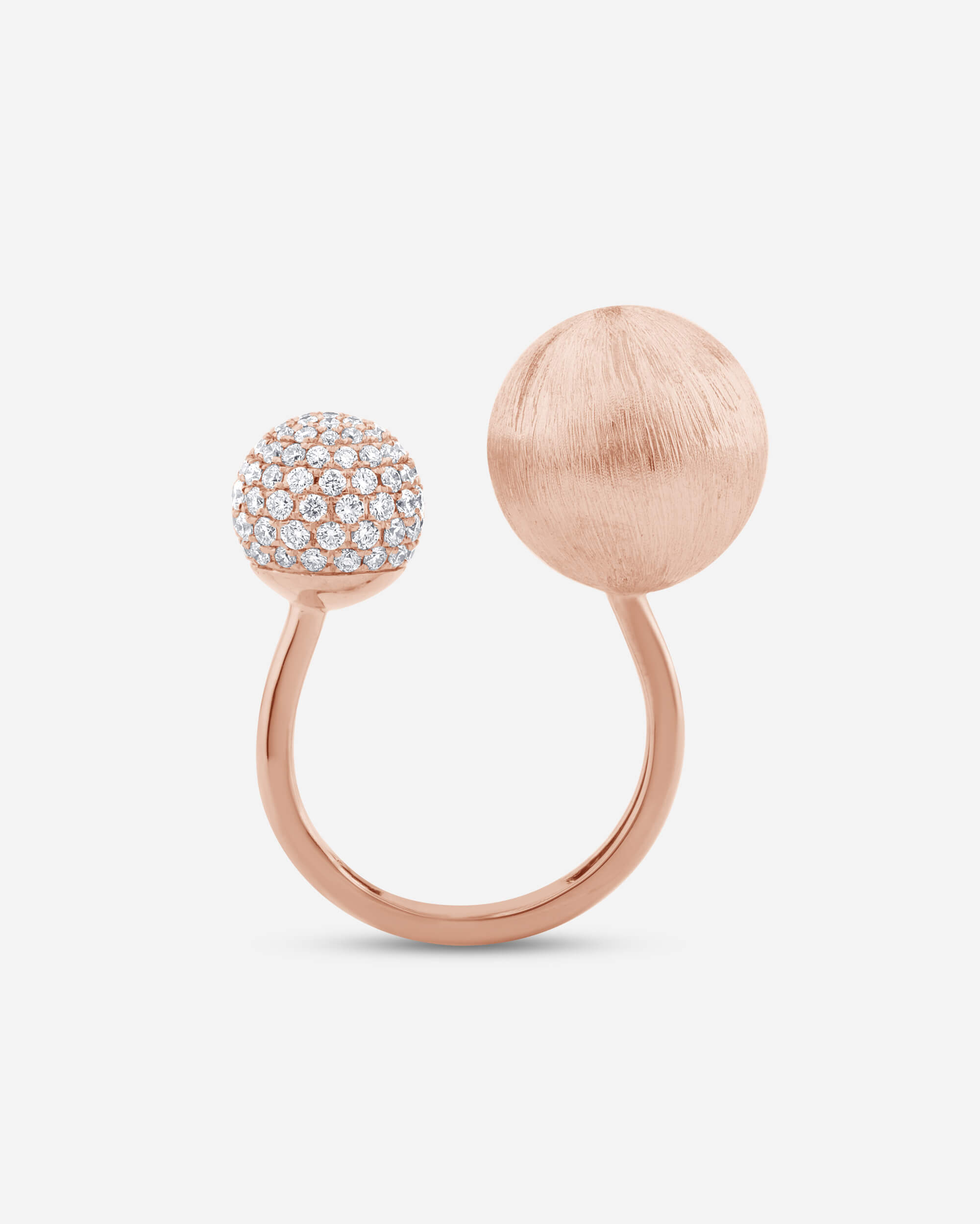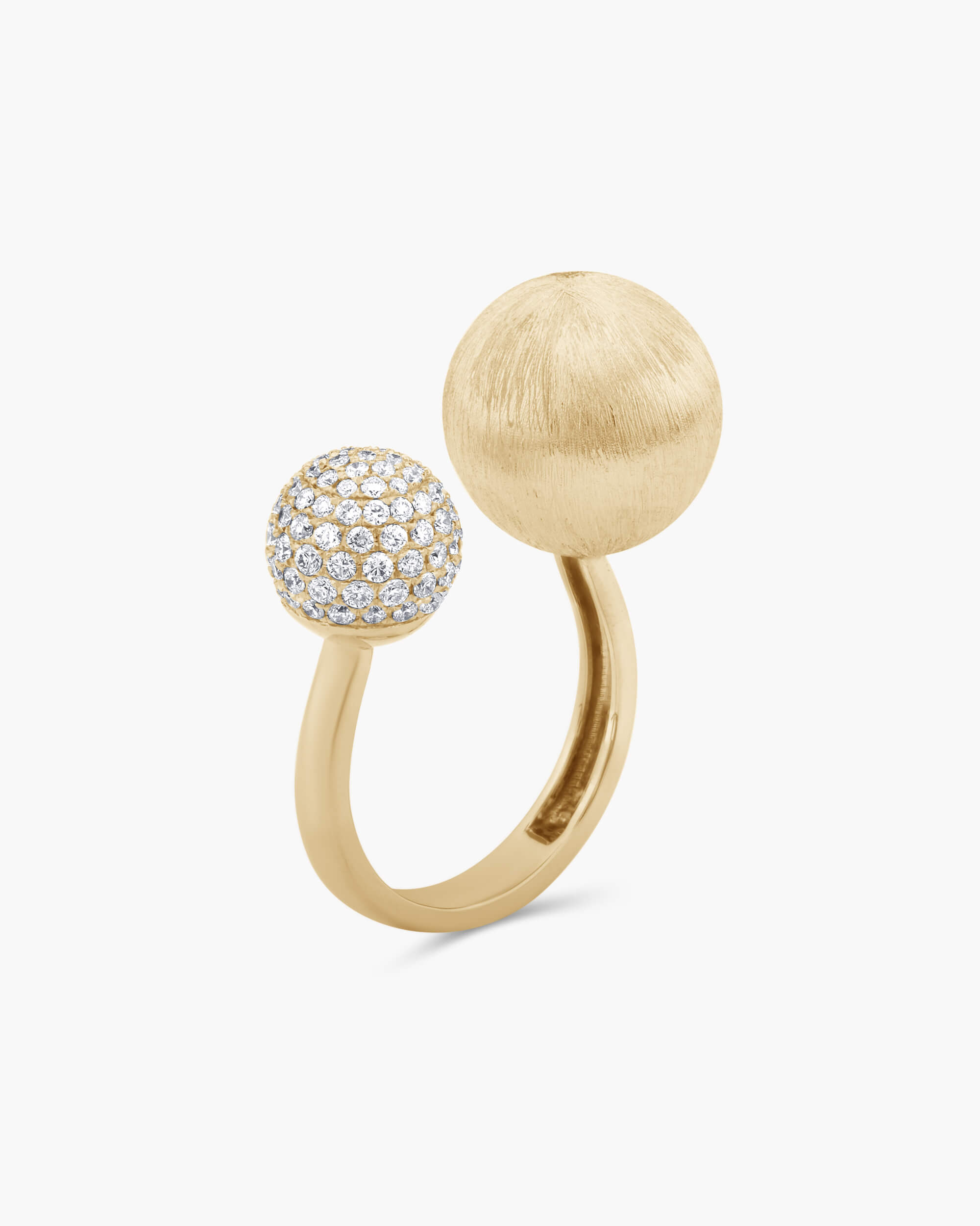 The Silk Gold Open Sphere Duo Ring is fun and whimsical. The larger sphere (13mm) has a brushed silk finish and smaller sphere (9mm) is adorned with pavé set diamonds.