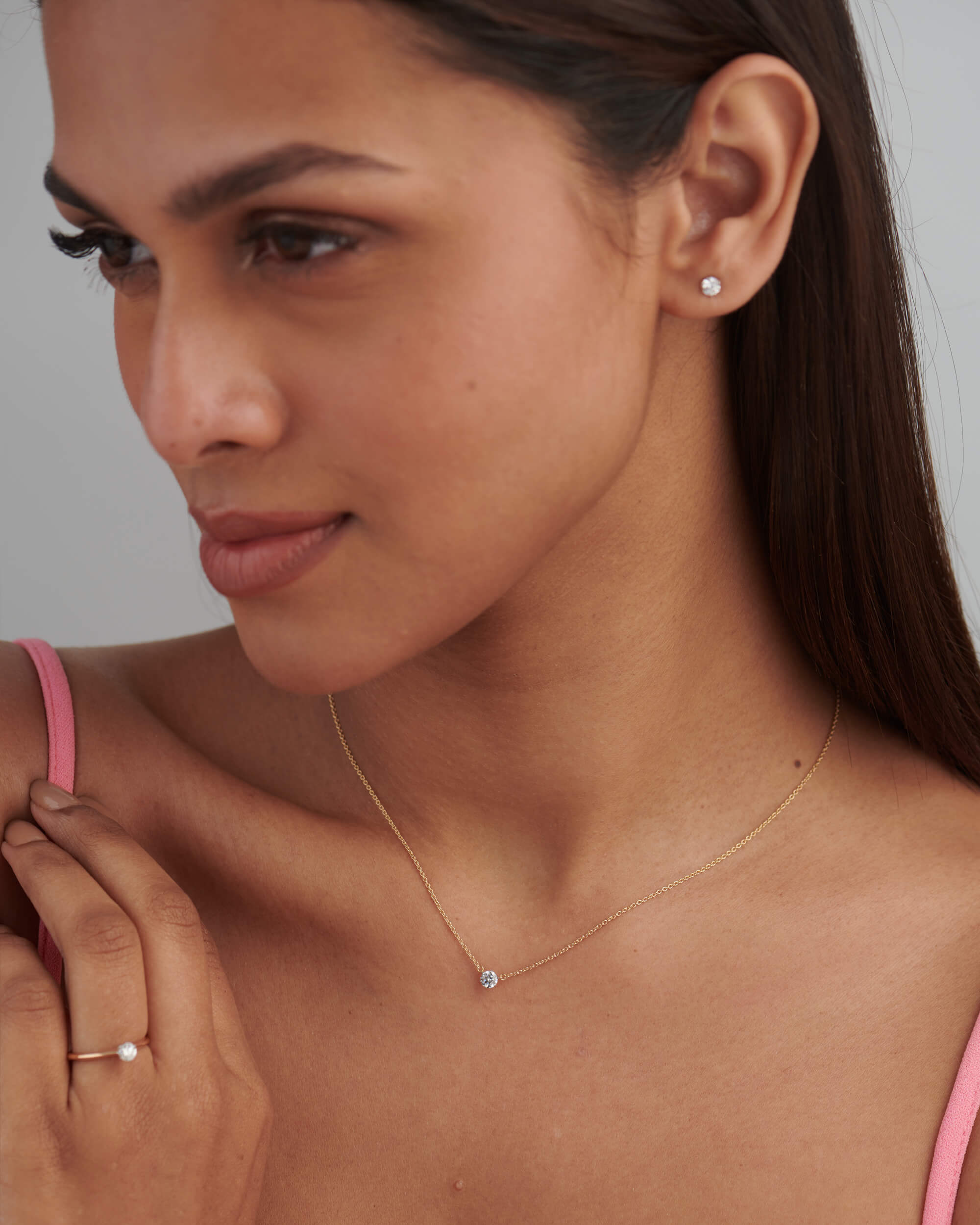 A contemporary touch of sparkle and timeless staple for every women or ideal gift for someone you love. Our Diamond solitaire earrings features a 0.25ct (each) round brilliant cut diamond secured in a claw setting, all set in solid gold.