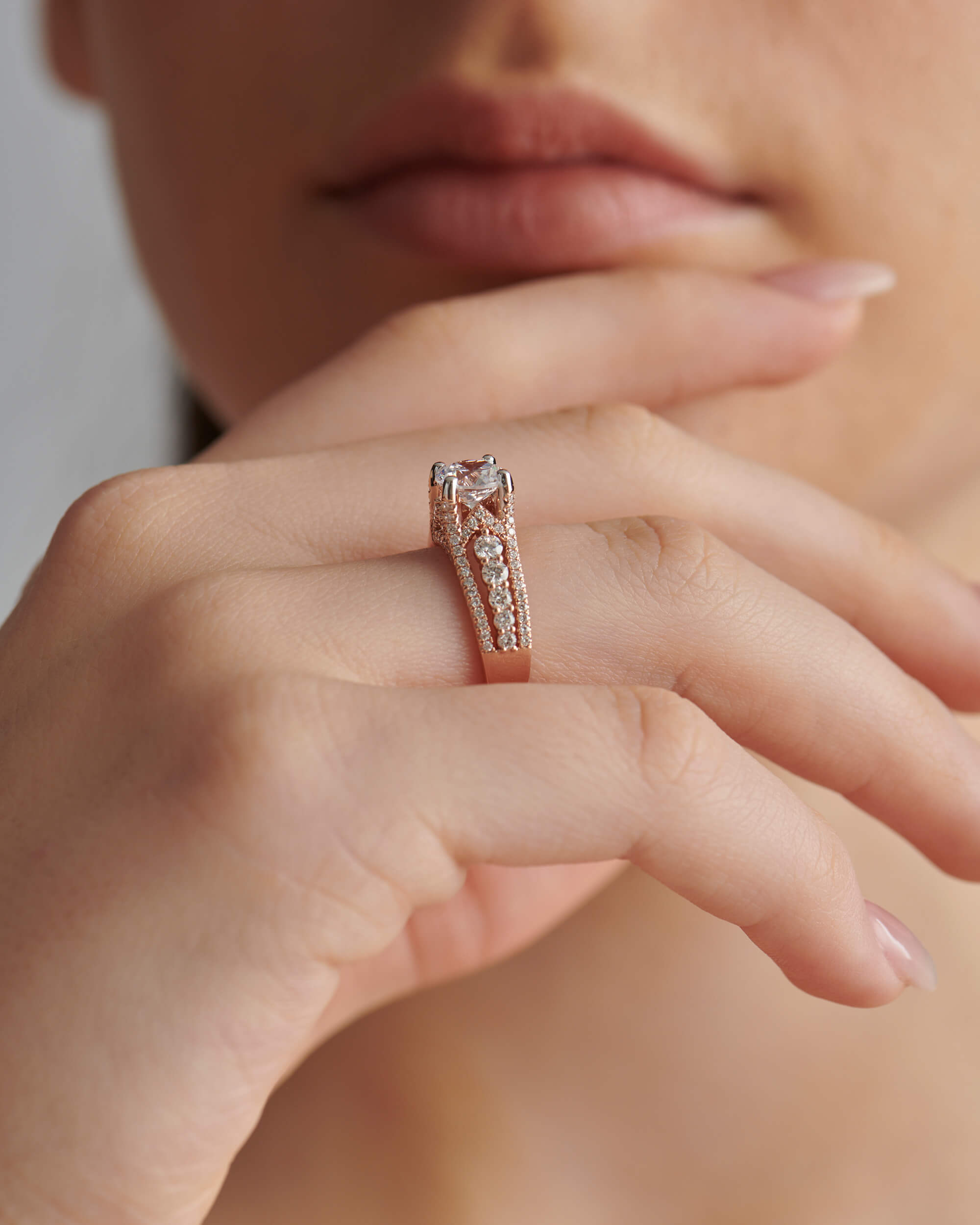 This ring features a brilliant round cut center diamond on four prongs with a band of graduationg prong set & micro-prong set diamonds running down the cathedral shank. The three rows of diamonds add depth and dimension to the band, making it a perfect choice for those looking for a statement piece that exudes sophistication and glamour.