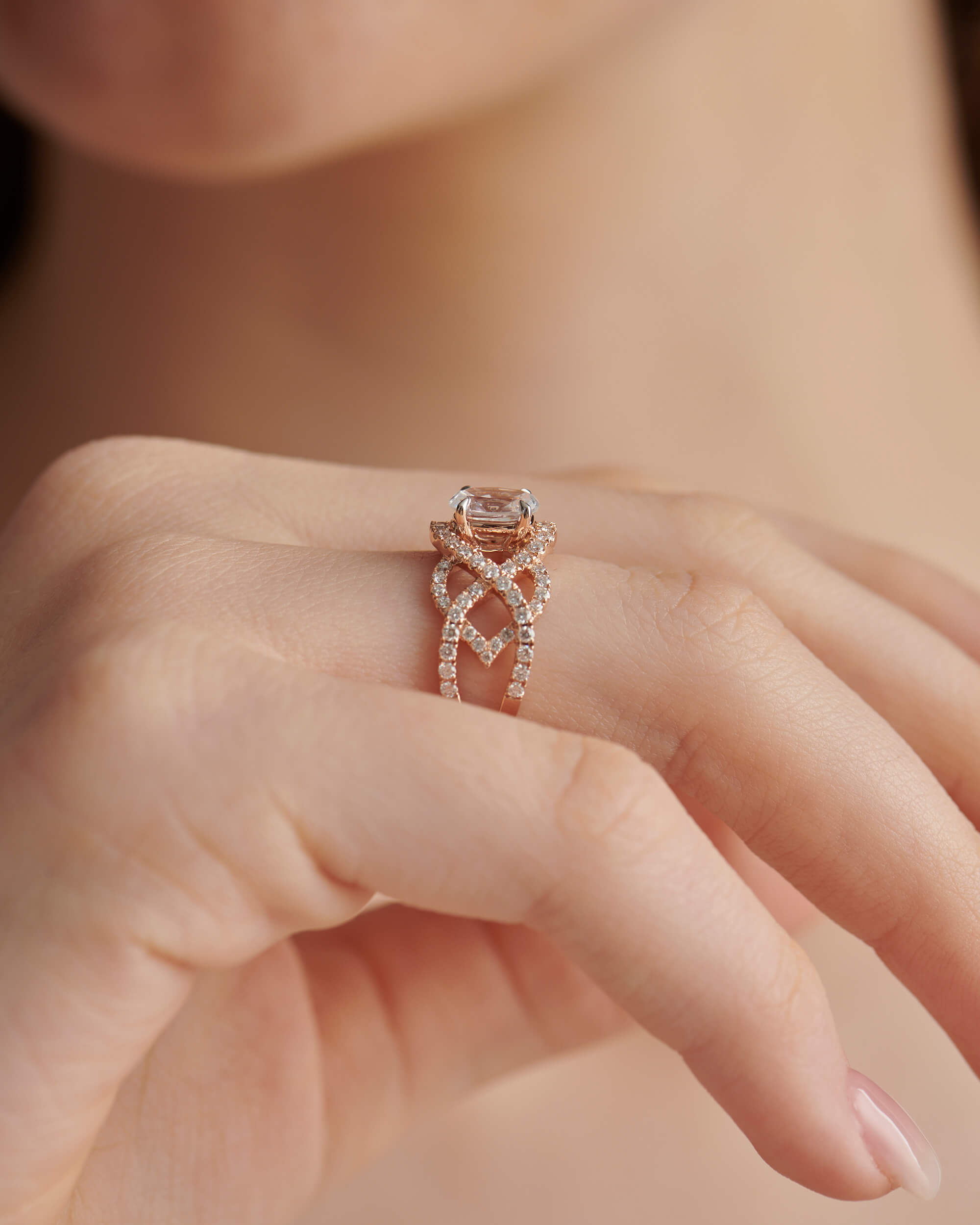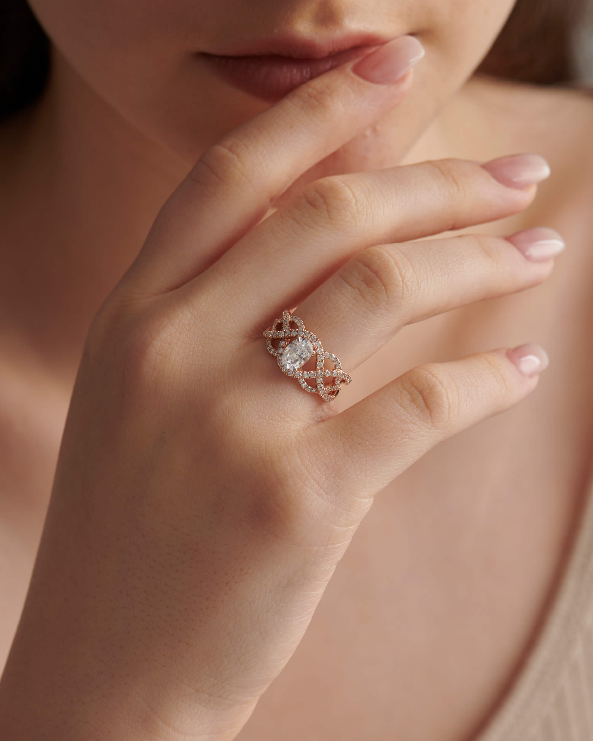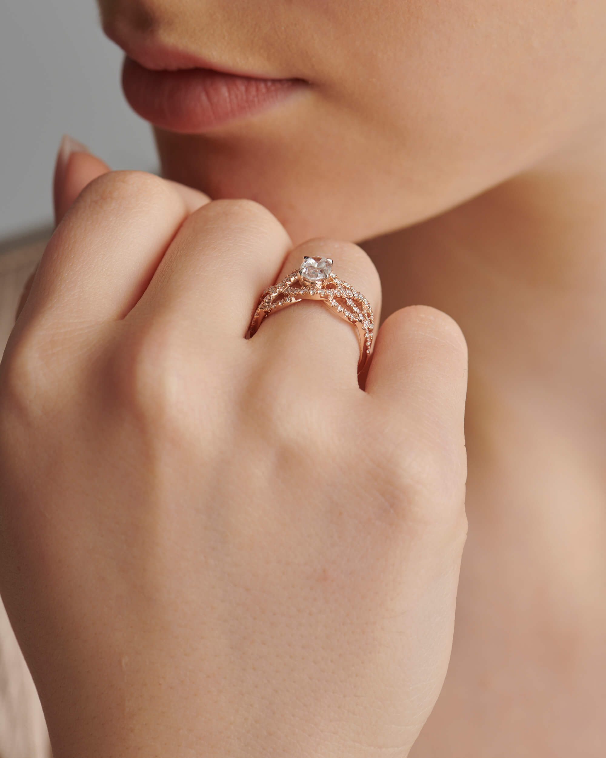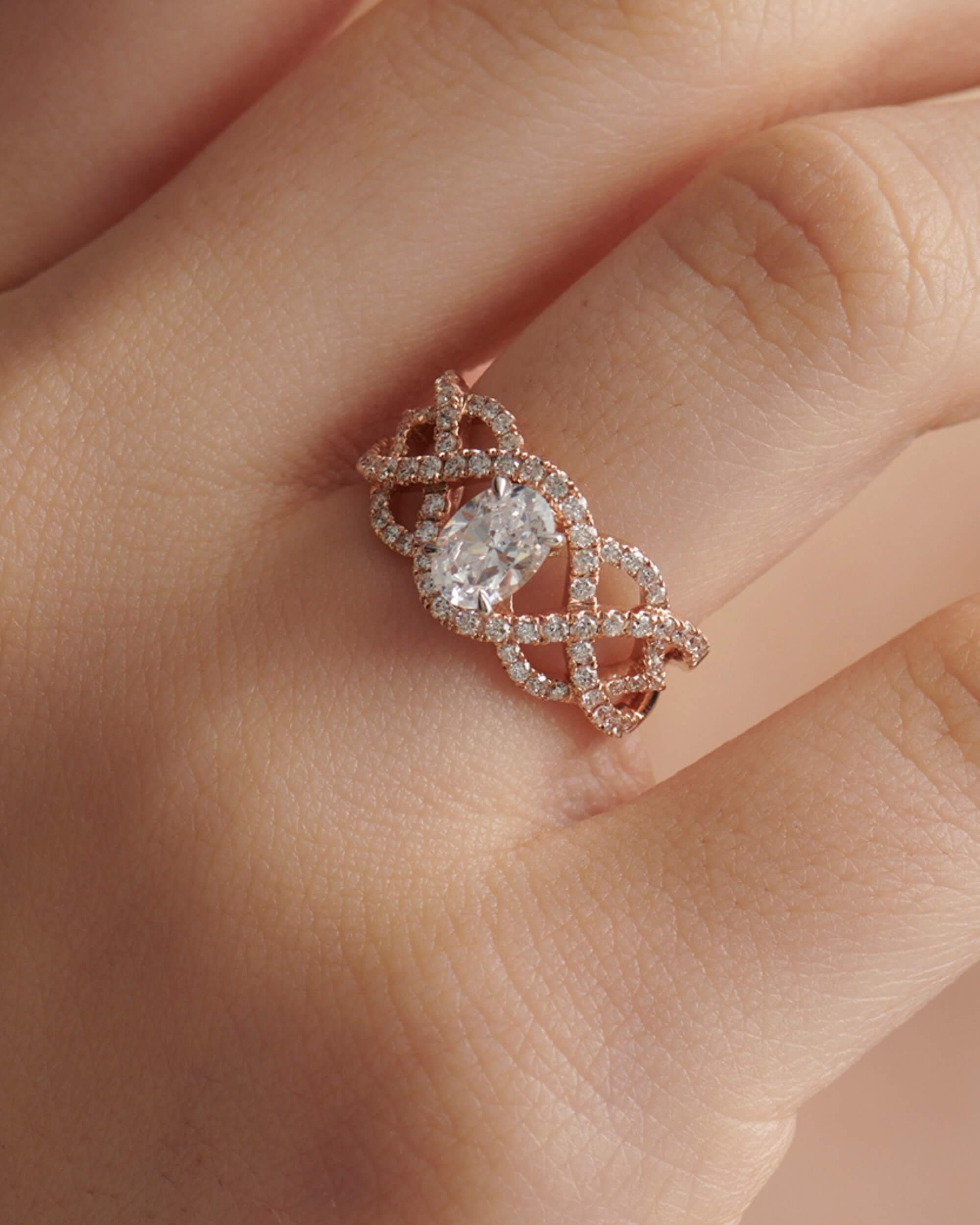 The Weave Diamond Shank, Oval Solitaire Ring features an exquisite shank intricately woven with dazzling diamonds. At the center of this ring shines an oval-cut solitaire in prong setting providing a radiant and enduring finish that beautifully complements the diamond and the intricate weave pattern.