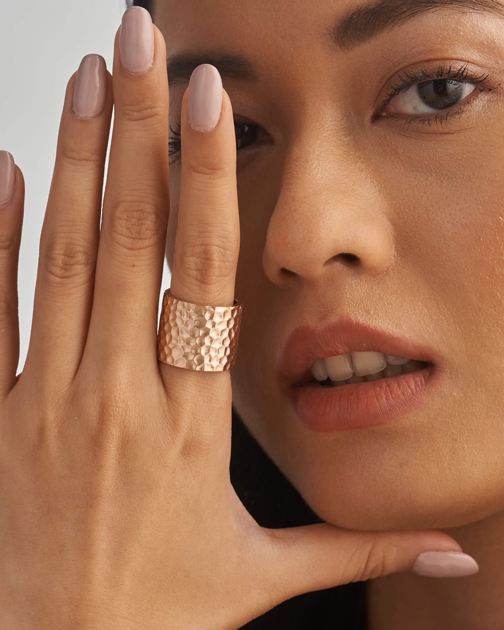 Wear it solo as a statement piece for that extra dose of glam. This Wide Hammered Gold Ring is handcrafted in solid gold and has hammered texture finish to create a bespoke and unique surface. Available in matt or high gloss finish with clean edges and a polished inner side.
